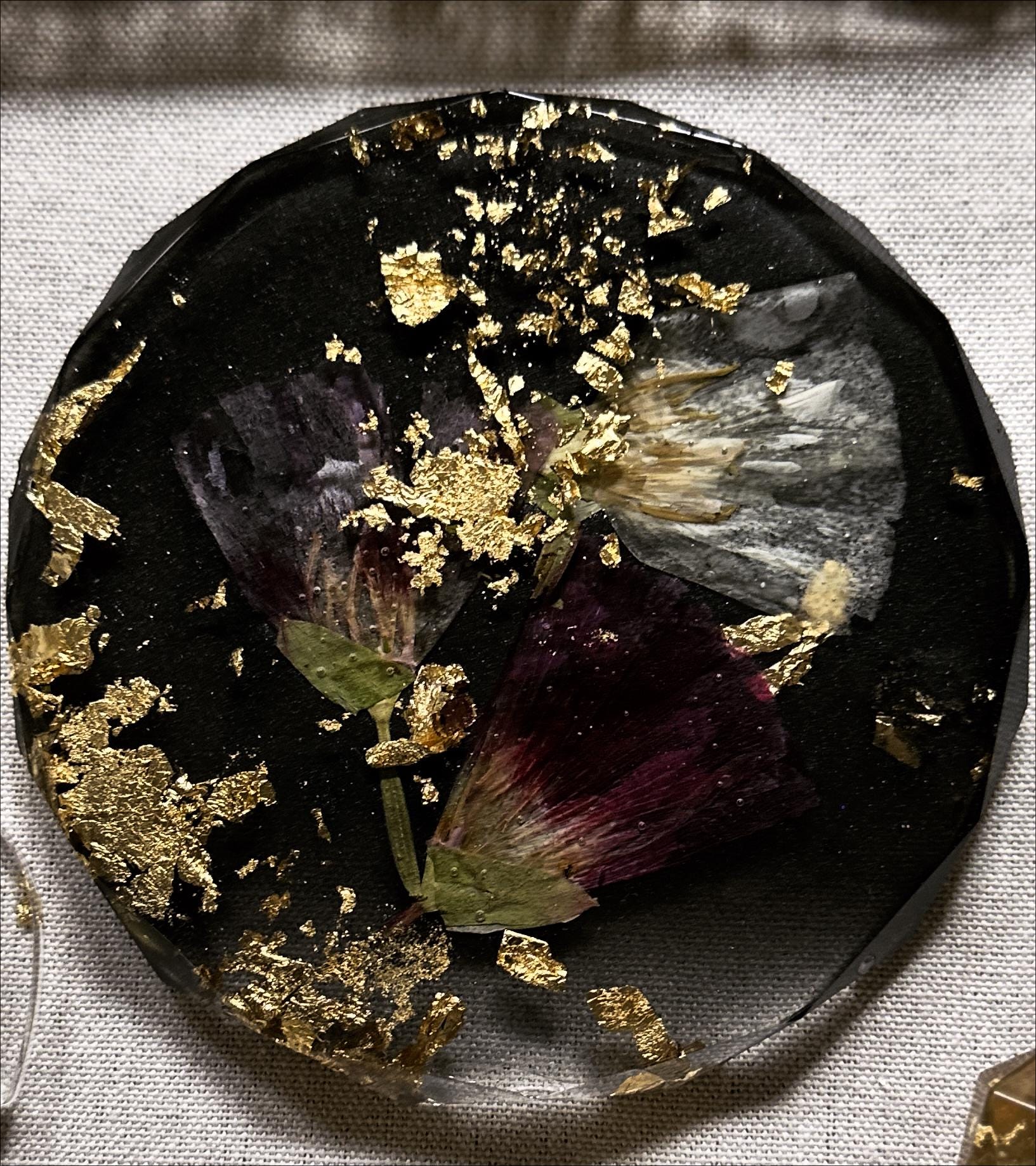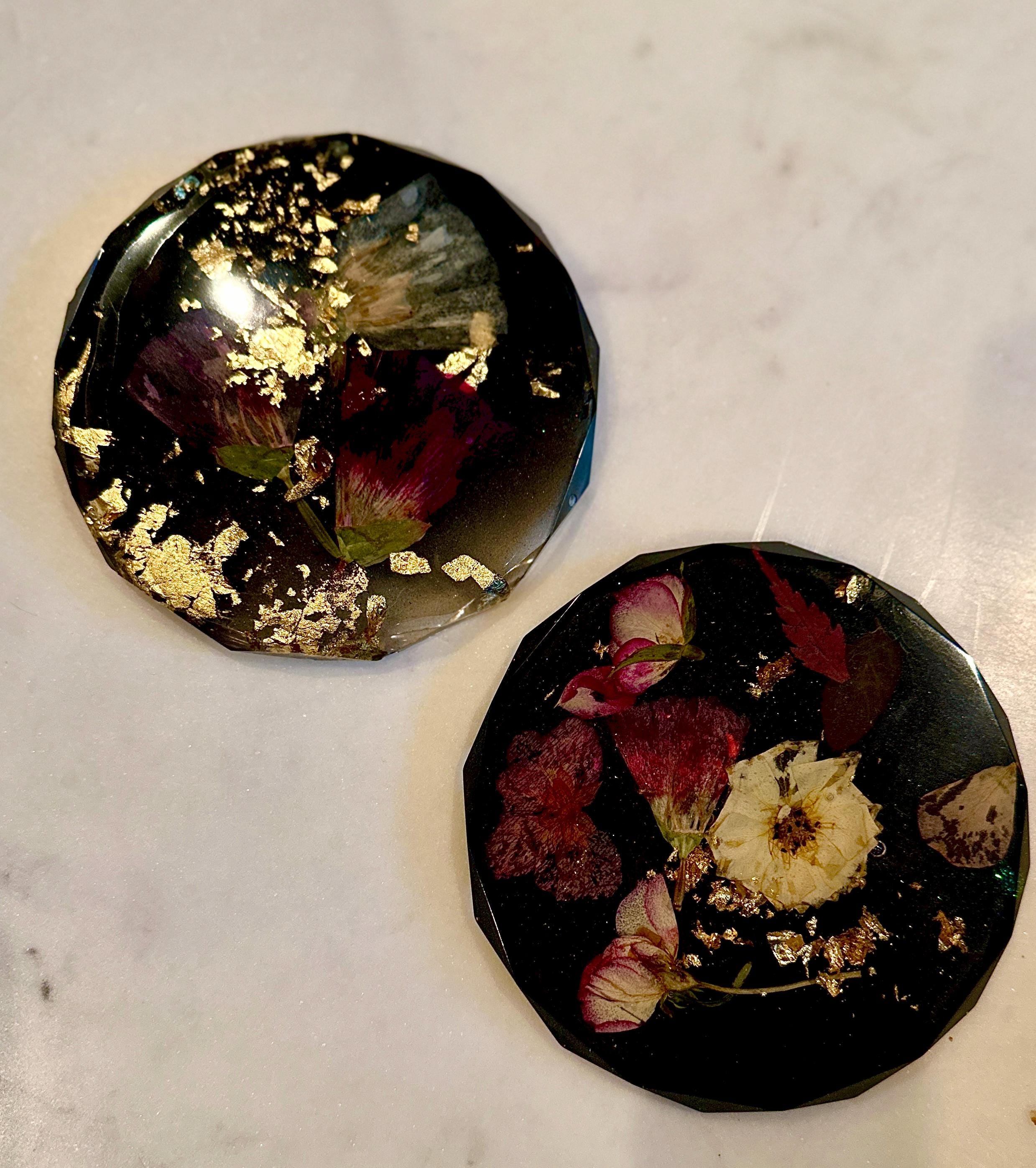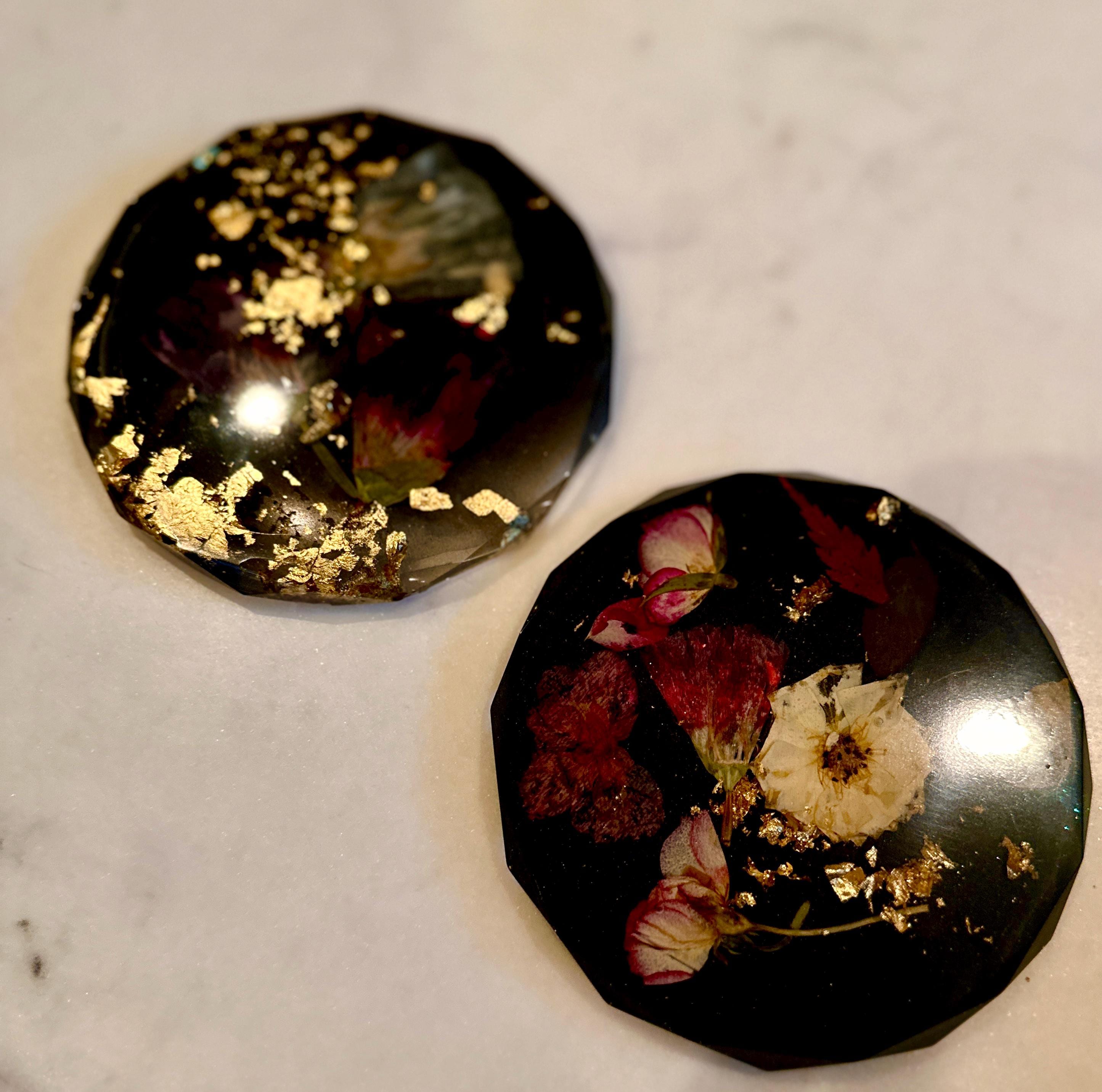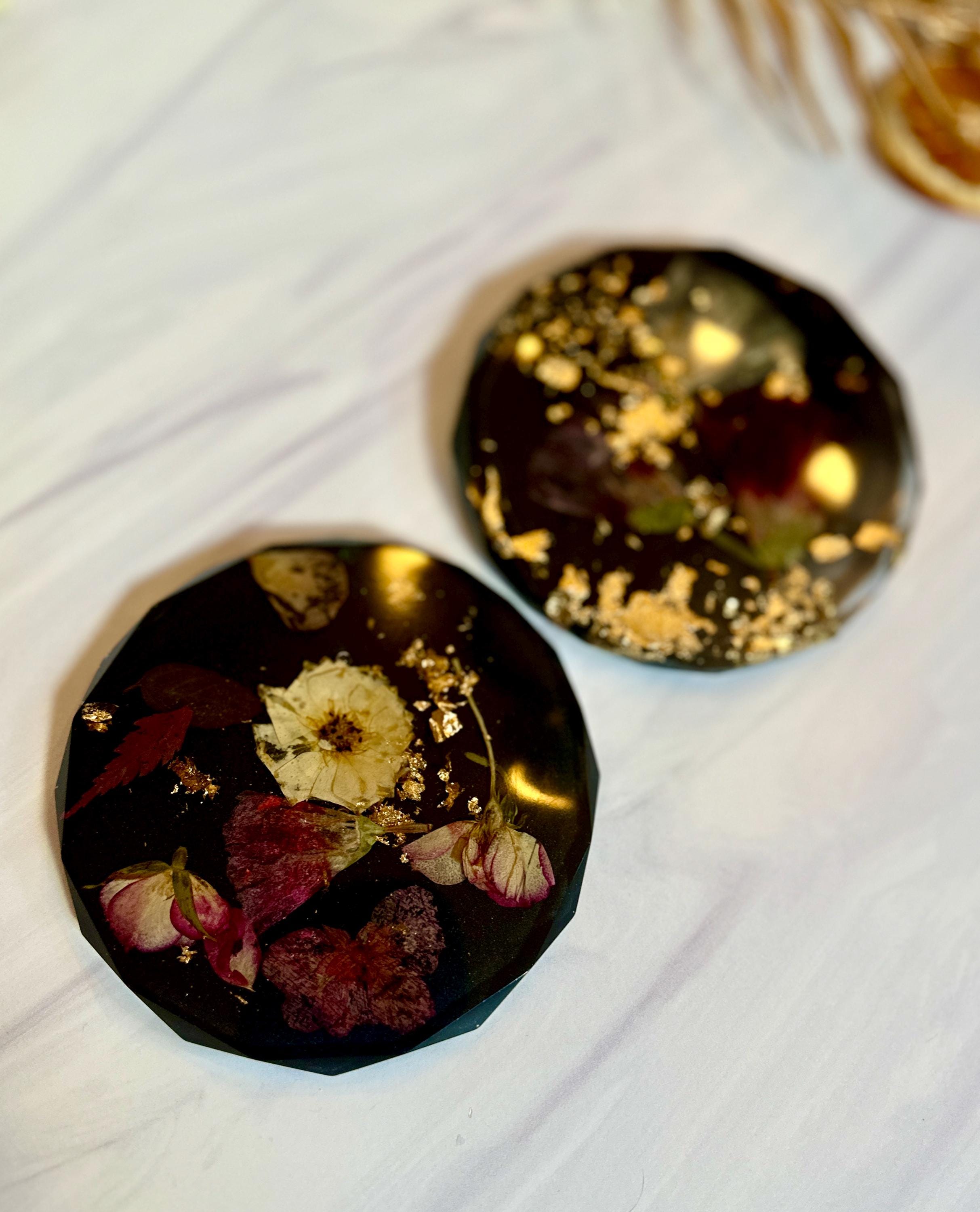 Elevate your home decor or gift a truly unique piece of functional art with our Handmade Resin Coasters. Featuring a striking fusion of modern black resin, delicate real embedded flowers, and shimmering gold flake accents, these coasters are the perfect statement piece for any coffee table or bar cart.