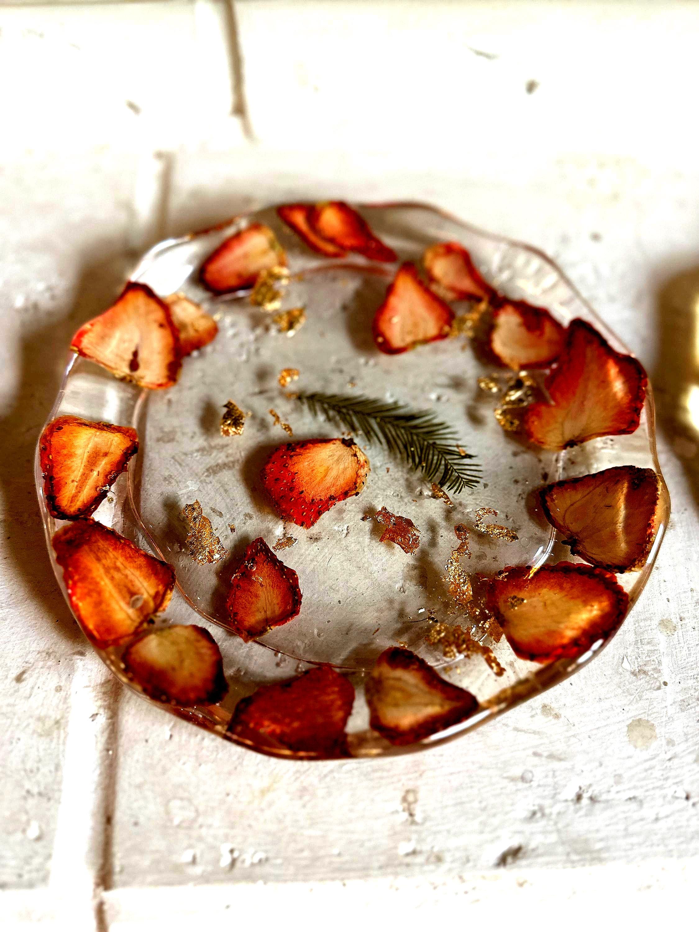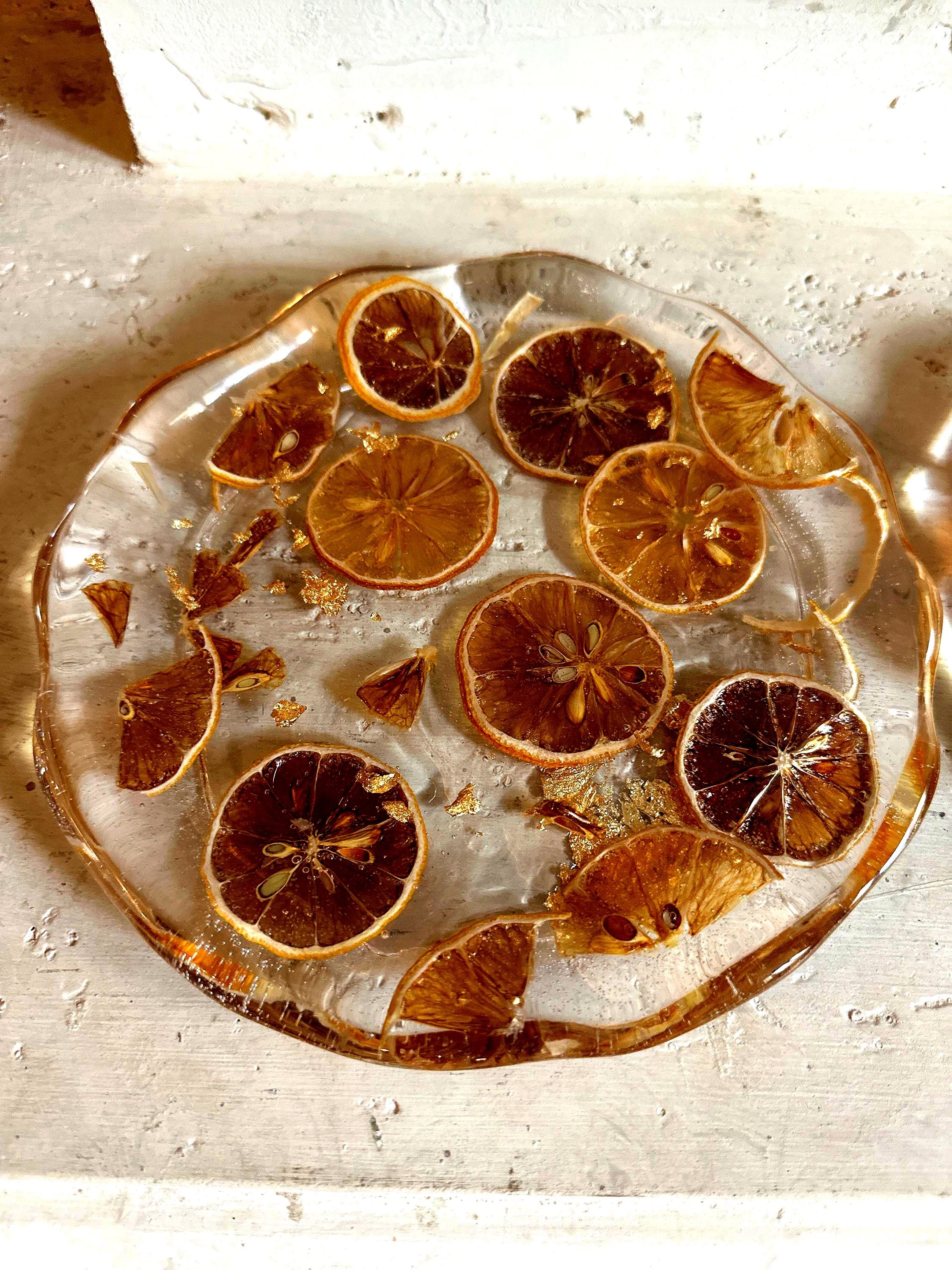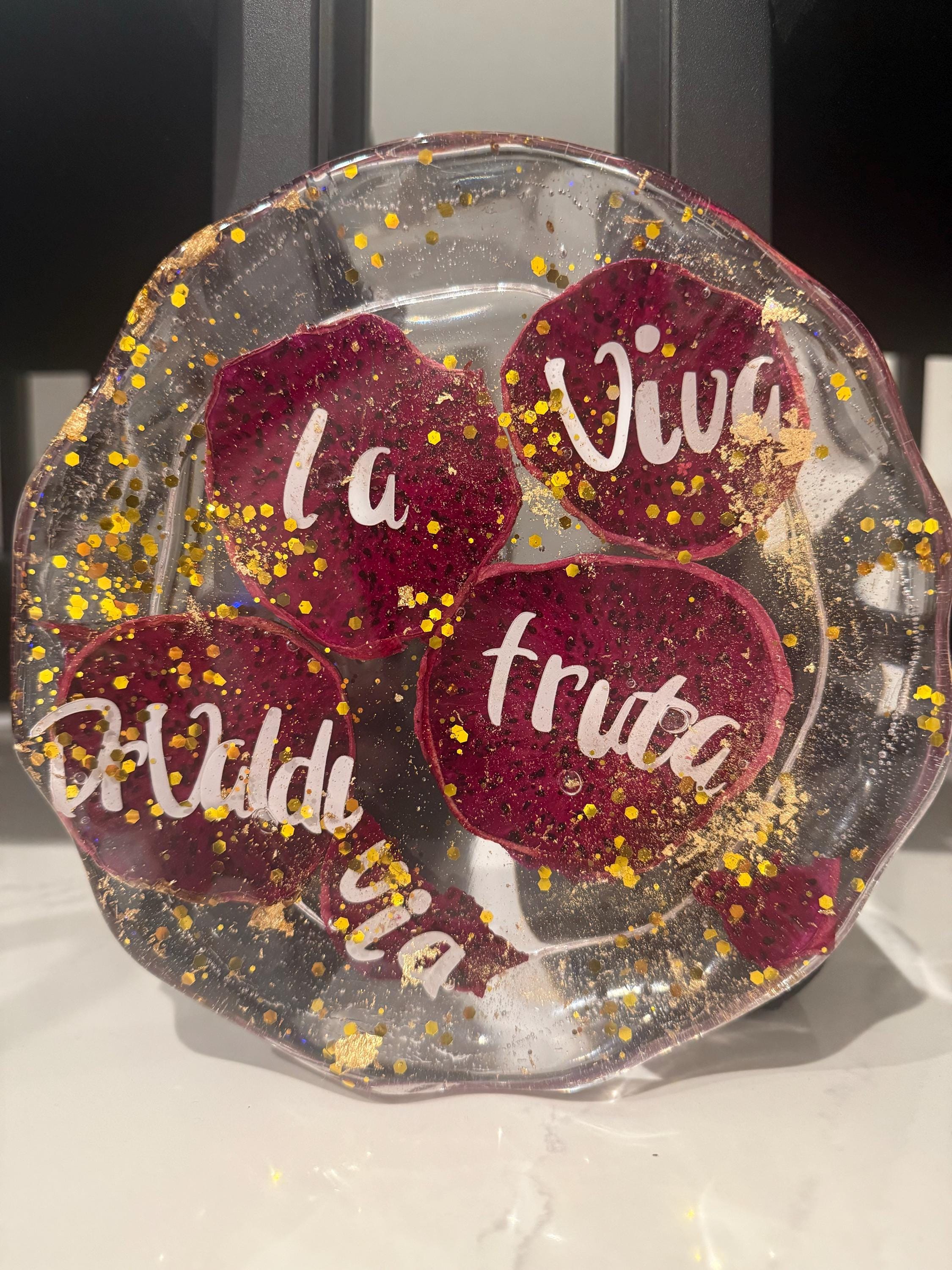 Please Note: Due to the nature of handmade resin items and real dried fruit, each dish is one-of-a-kind. Small variations in color, fruit placement, and bubble presence are normal and contribute to the unique beauty and character of your plate. Do not use this dish in the microwave or dishwasher.