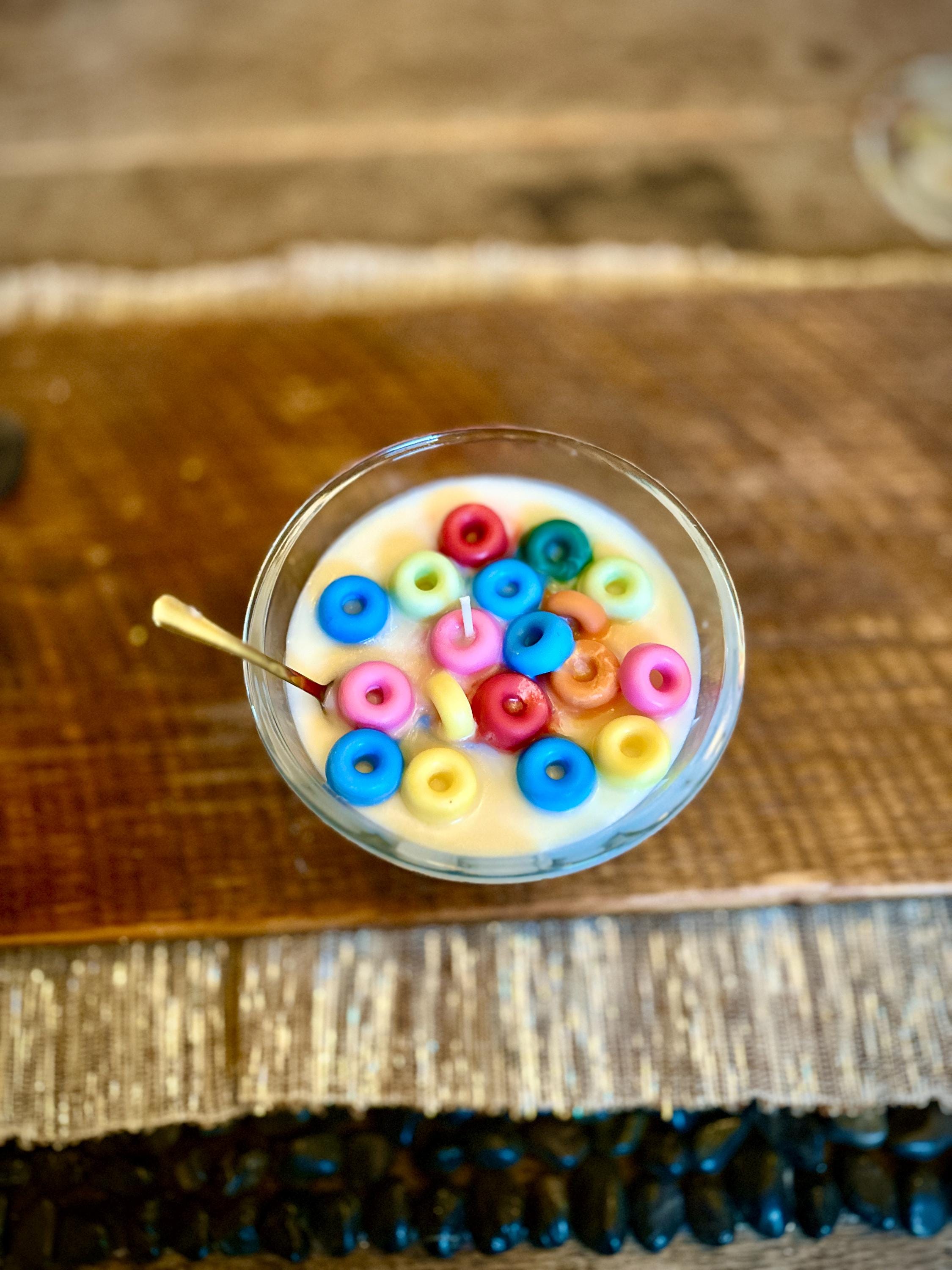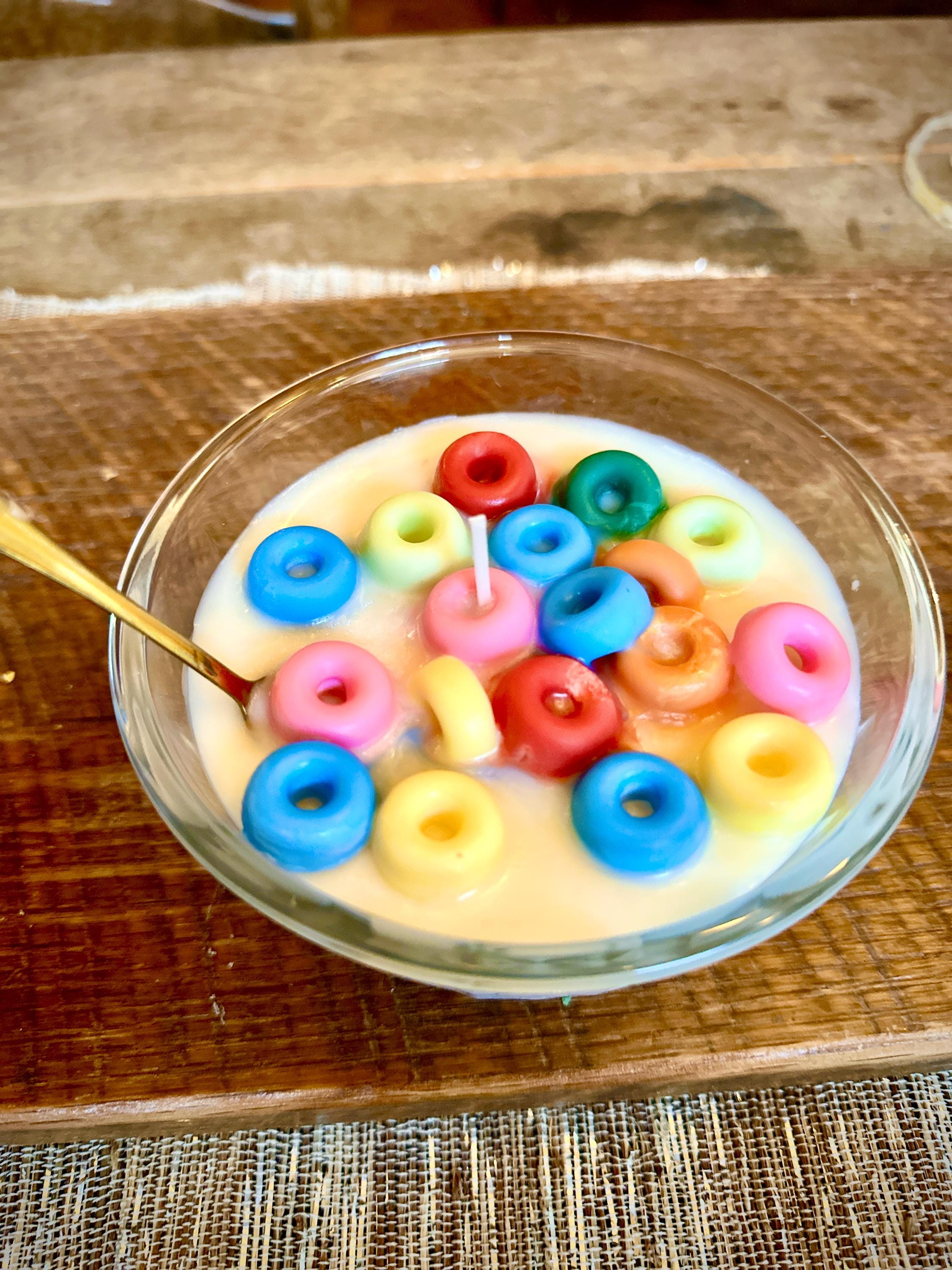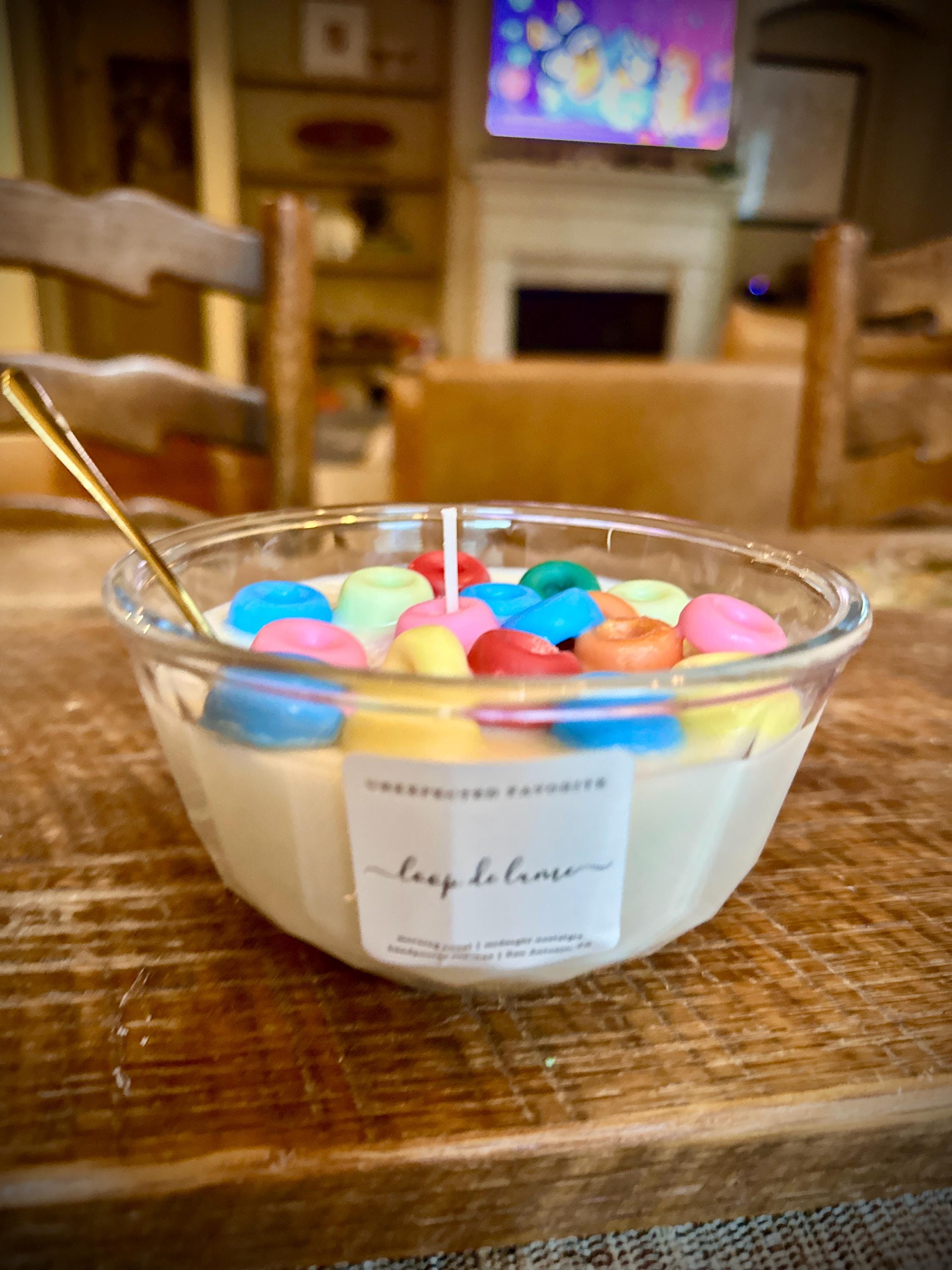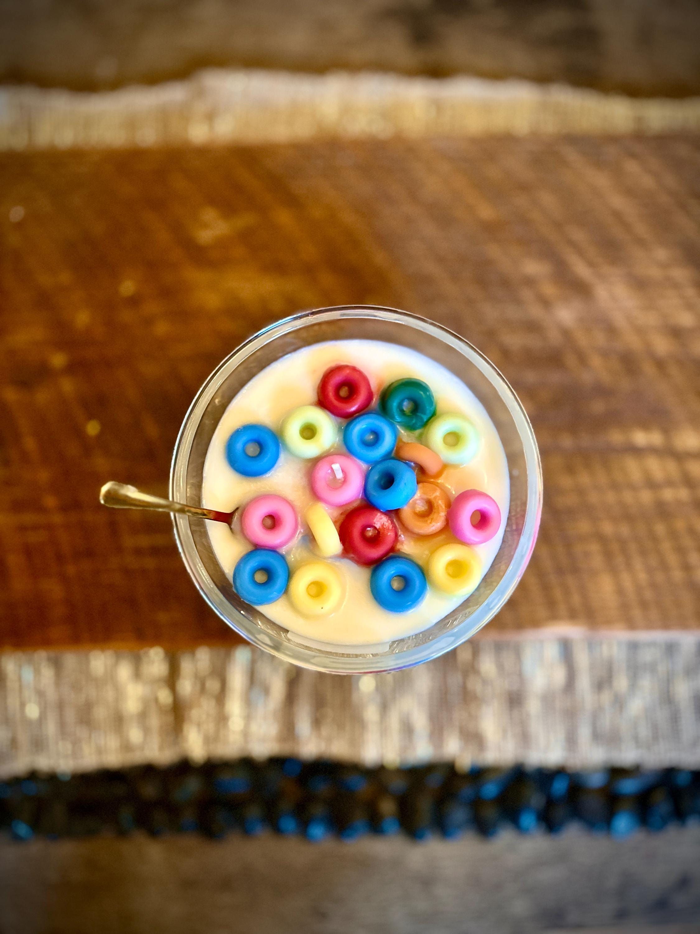 A Bowl of Color: This isn't your average candle. It's lovingly poured into a real, glass cereal bowl, complete with colorful, wax-crafted "Fruit Loops" floating on top of a milky-white soy wax base. It's so realistic, you'll swear you can hear the crunch!