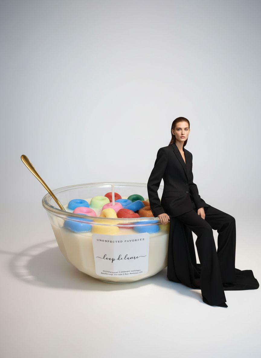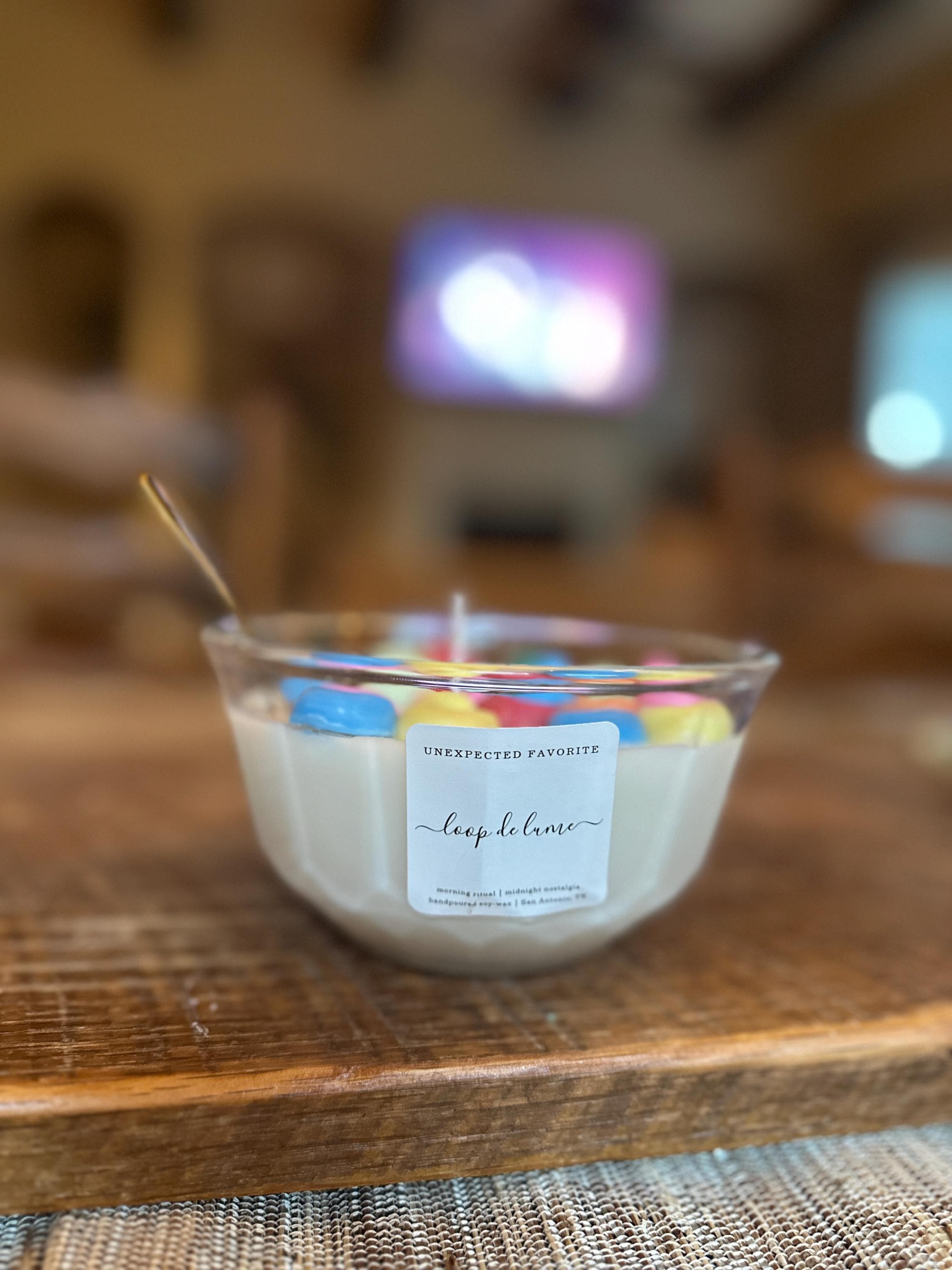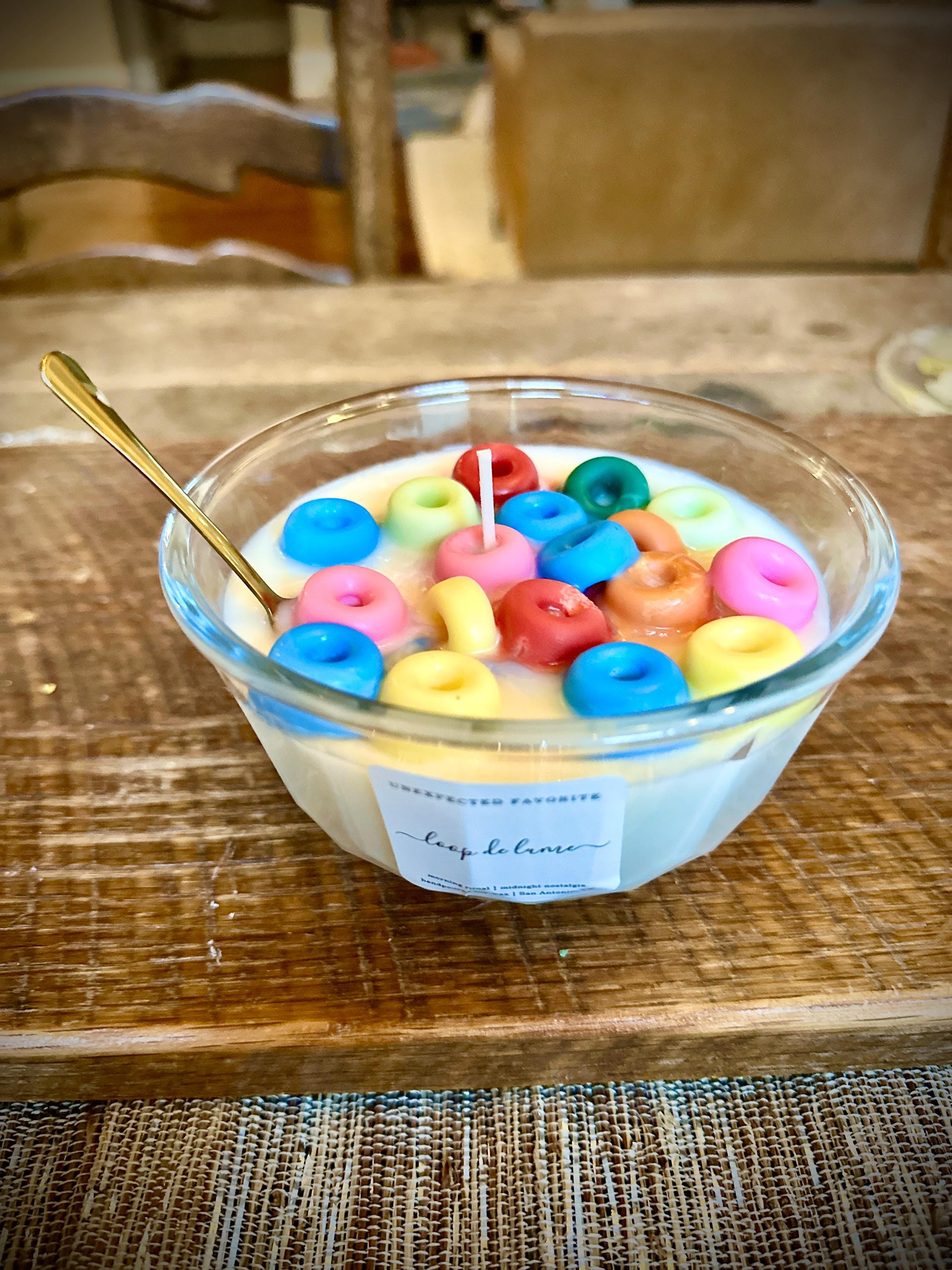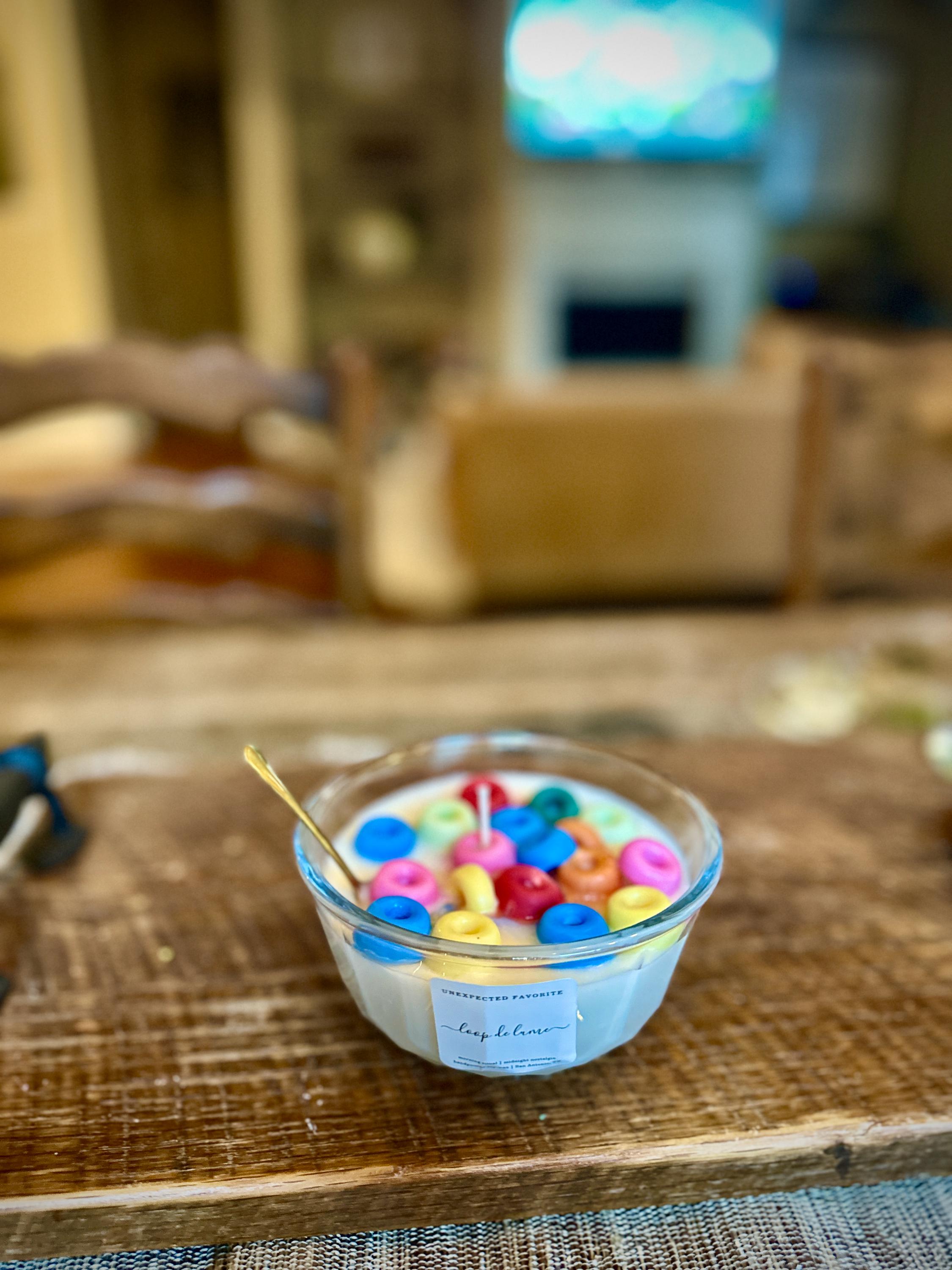 A Bowl of Color: This isn't your average candle. It's lovingly poured into a real, glass cereal bowl, complete with colorful, wax-crafted "Fruit Loops" floating on top of a milky-white soy wax base. It's so realistic, you'll swear you can hear the crunch!