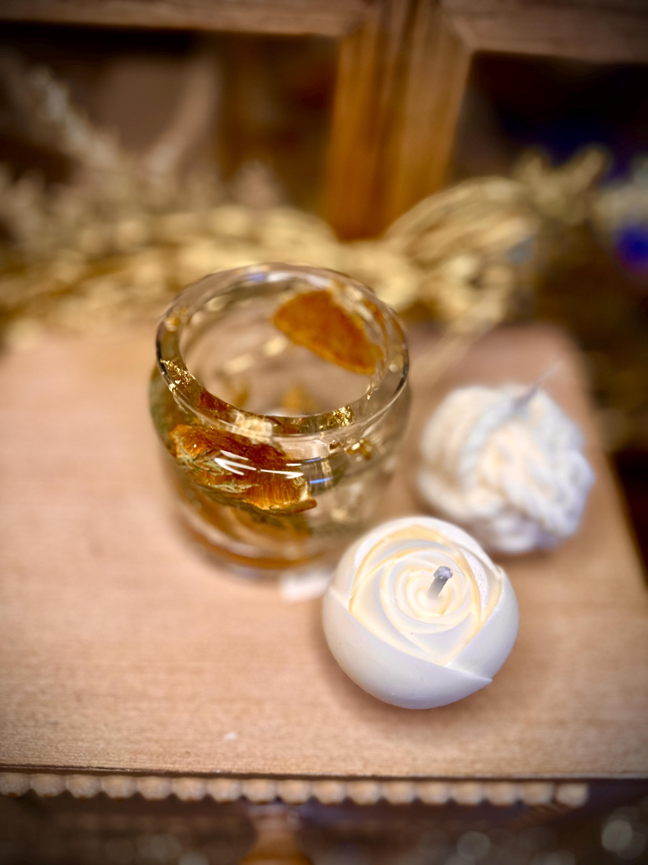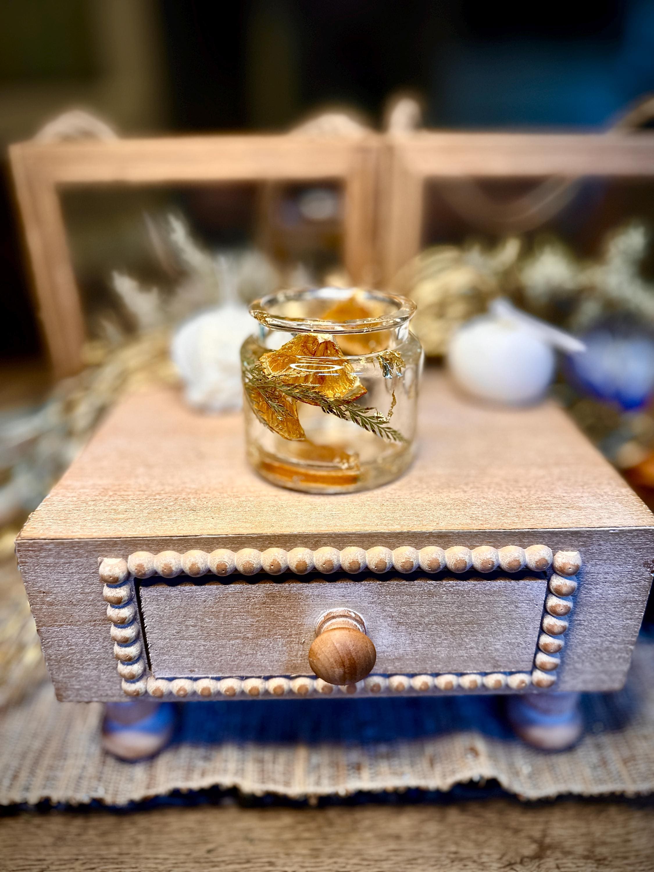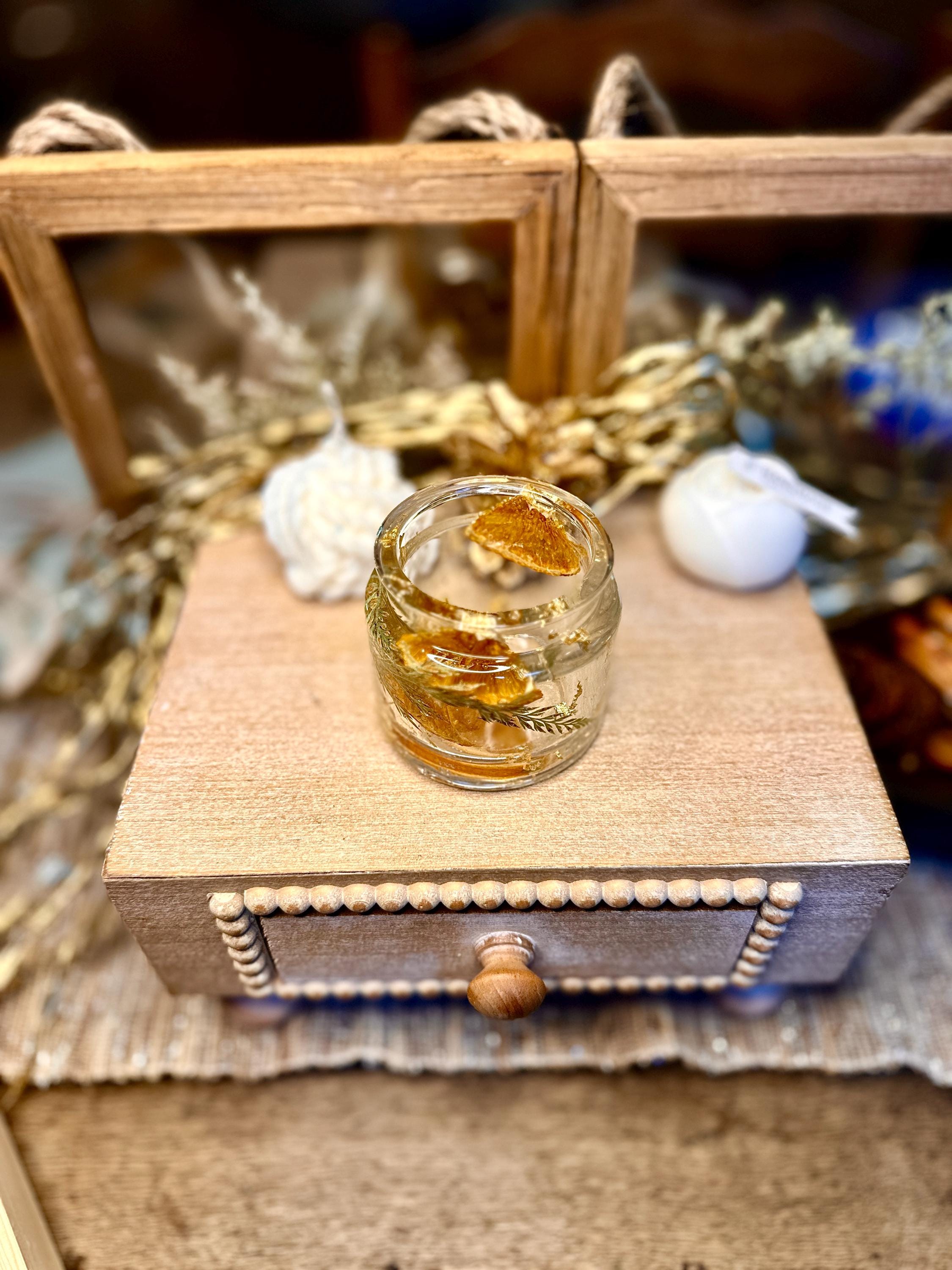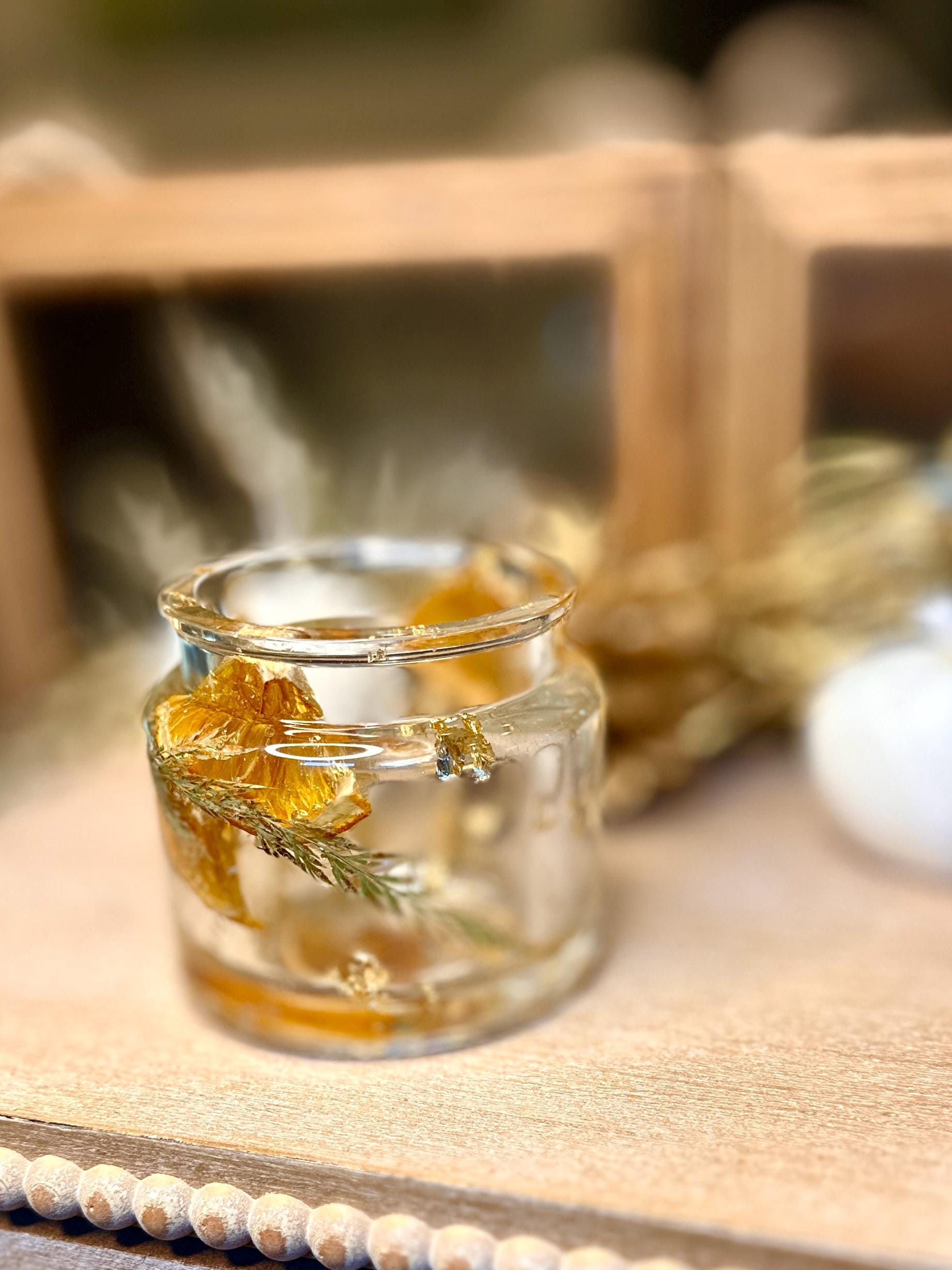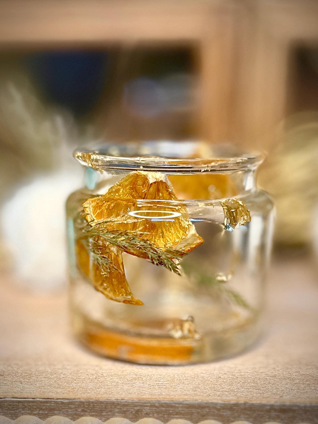 The Keepsake: One clear resin jar (approx. 3-inch height) with real embedded botanicals, dried orange slices, and gold flake. Perfect for trinkets, cotton swabs, or as stunning desktop decor.