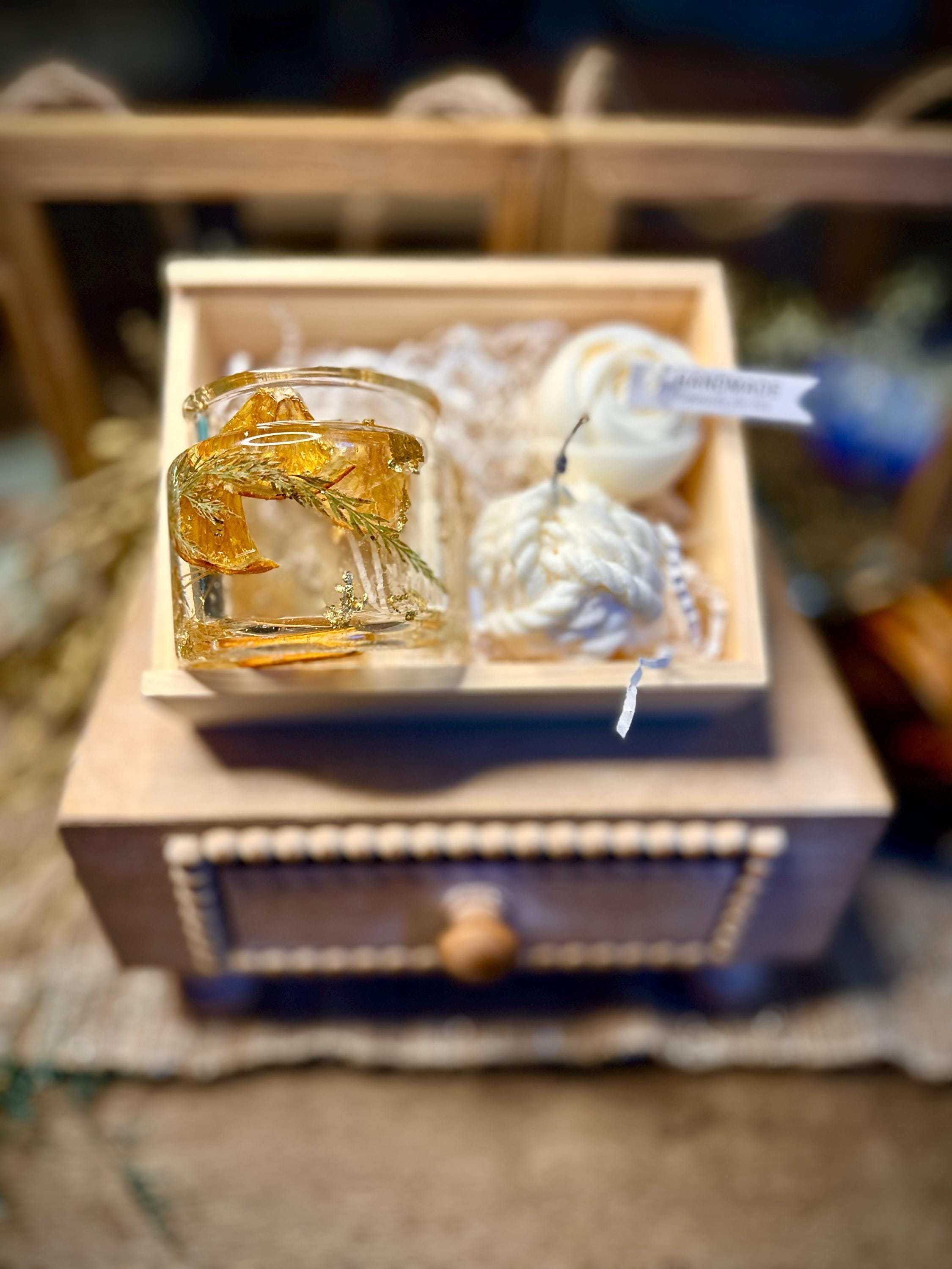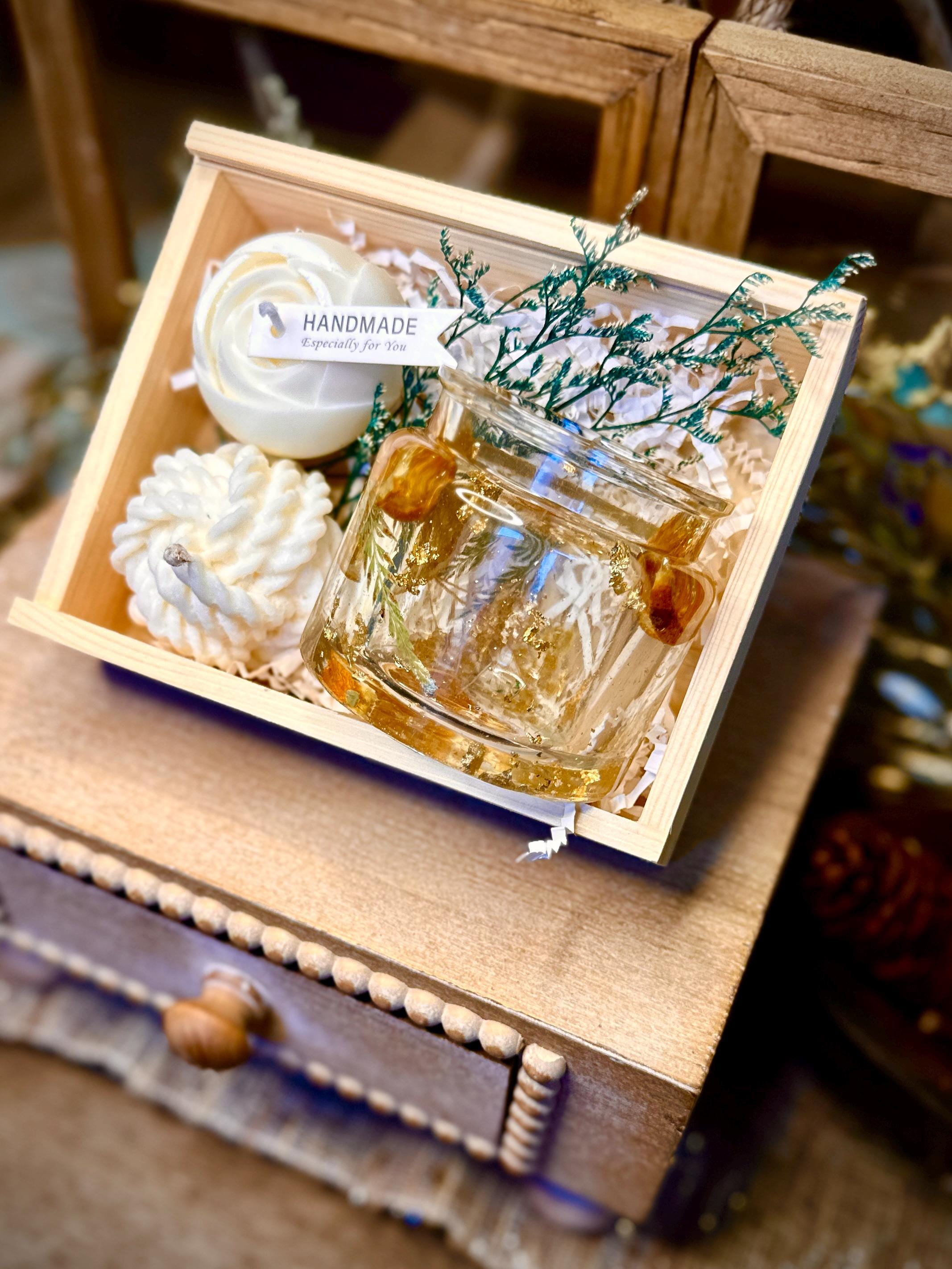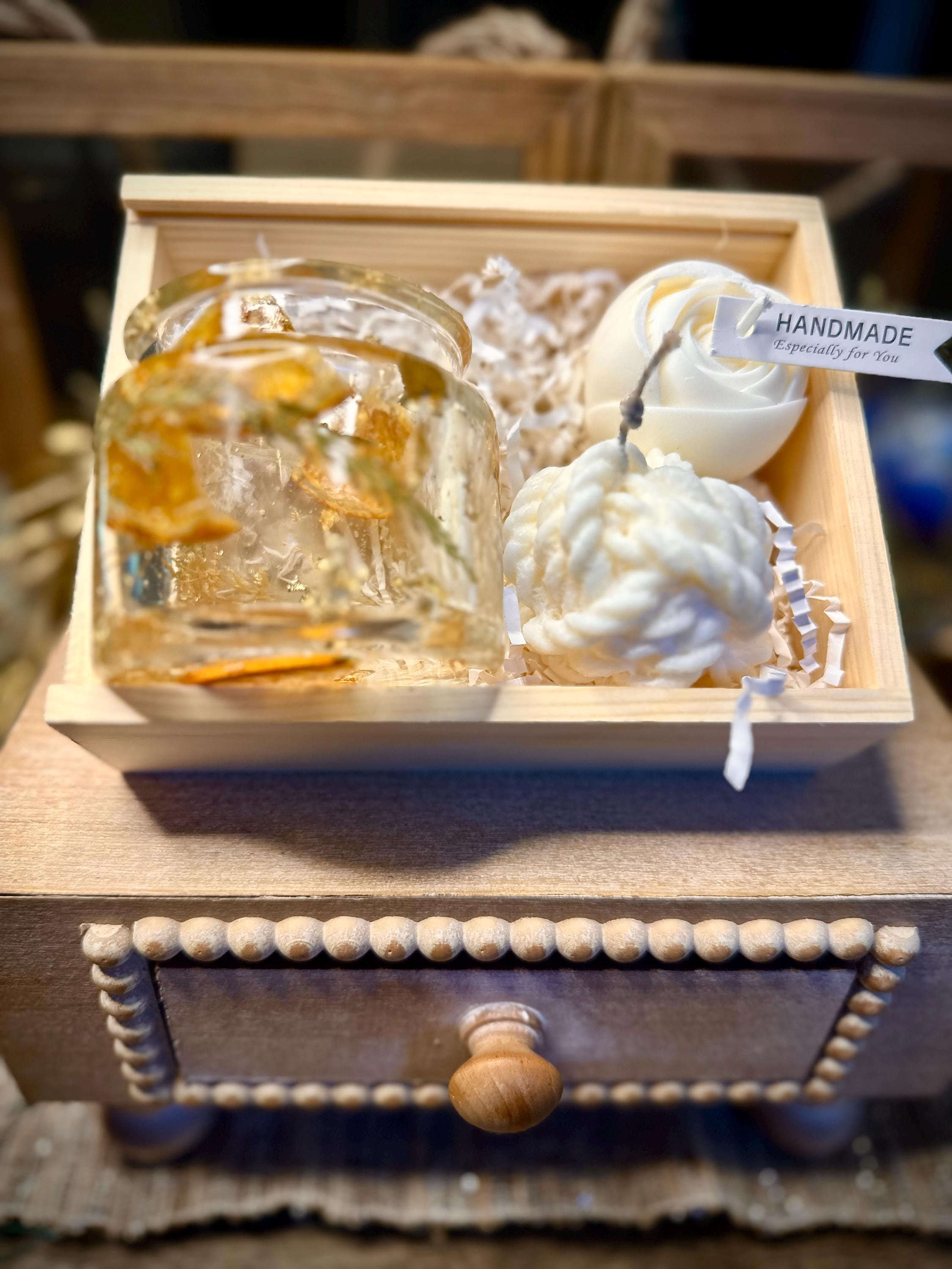 Tired of last-minute gift runs? This beautiful READY TO SHIP handmade gift box is your instant solution! Featuring two gorgeous, unique soy wax candles and a botanical resin keepsake jar from our botanical & fruit resin collection, it's the ultimate 'memorable gift to go.'