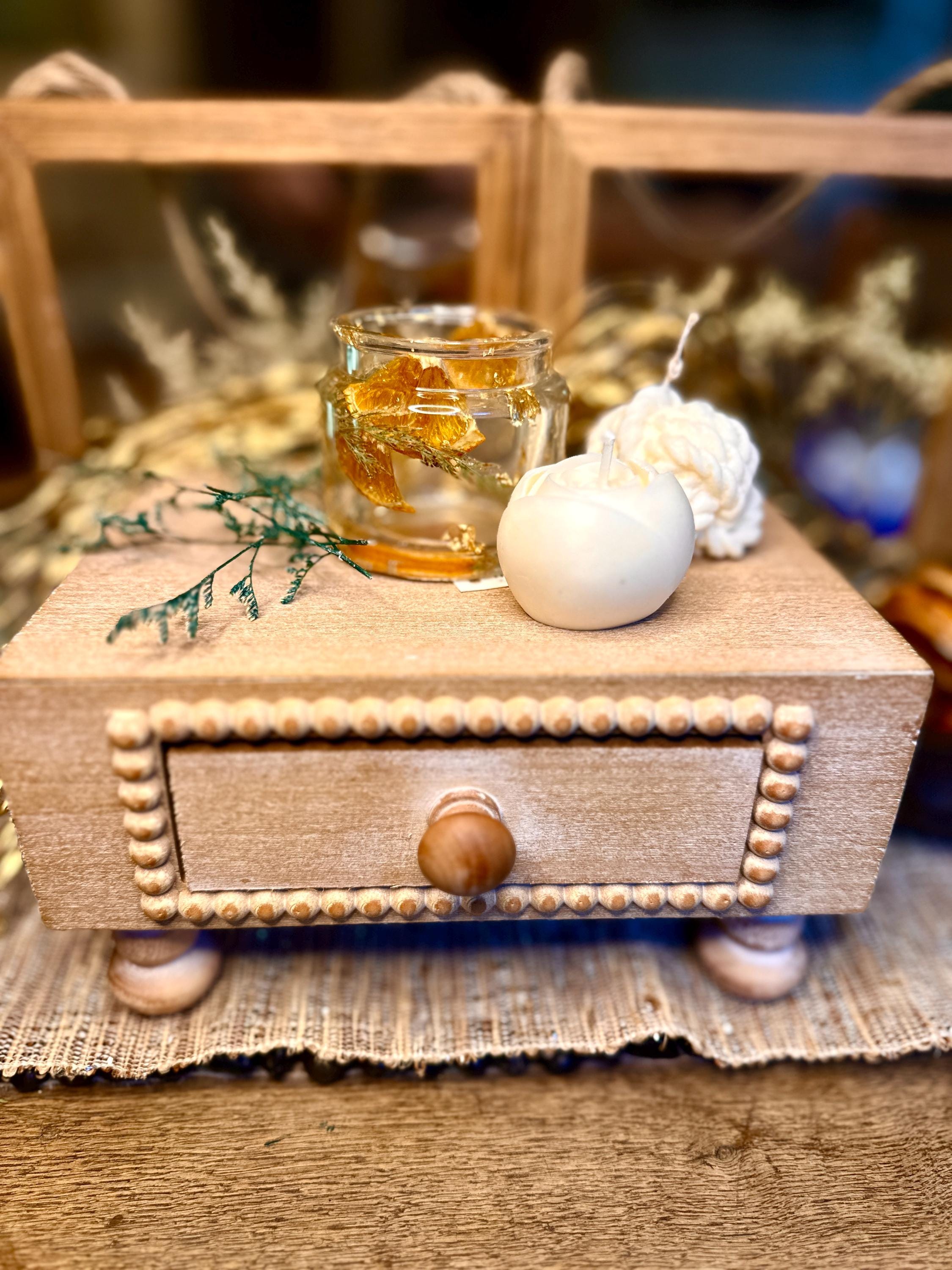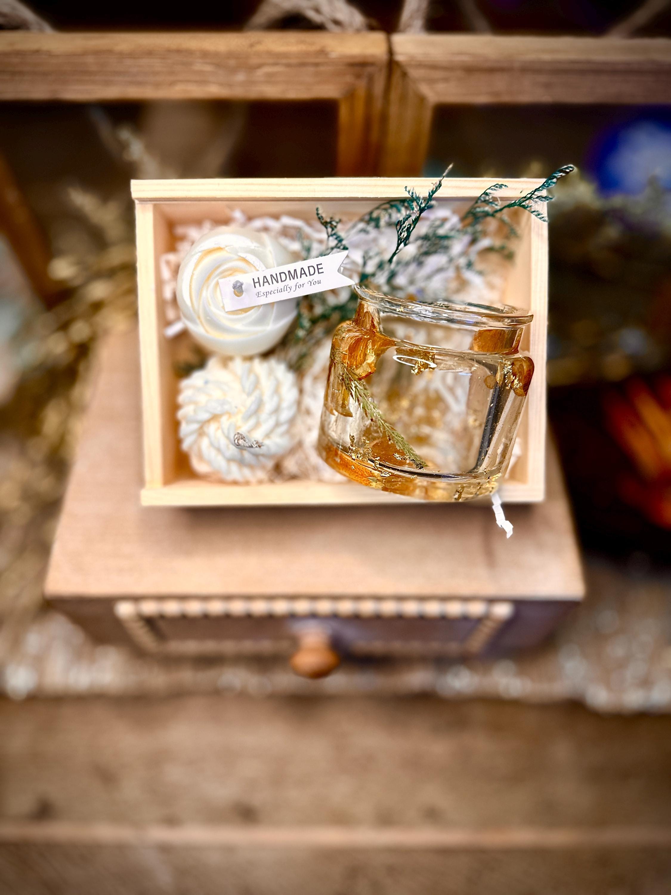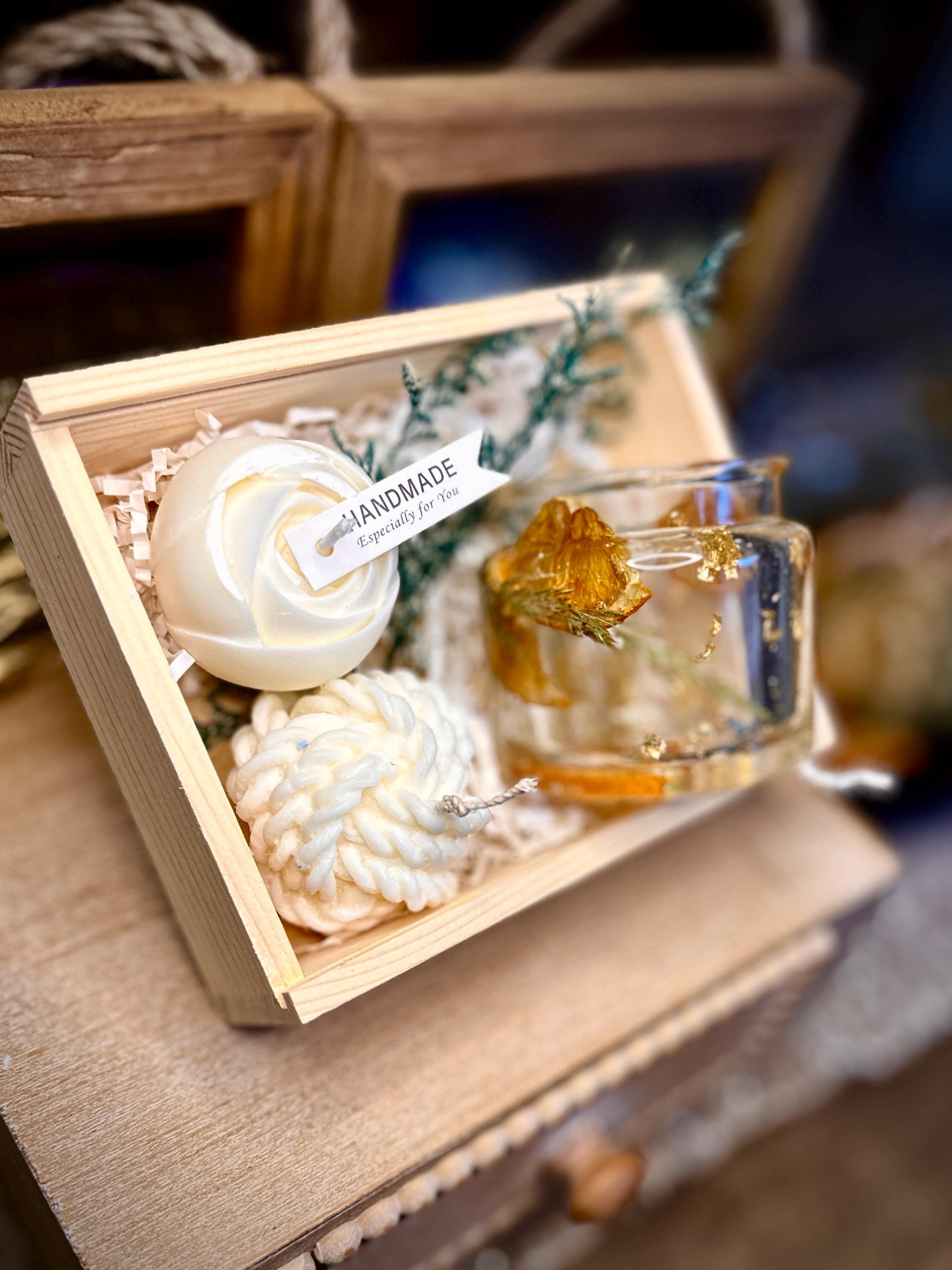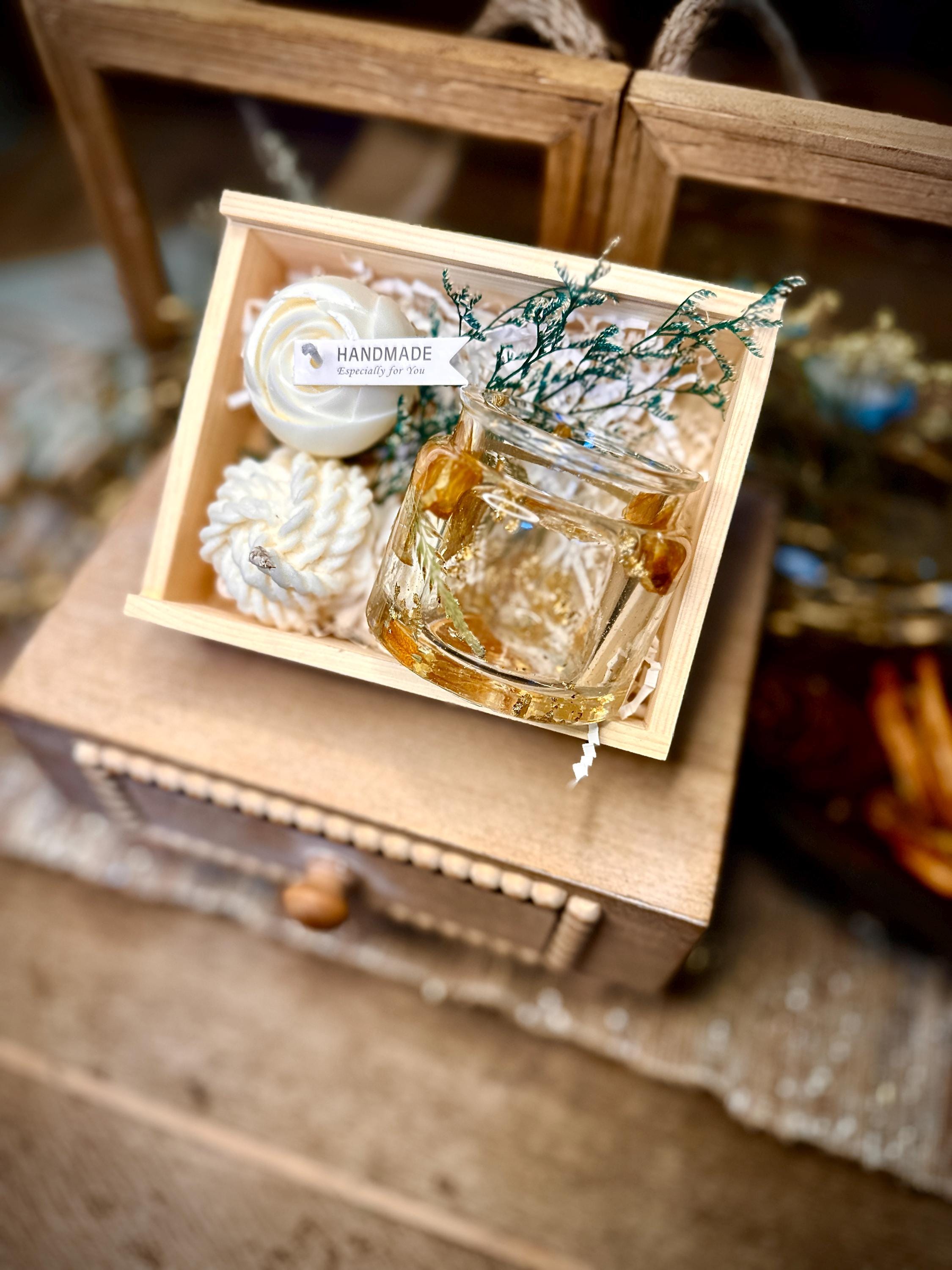 Tired of last-minute gift runs? This beautiful READY TO SHIP handmade gift box is your instant solution! Featuring two gorgeous, unique soy wax candles and a botanical resin keepsake jar from our botanical & fruit resin collection, it's the ultimate 'memorable gift to go.'