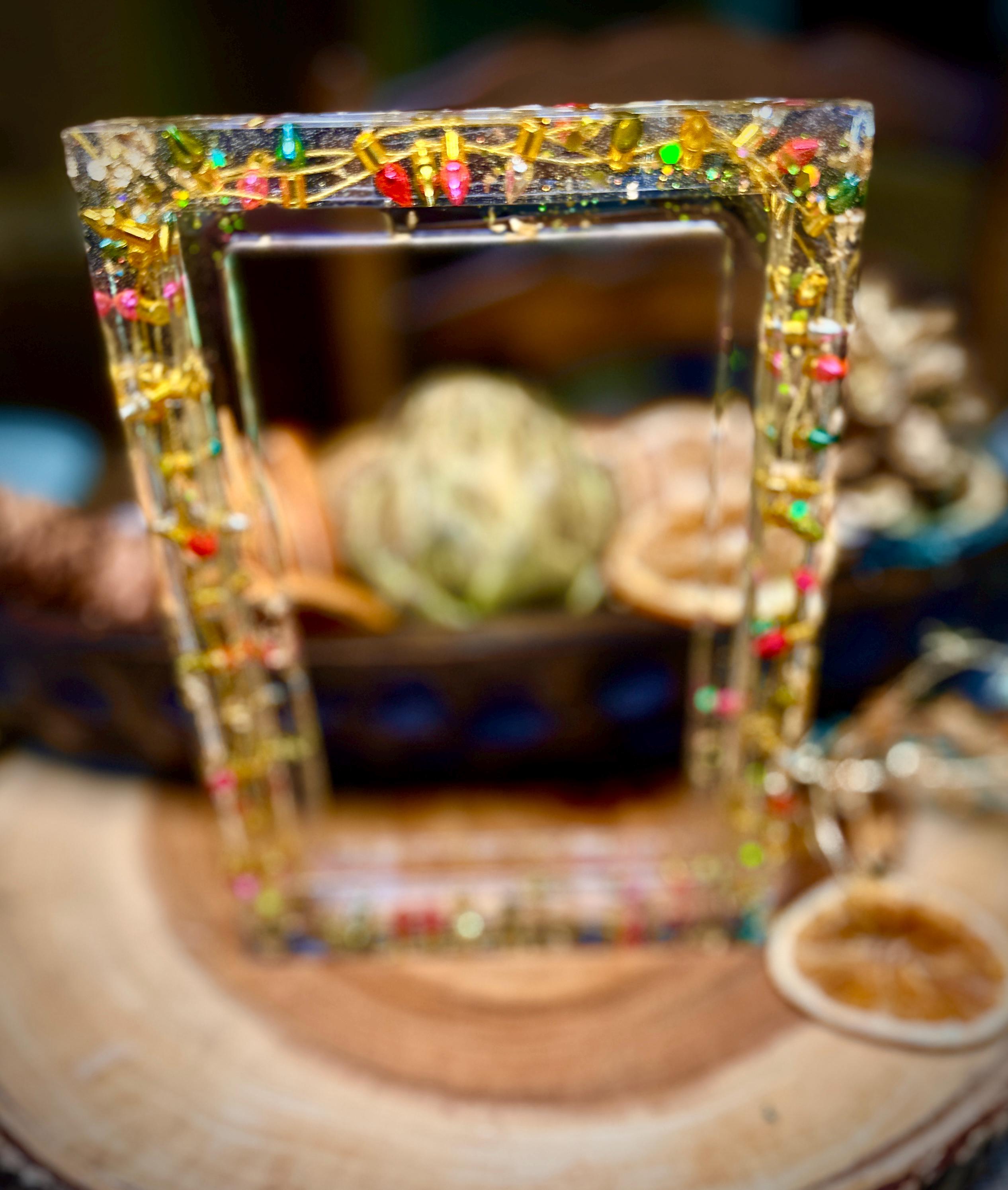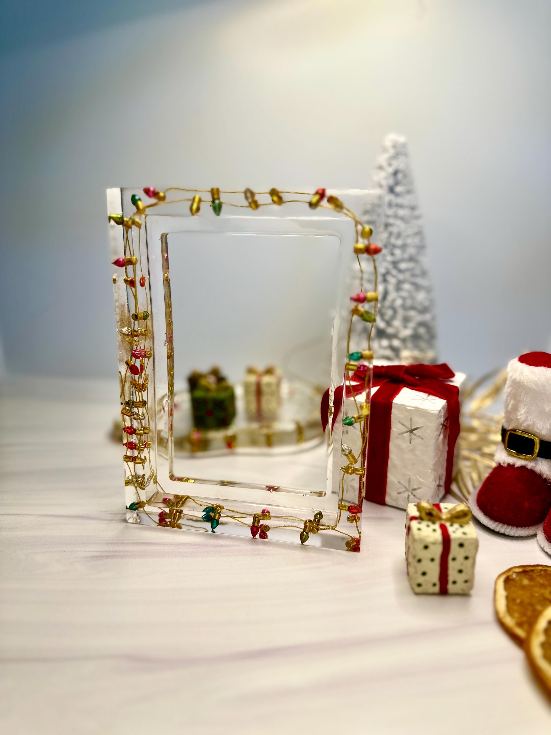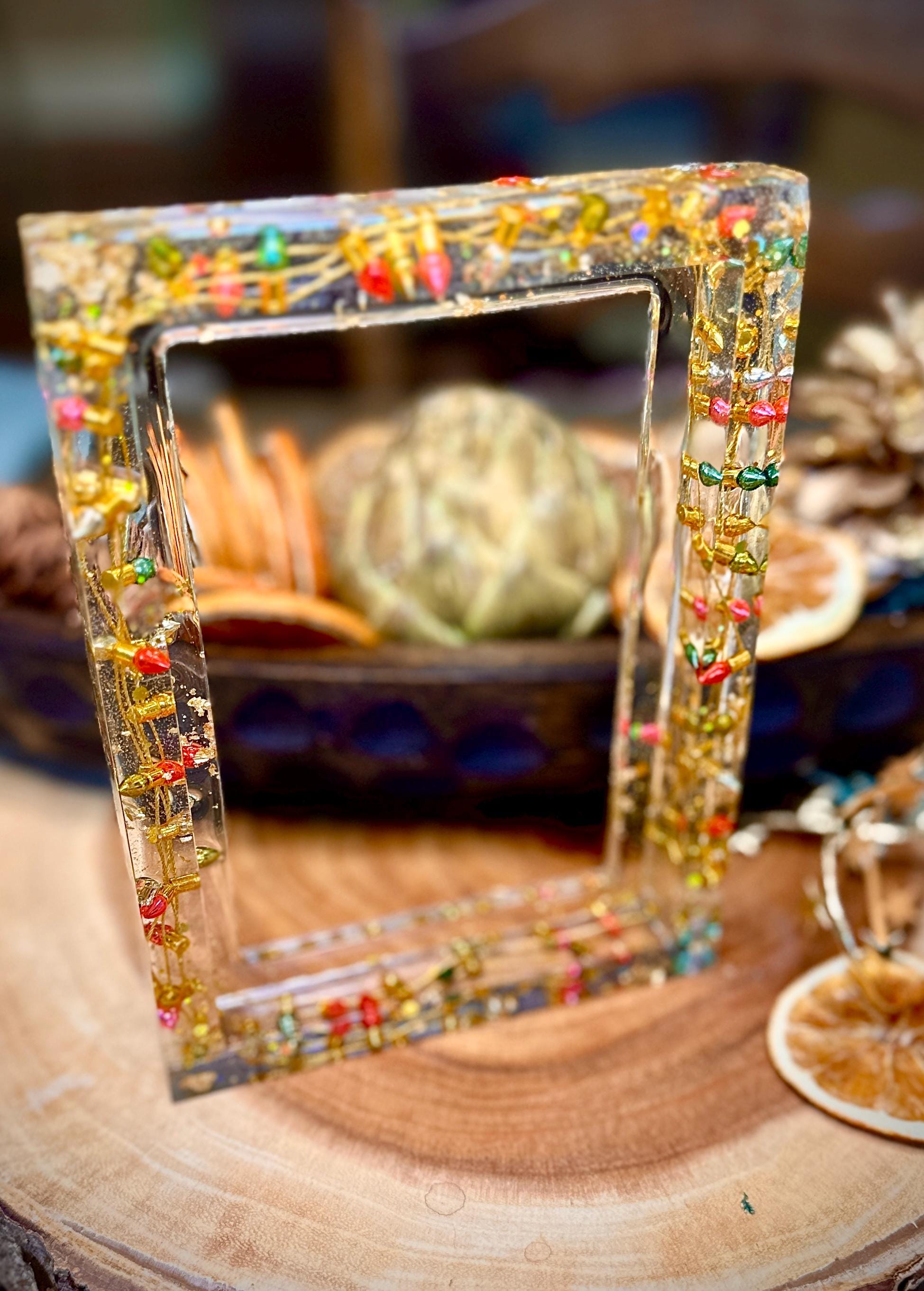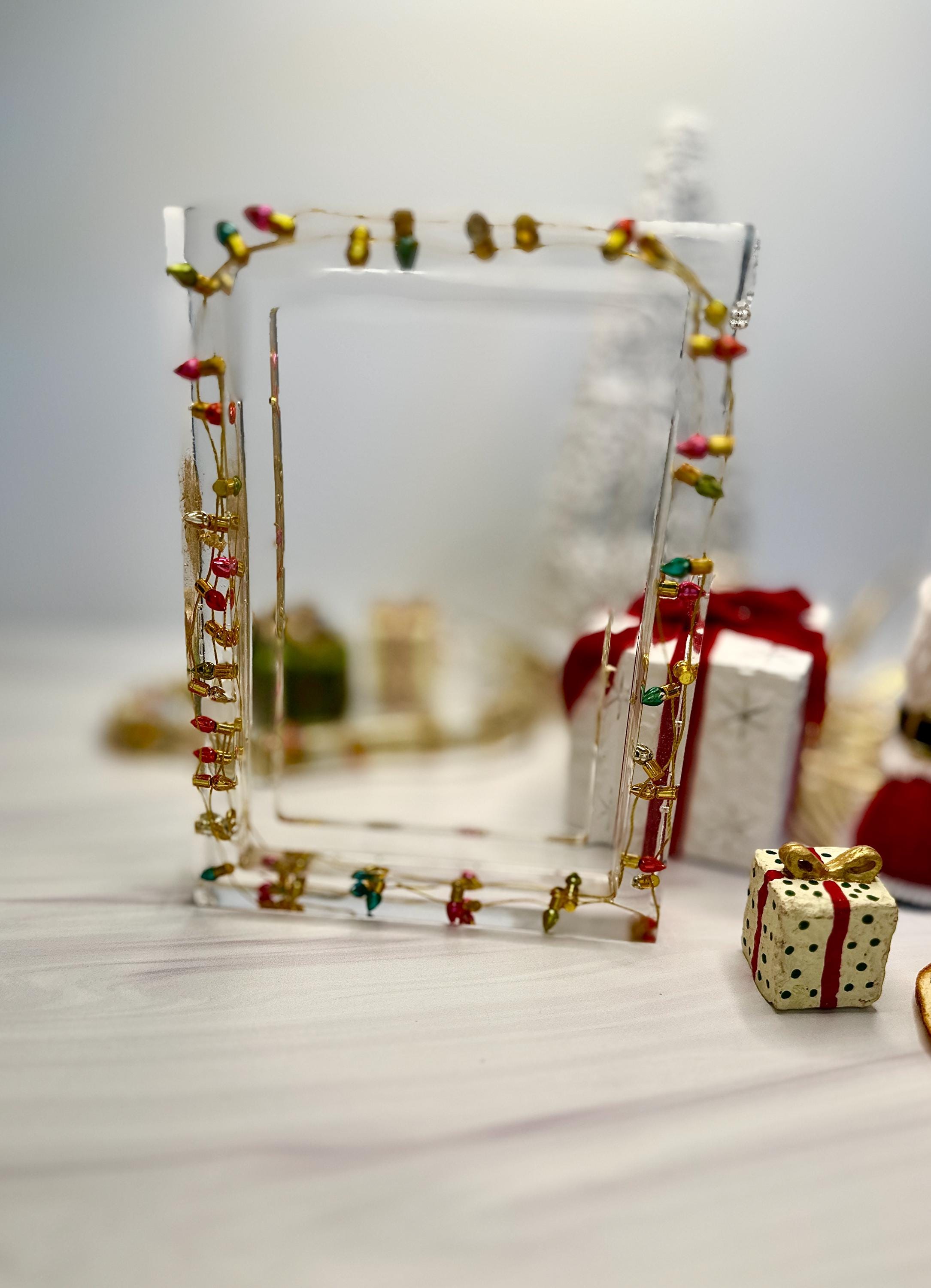 🎄 Sparkling Christmas Decor: Handmade Resin Photo Frame with 3D Festive Lights Capture the bright spirit of the season with this truly unique, handcrafted 3D Resin Christmas Picture Frame! This festive photo frame features a captivating, three-dimensional effect where colorful, decorative elements (that resemble mini holiday lights) are permanently embedded right into the clear epoxy resin.