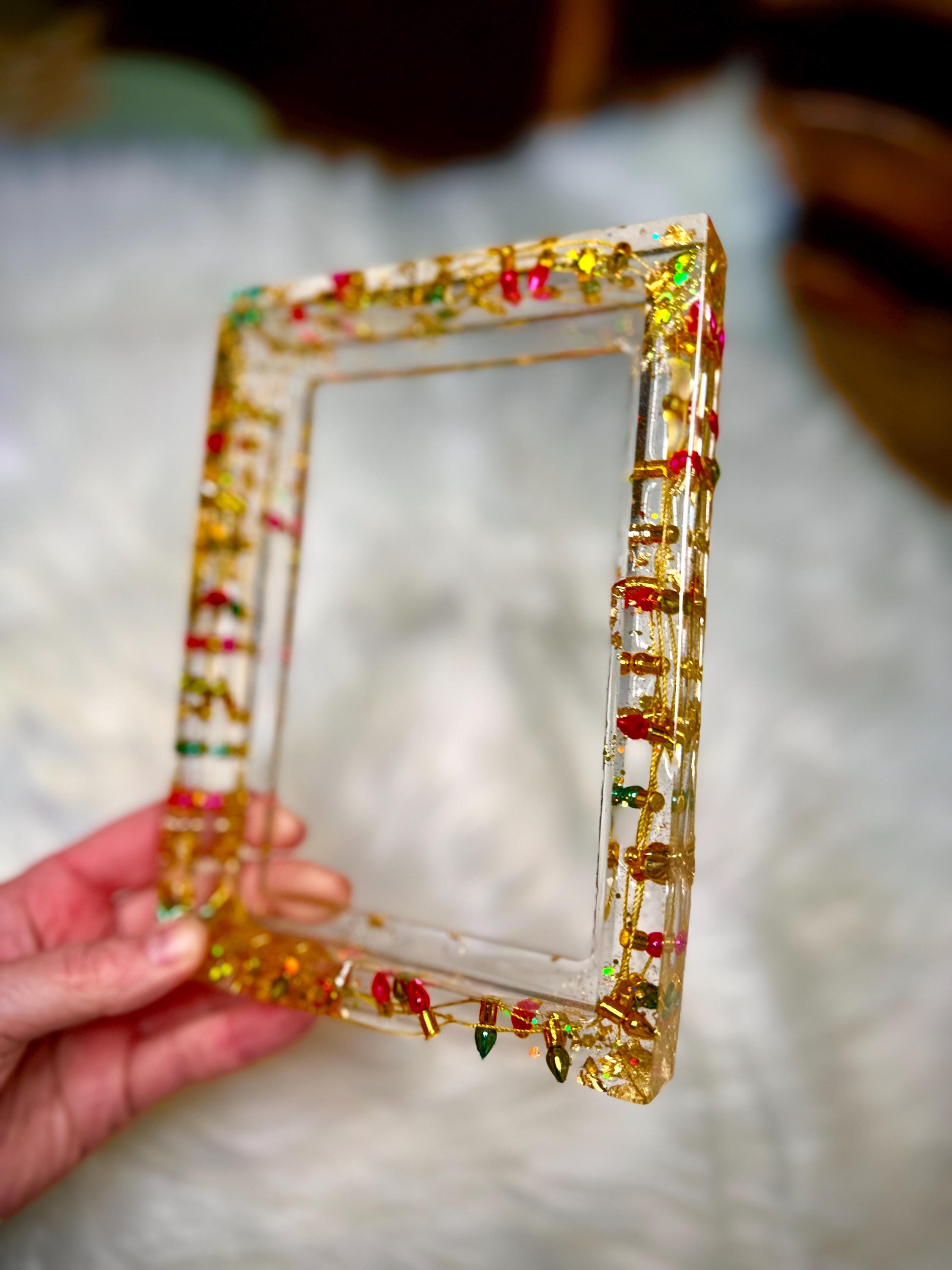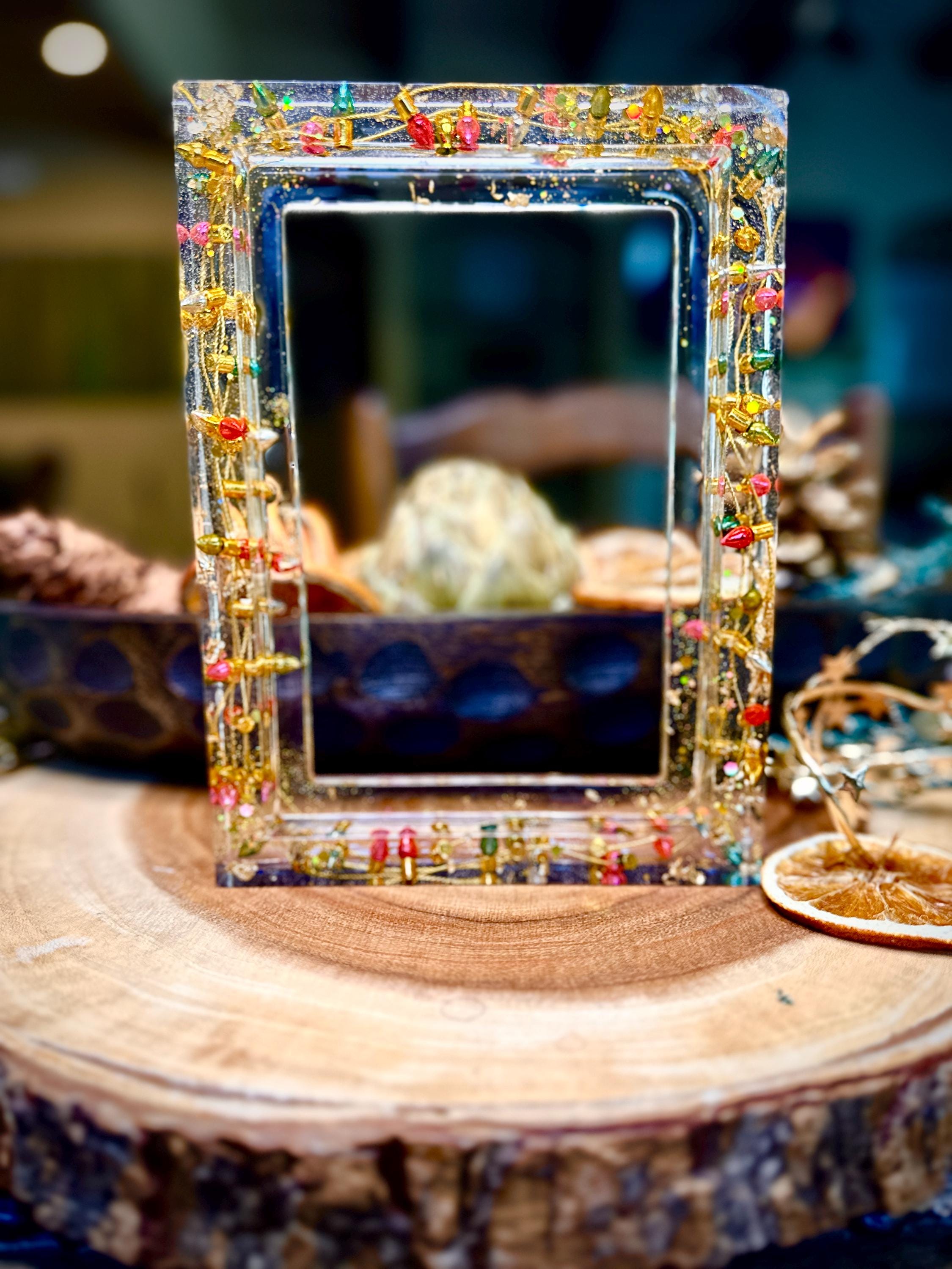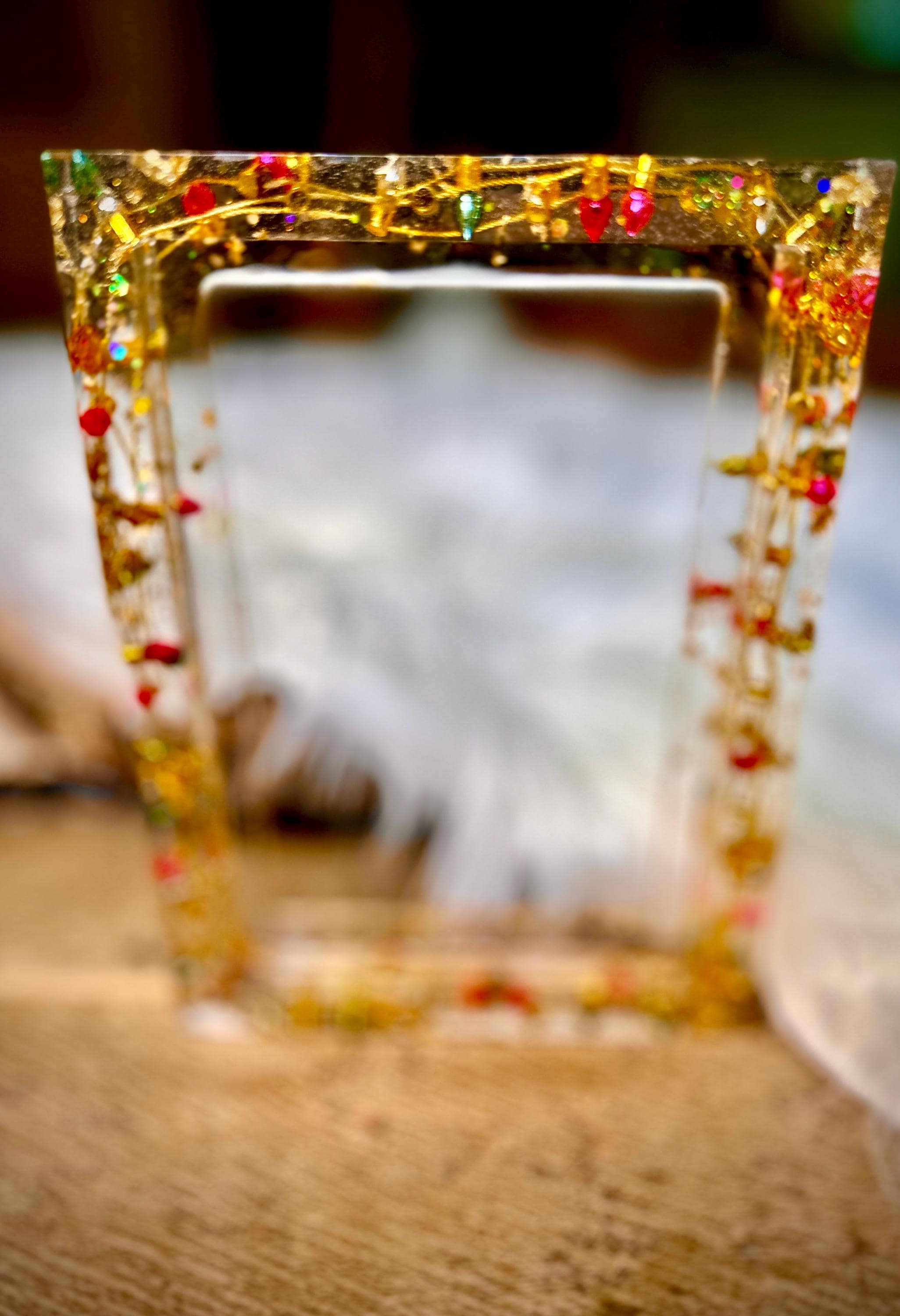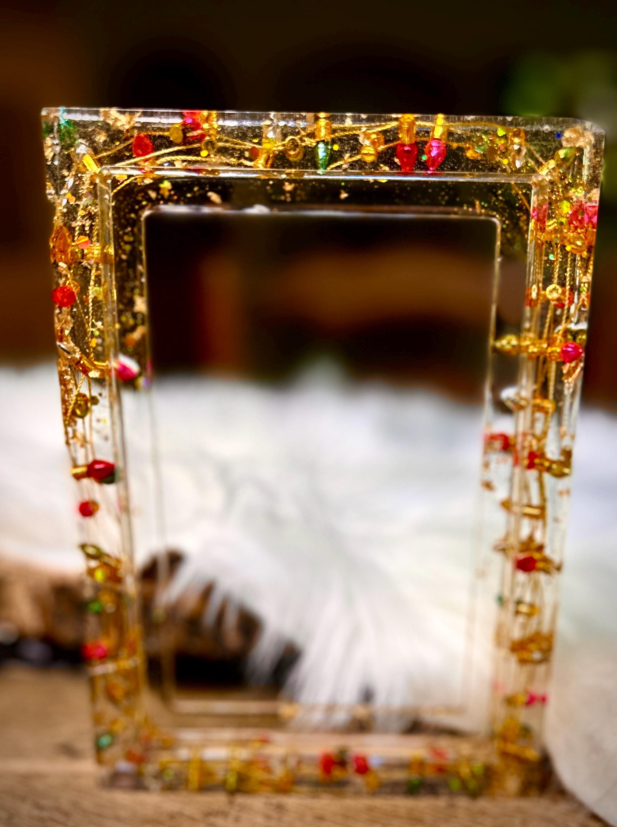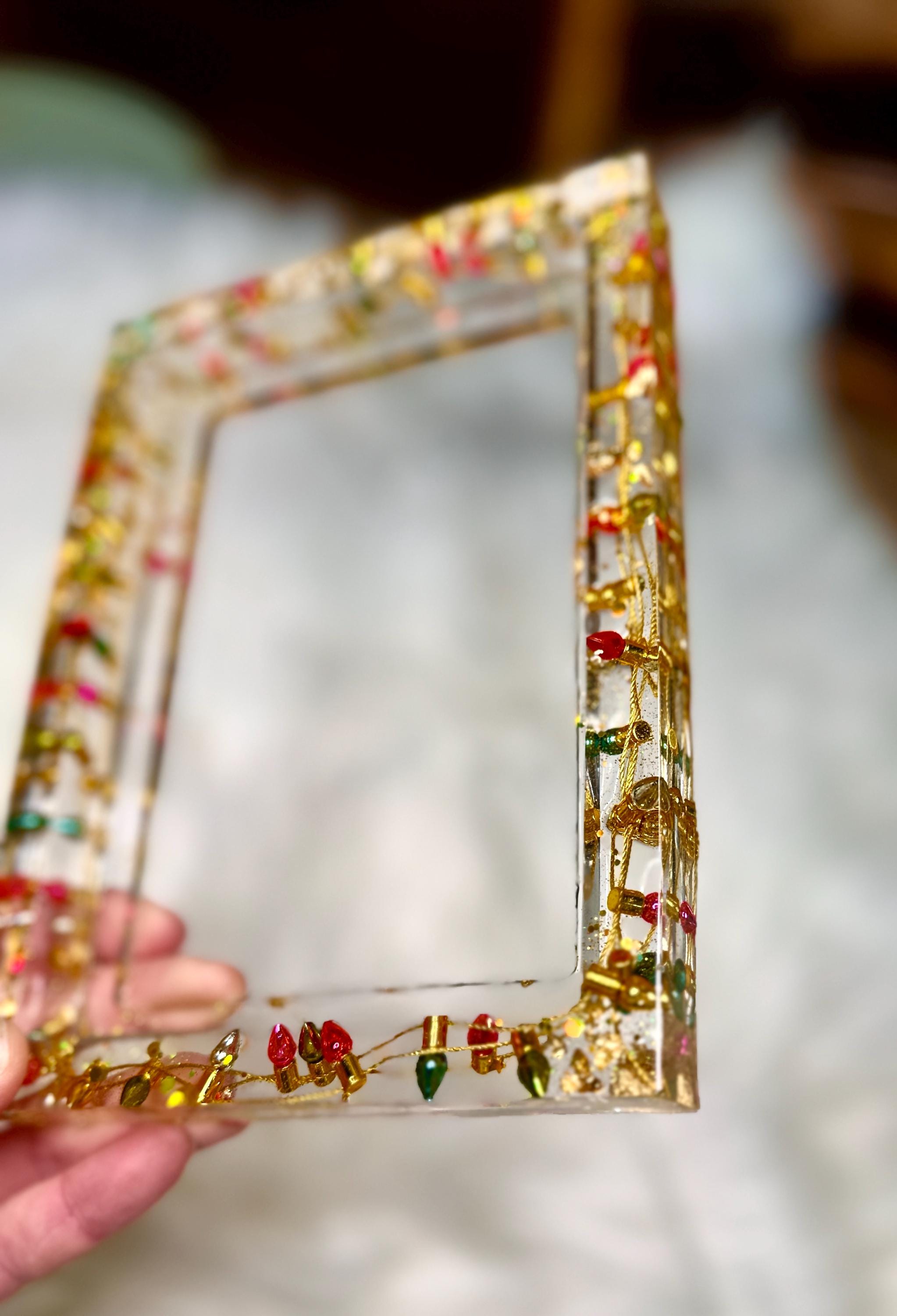 🎄 Sparkling Christmas Decor: Handmade Resin Photo Frame with 3D Festive Lights Capture the bright spirit of the season with this truly unique, handcrafted 3D Resin Christmas Picture Frame! This festive photo frame features a captivating, three-dimensional effect where colorful, decorative elements (that resemble mini holiday lights) are permanently embedded right into the clear epoxy resin.