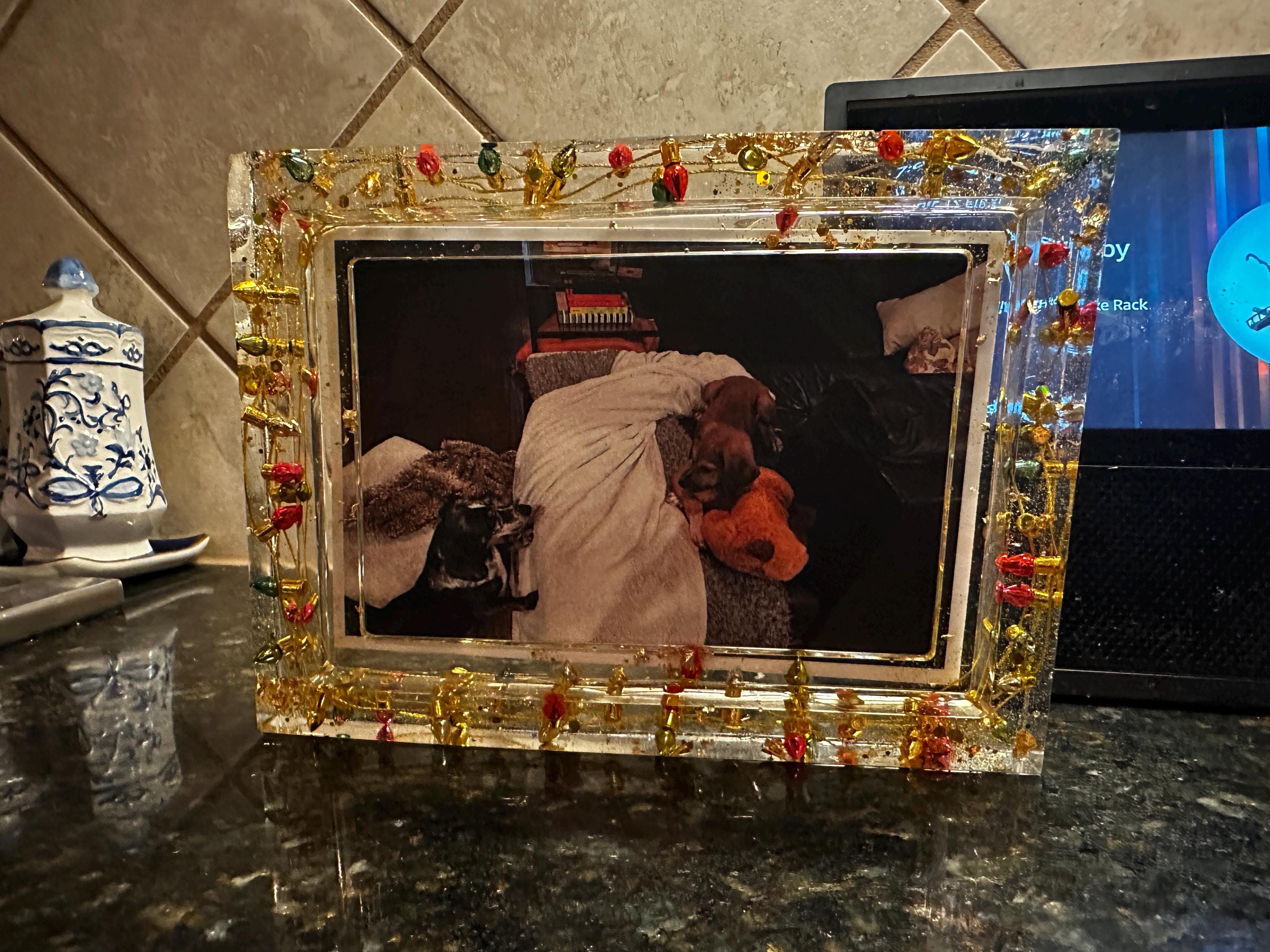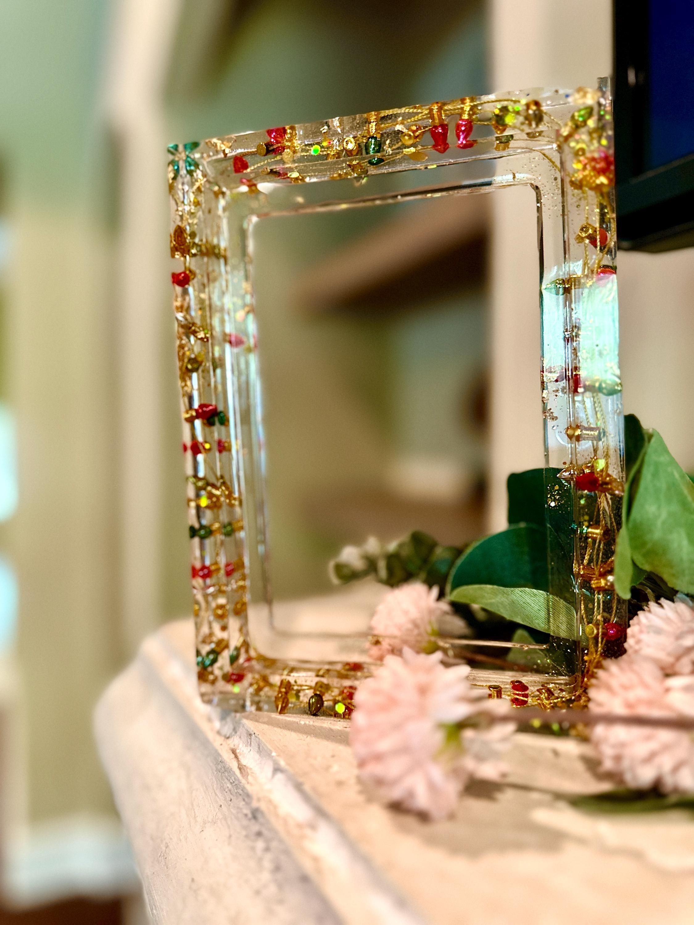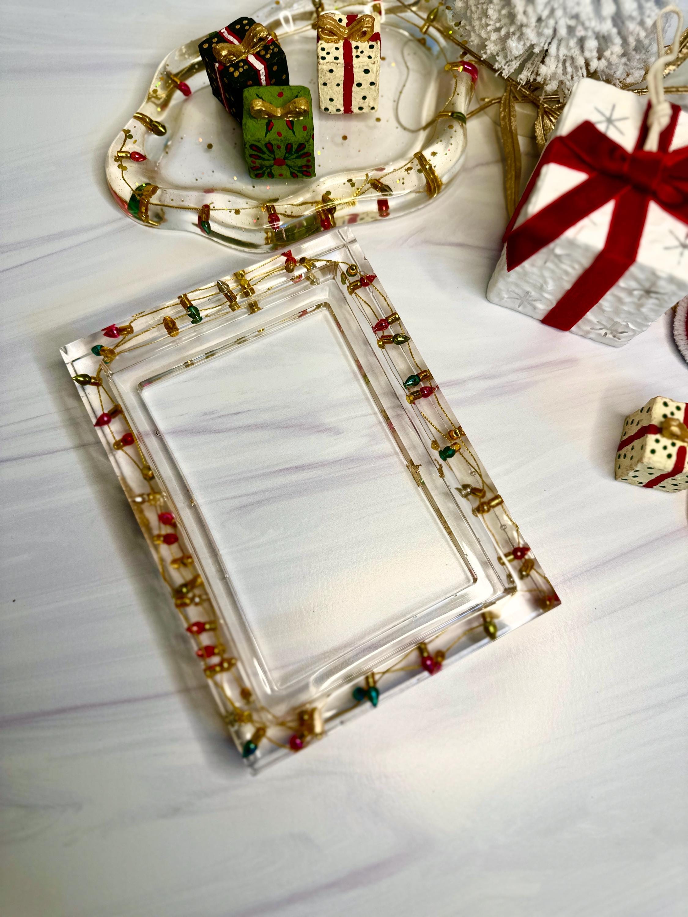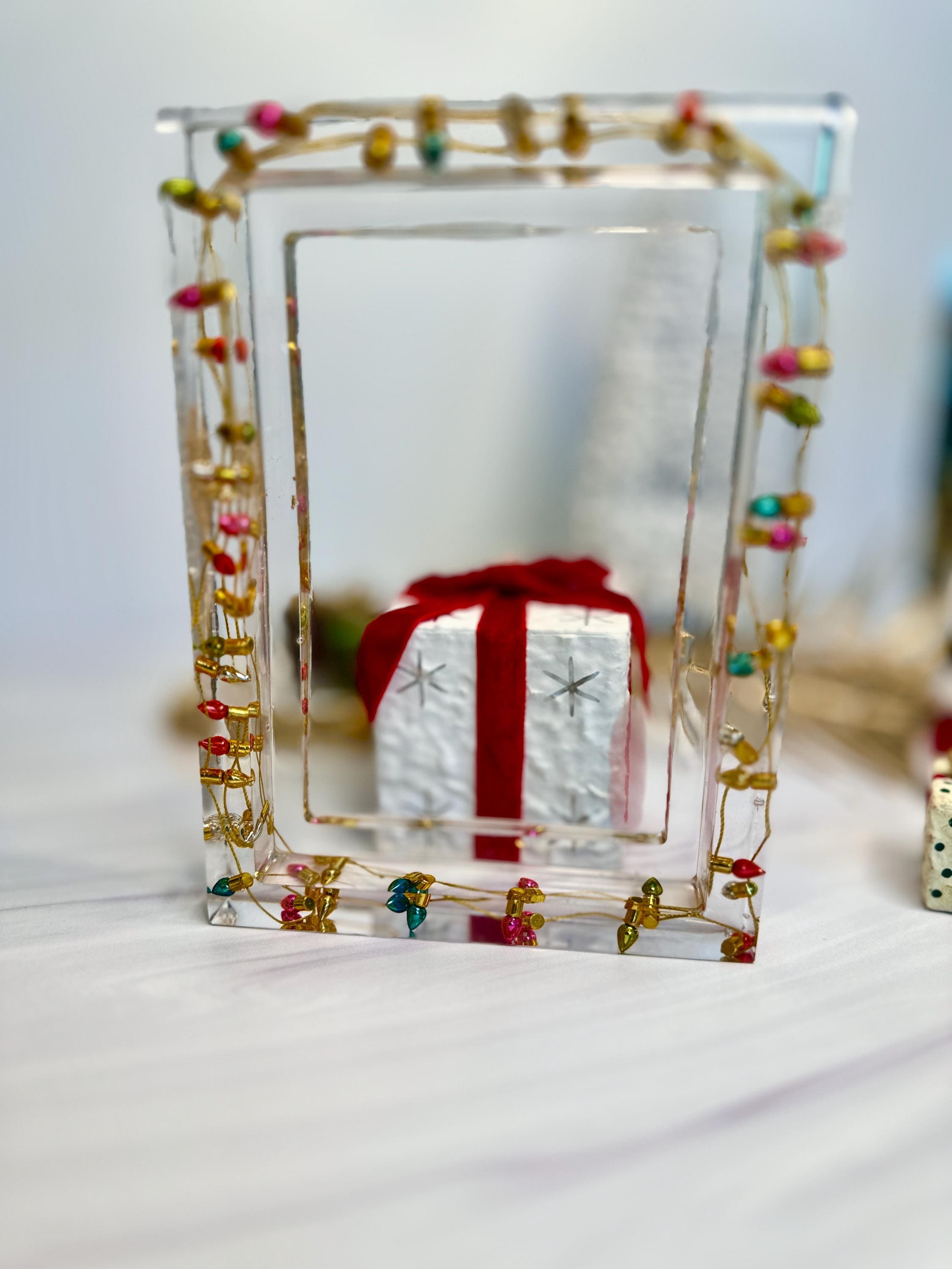 🎄 Sparkling Christmas Decor: Handmade Resin Photo Frame with 3D Festive Lights Capture the bright spirit of the season with this truly unique, handcrafted 3D Resin Christmas Picture Frame! This festive photo frame features a captivating, three-dimensional effect where colorful, decorative elements (that resemble mini holiday lights) are permanently embedded right into the clear epoxy resin.
