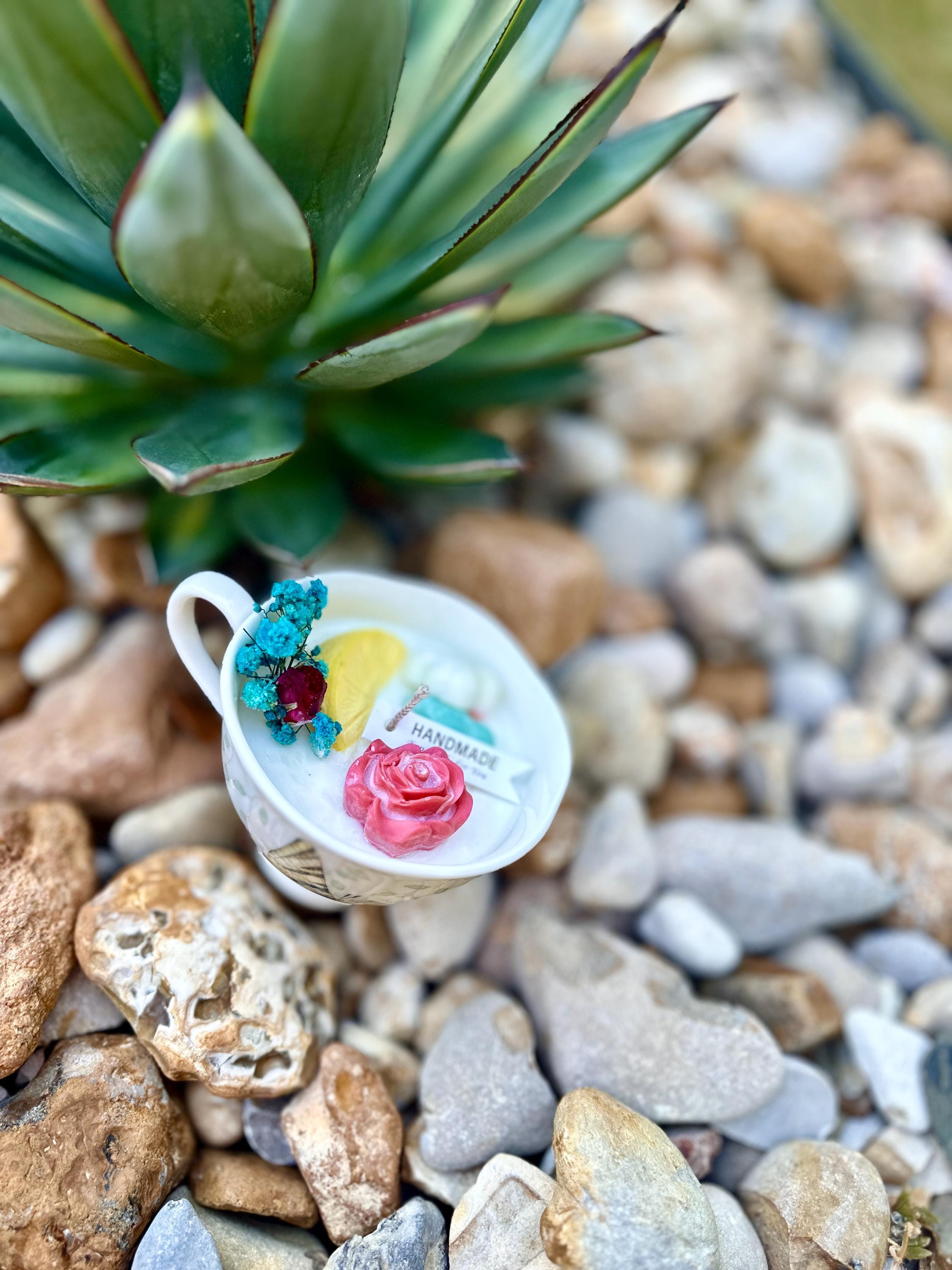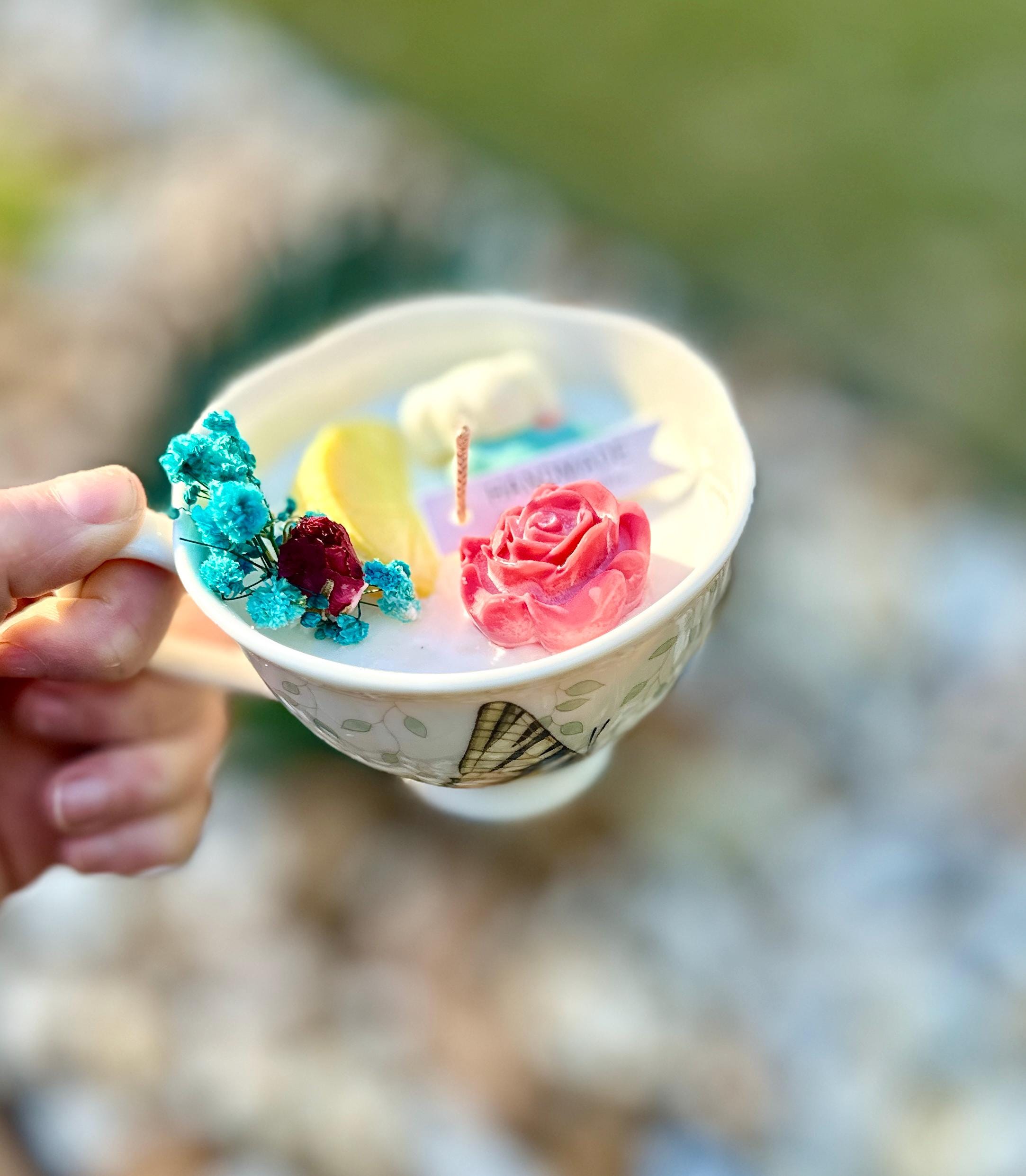 The "tea" itself is composed of white wax, with stunning blue dried flowers gently peeking out.