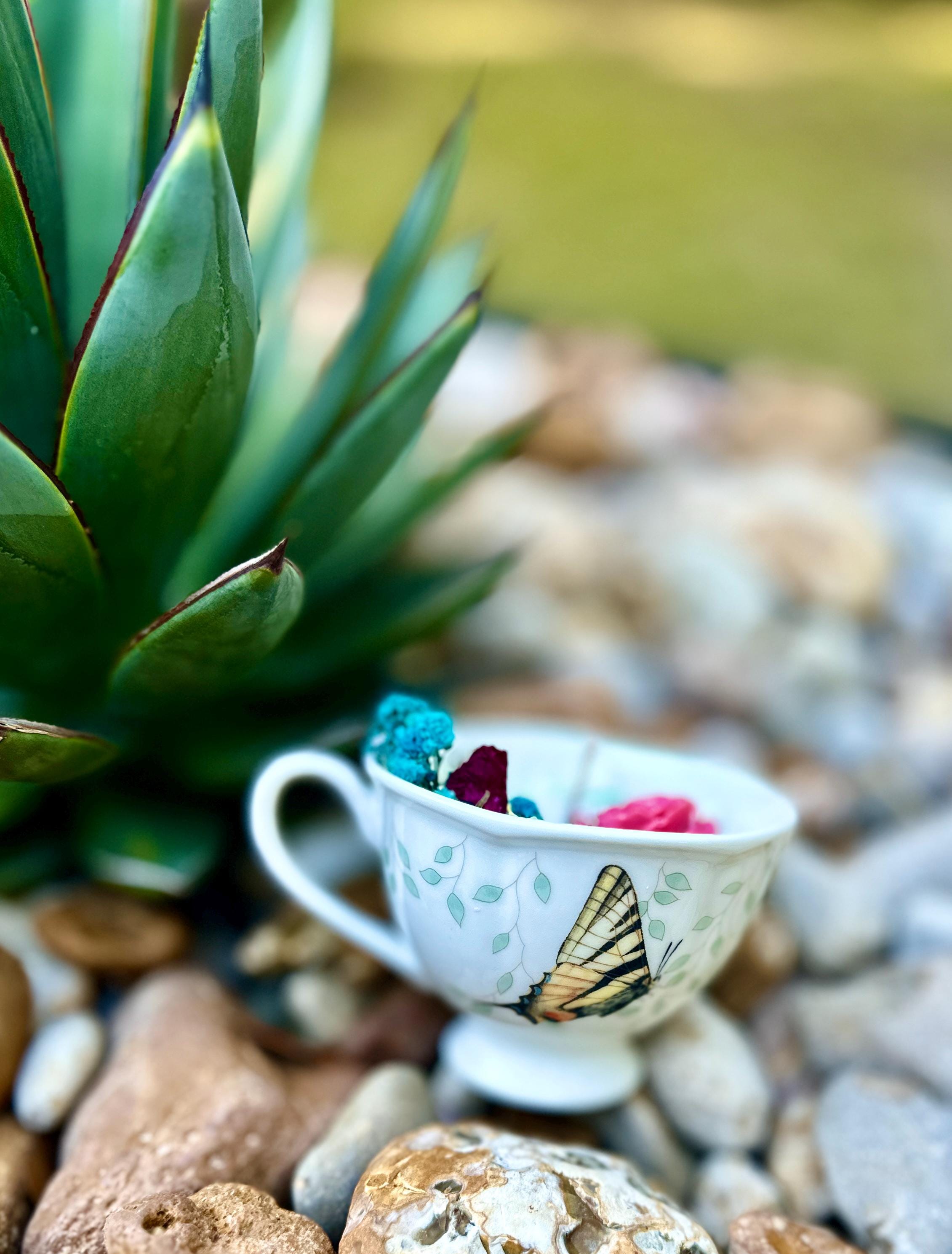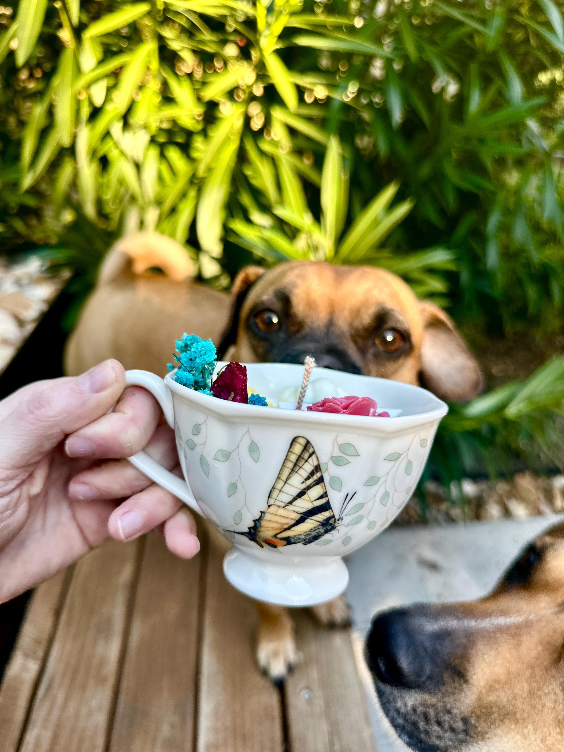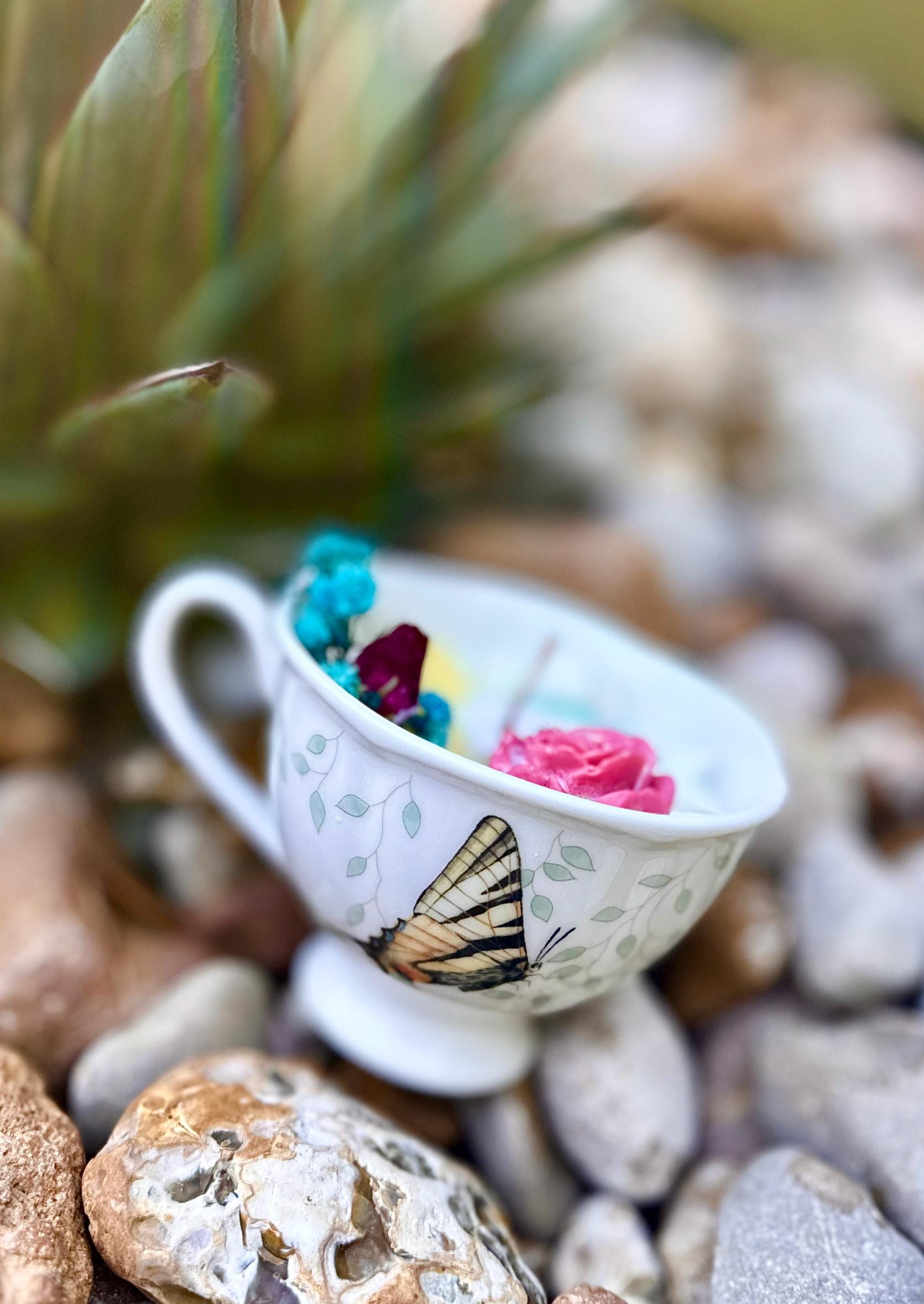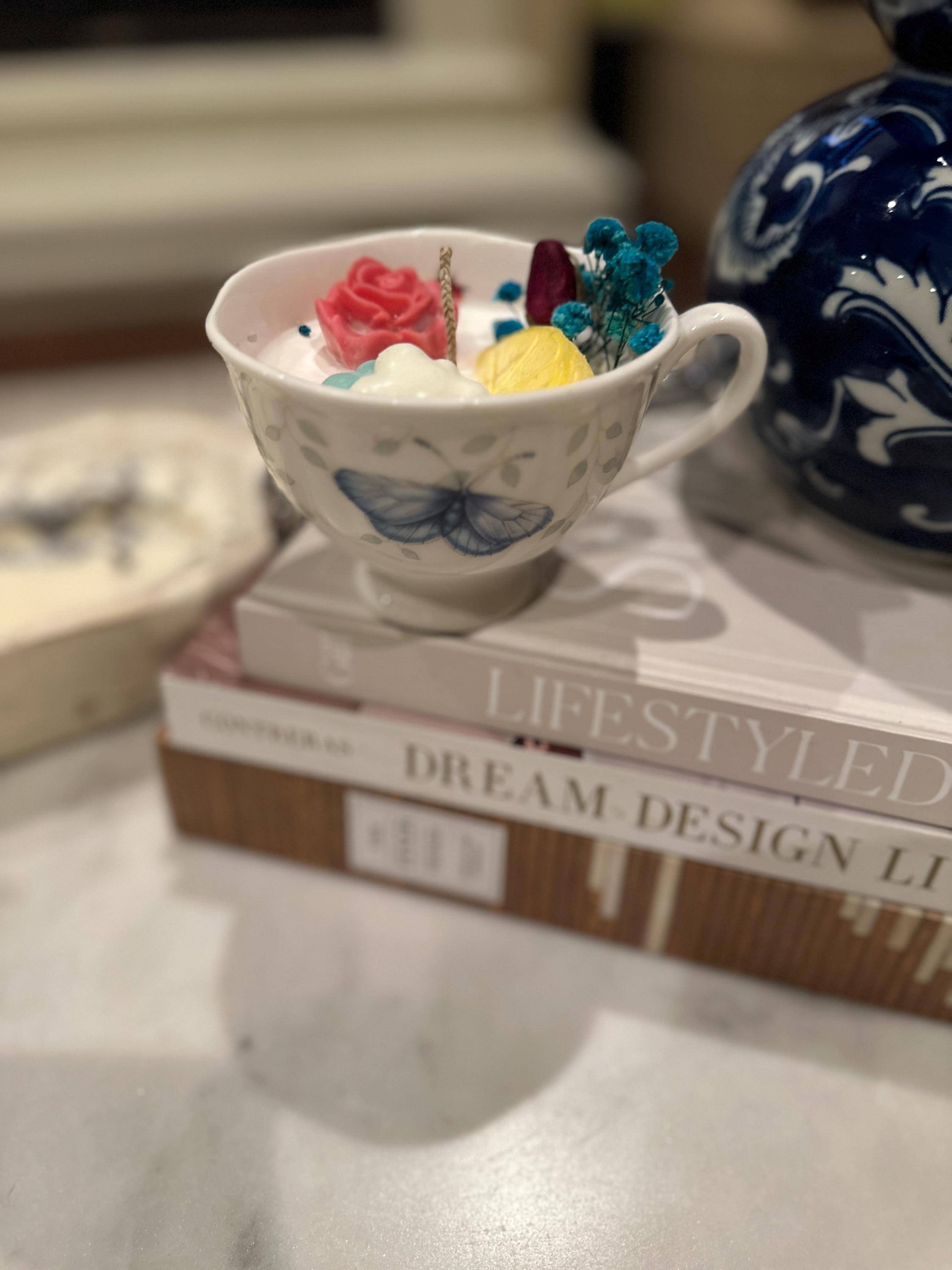 Care Instructions: For the best experience, allow the first burn pool to reach the edge of the teacup. Keep wick trimmed to 1/4 inch. Once the candle has been enjoyed, the beautiful teacup can be cleaned and reused!