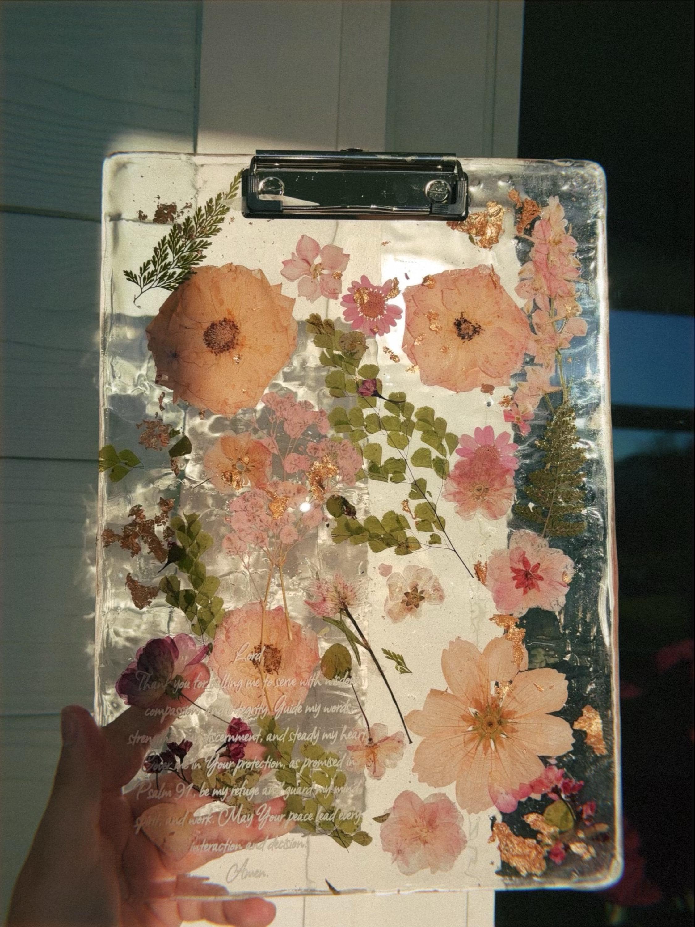 First off, Jamie was so intentional in ensuring the clip board was how I wanted it. She responded so quickly and provided many options to choose from. She is a gem!! Then when I received it the wrapping is so cute!! I loved the personal note, it was so intentional and felt so good to receive. The clip board itâs self is breath taking. I loved the unique design the different flowers..it is so pleasing the the eye. The prayer is so beautiful and I love how personal it is to me. I am recommending to all of the clinicians who work in my office!! â¤ď¸
