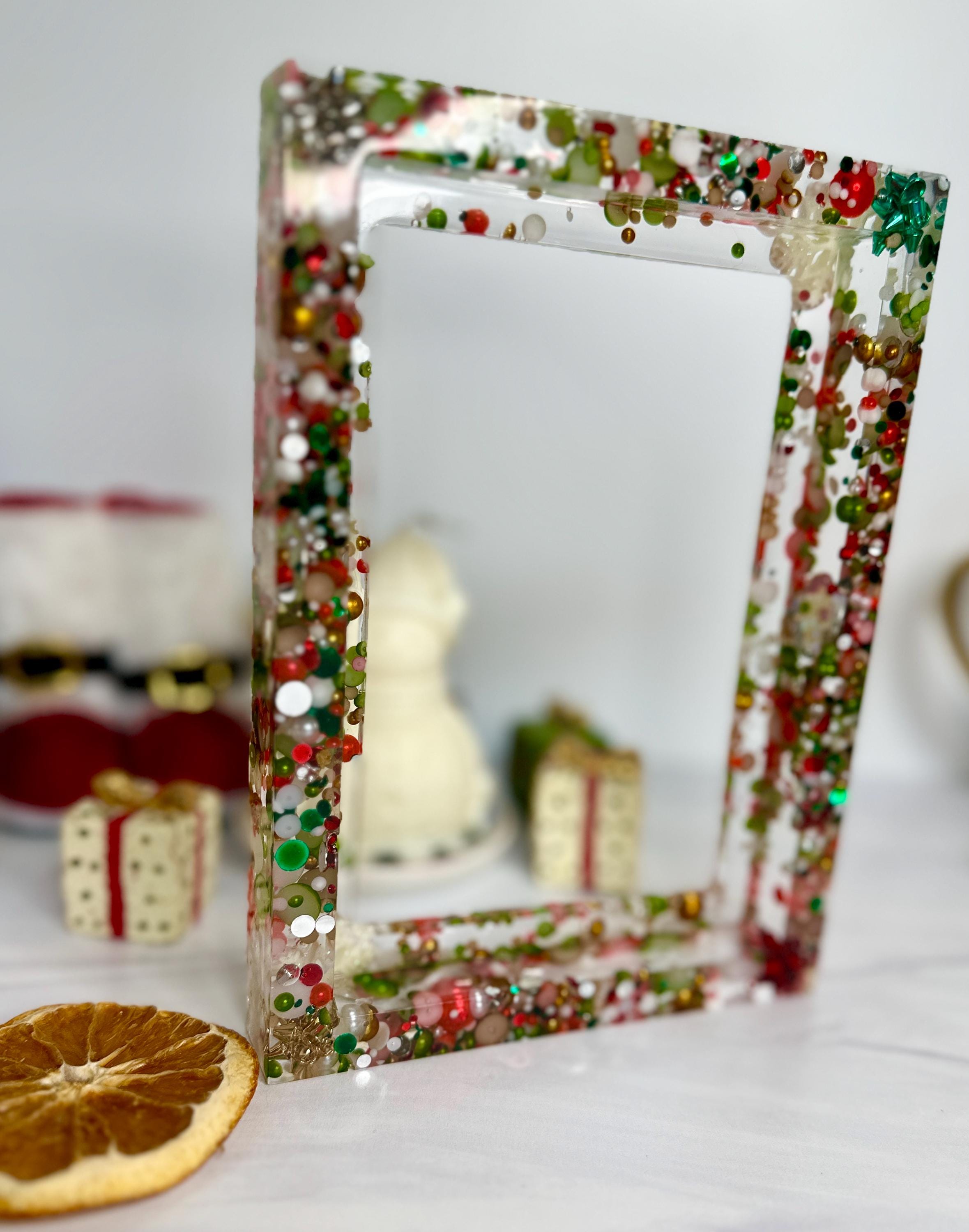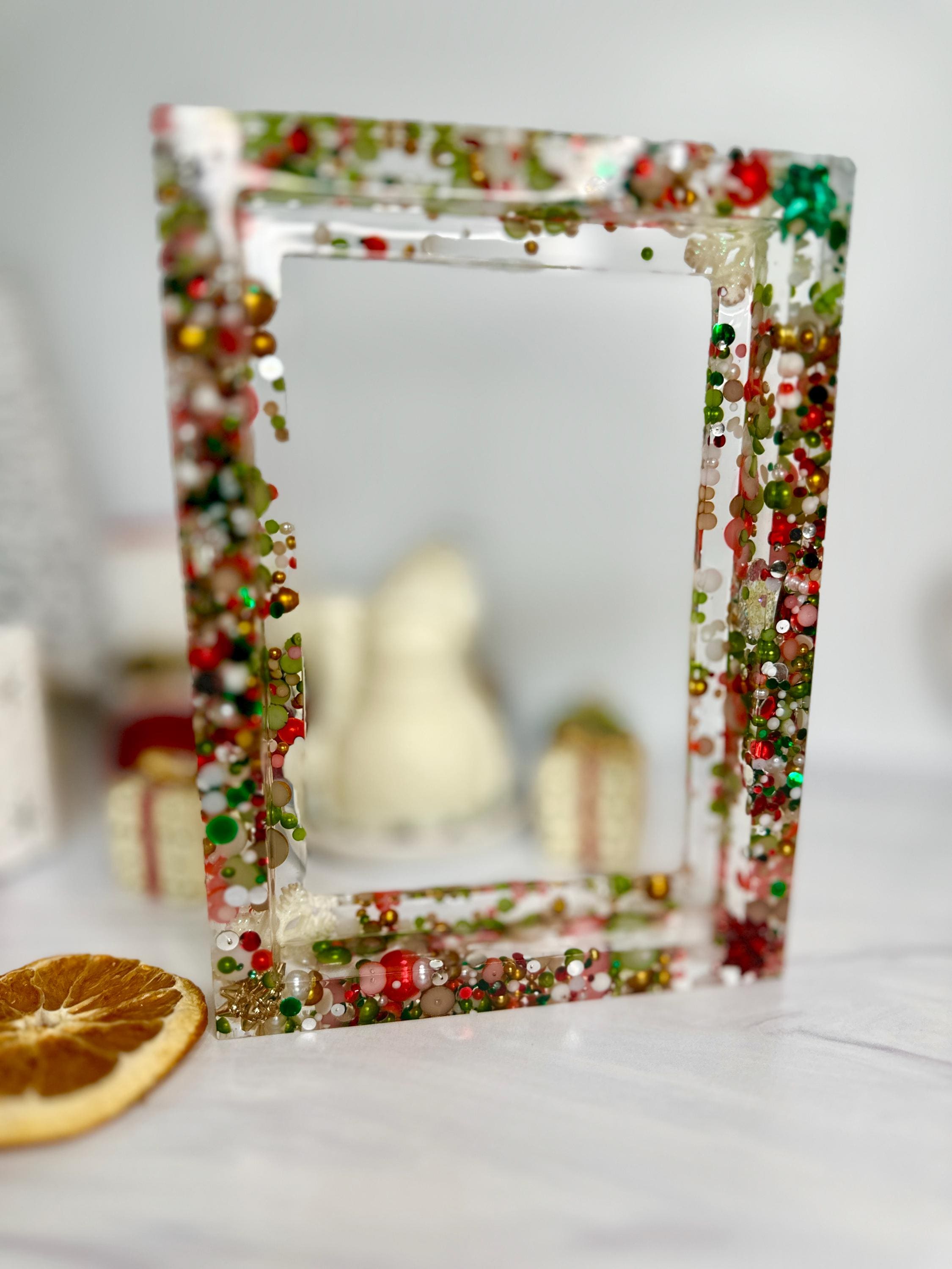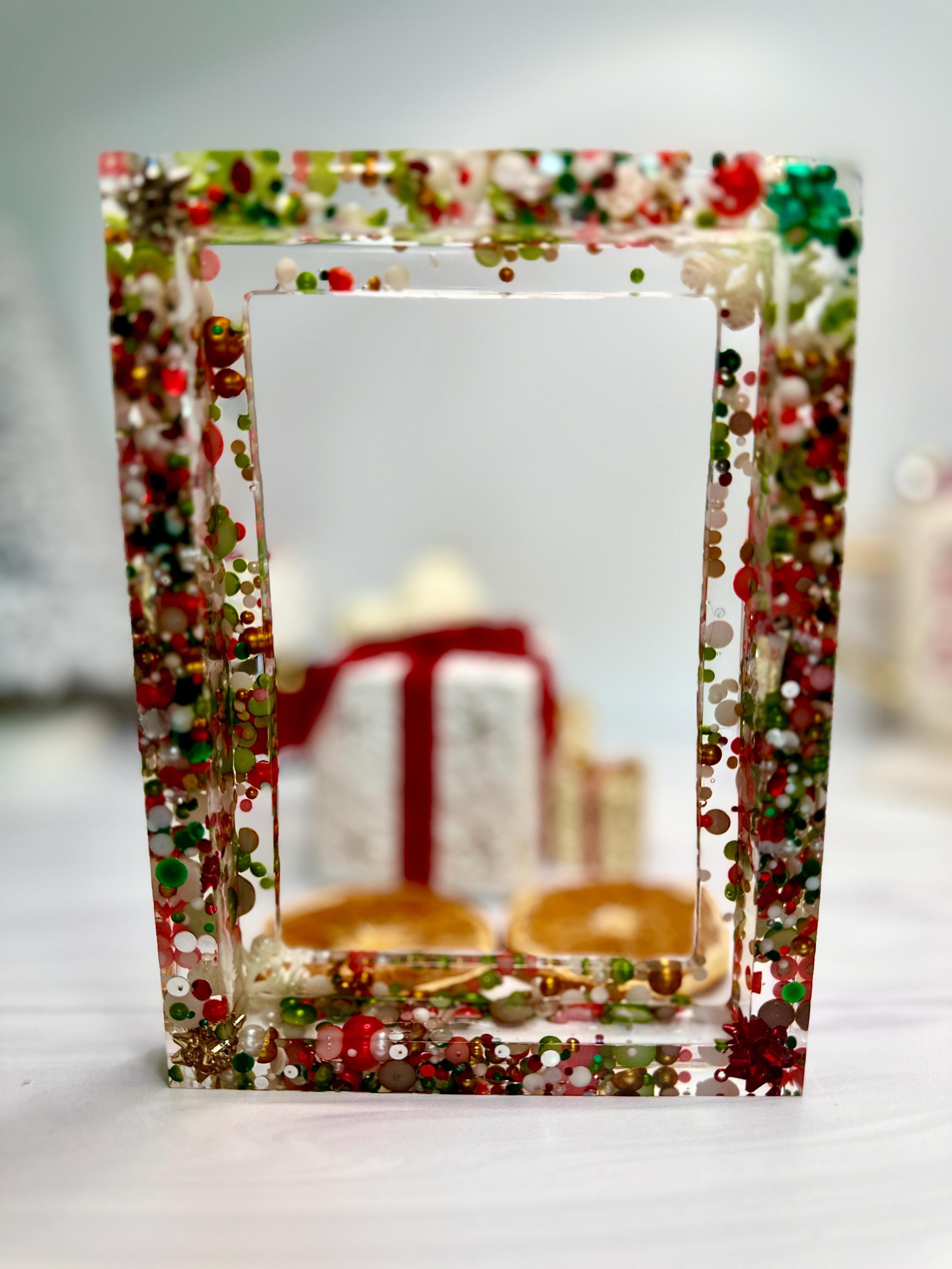 Materials: Premium Epoxy Resin, Assorted Festive Baubles, Beads, Glitter, Snowflakes, and Ribbons.