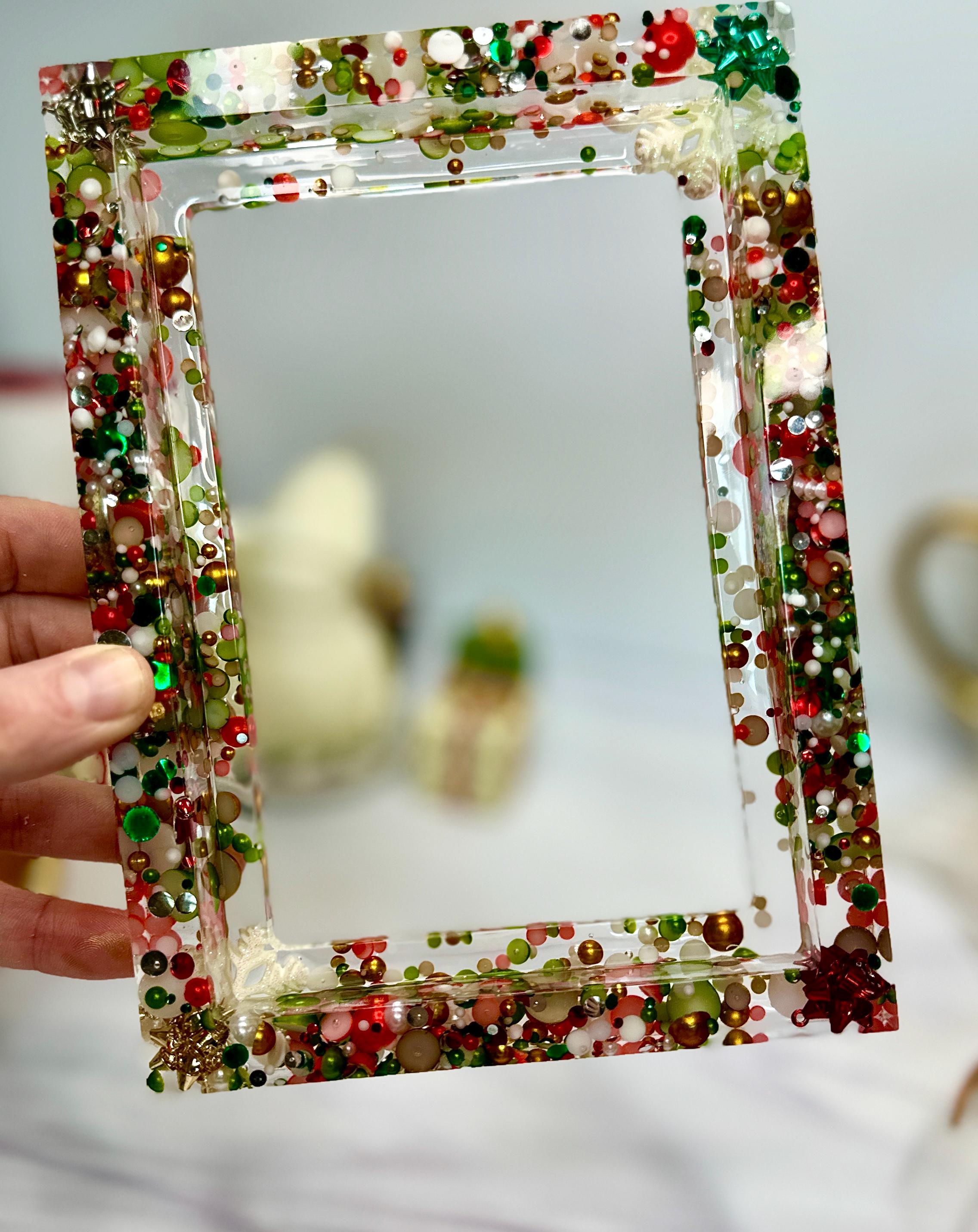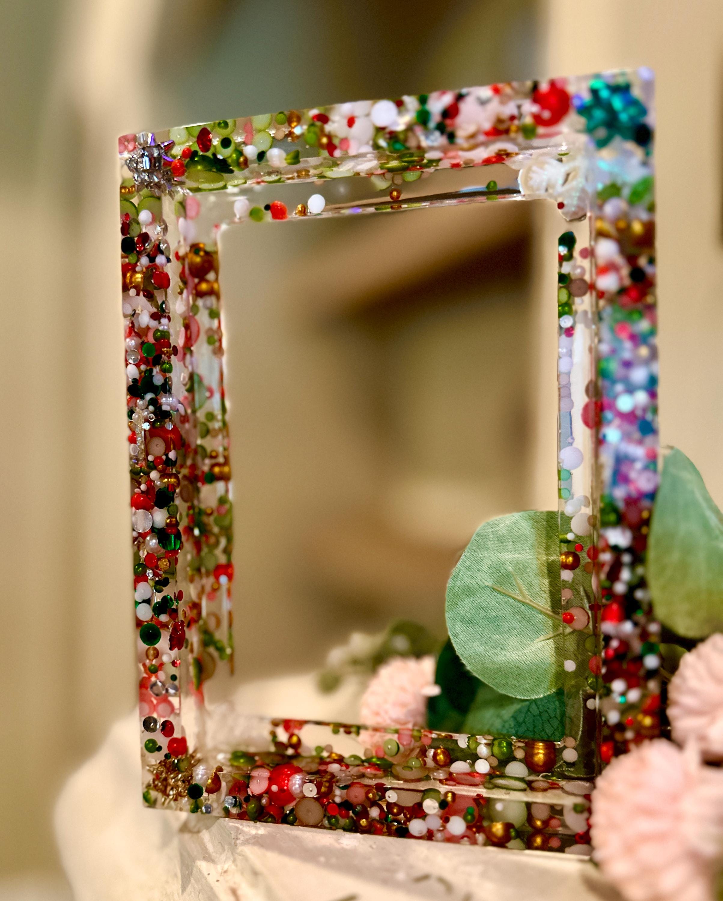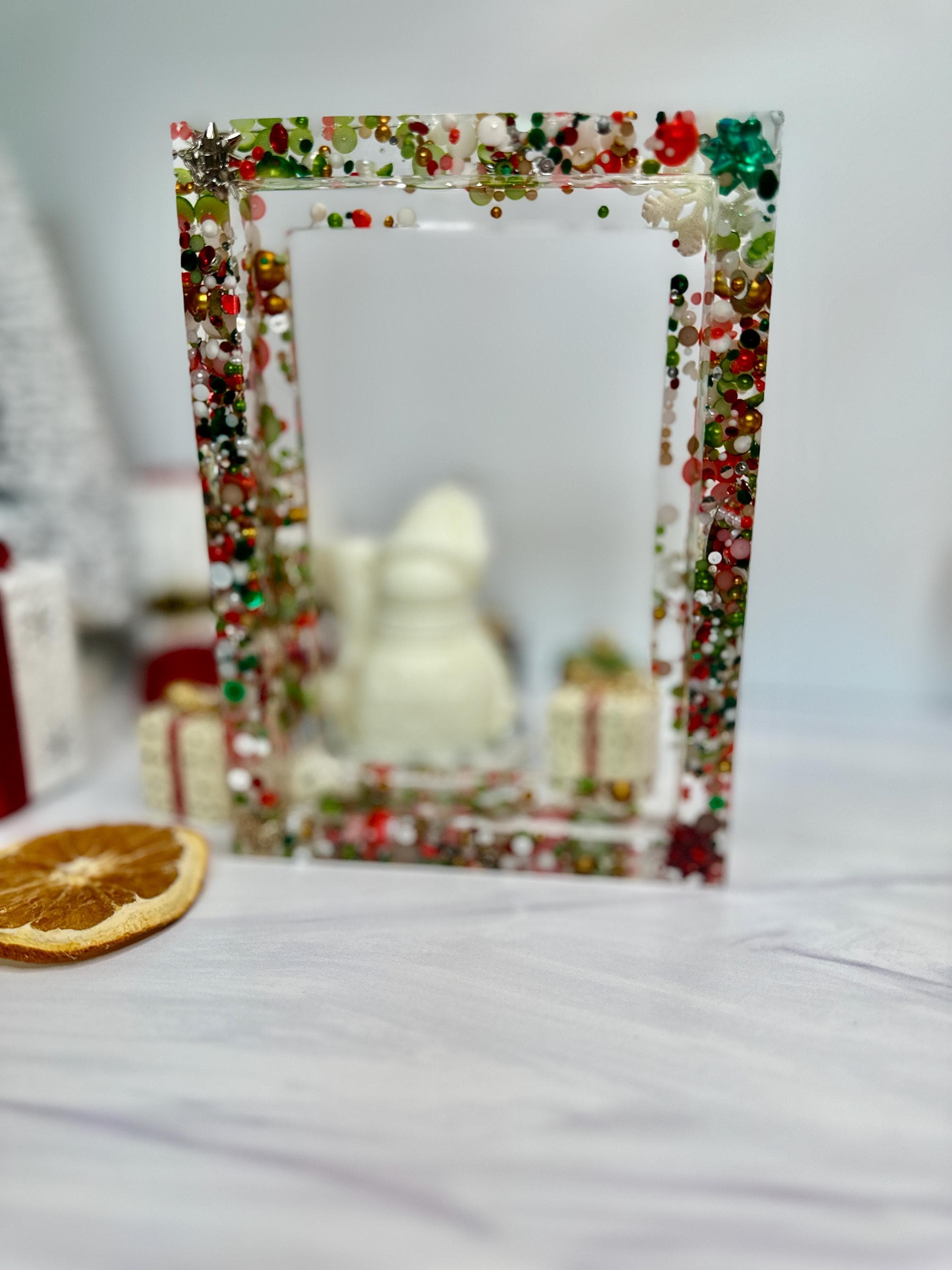 Materials: Premium Epoxy Resin, Assorted Festive Baubles, Beads, Glitter, Snowflakes, and Ribbons.