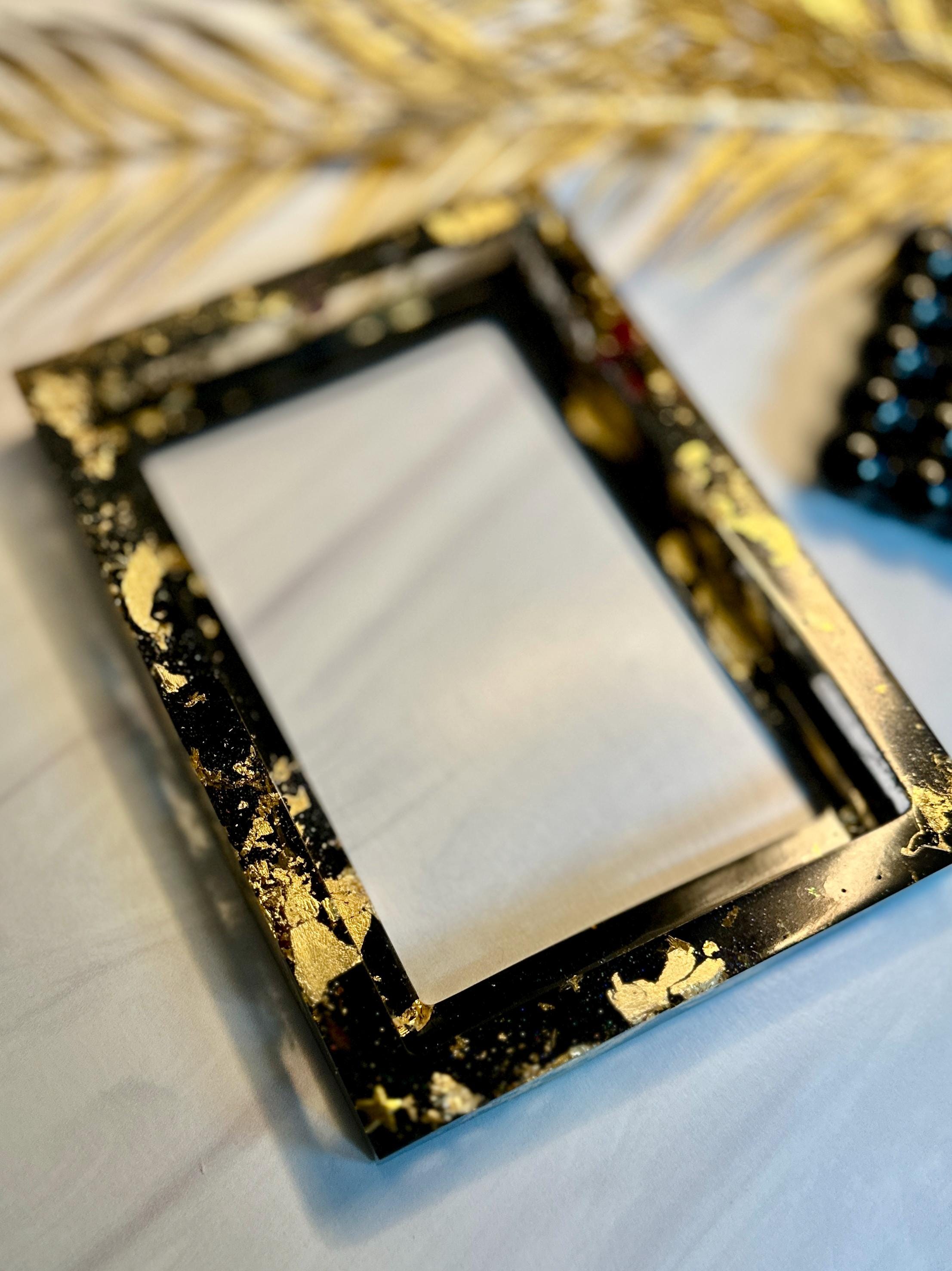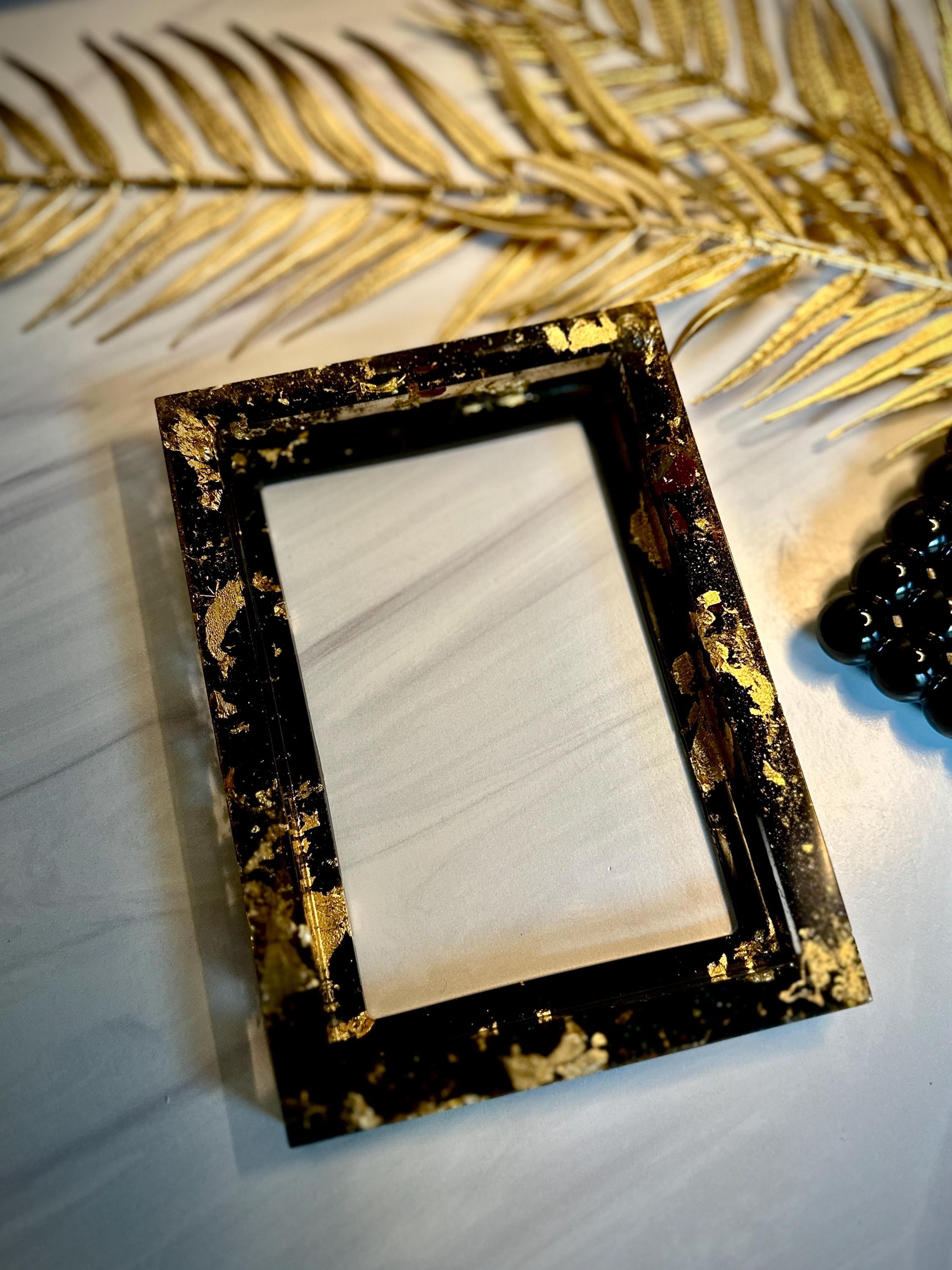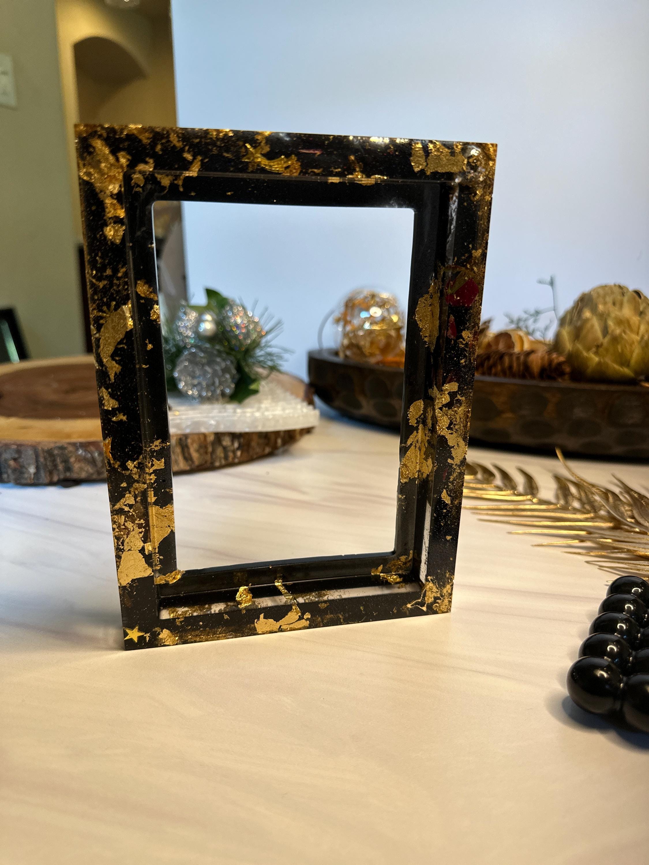 Black & Gold Luxe Resin Open Back Frame: Glitz, Glam, and Enduring Sophistication Welcome to the ultimate statement piece for your desk, mantel, or gallery wall! Our handmade Black Resin Open Back Picture Frame is the epitome of modern luxury, designed to capture attention and elevate any photo it displays.