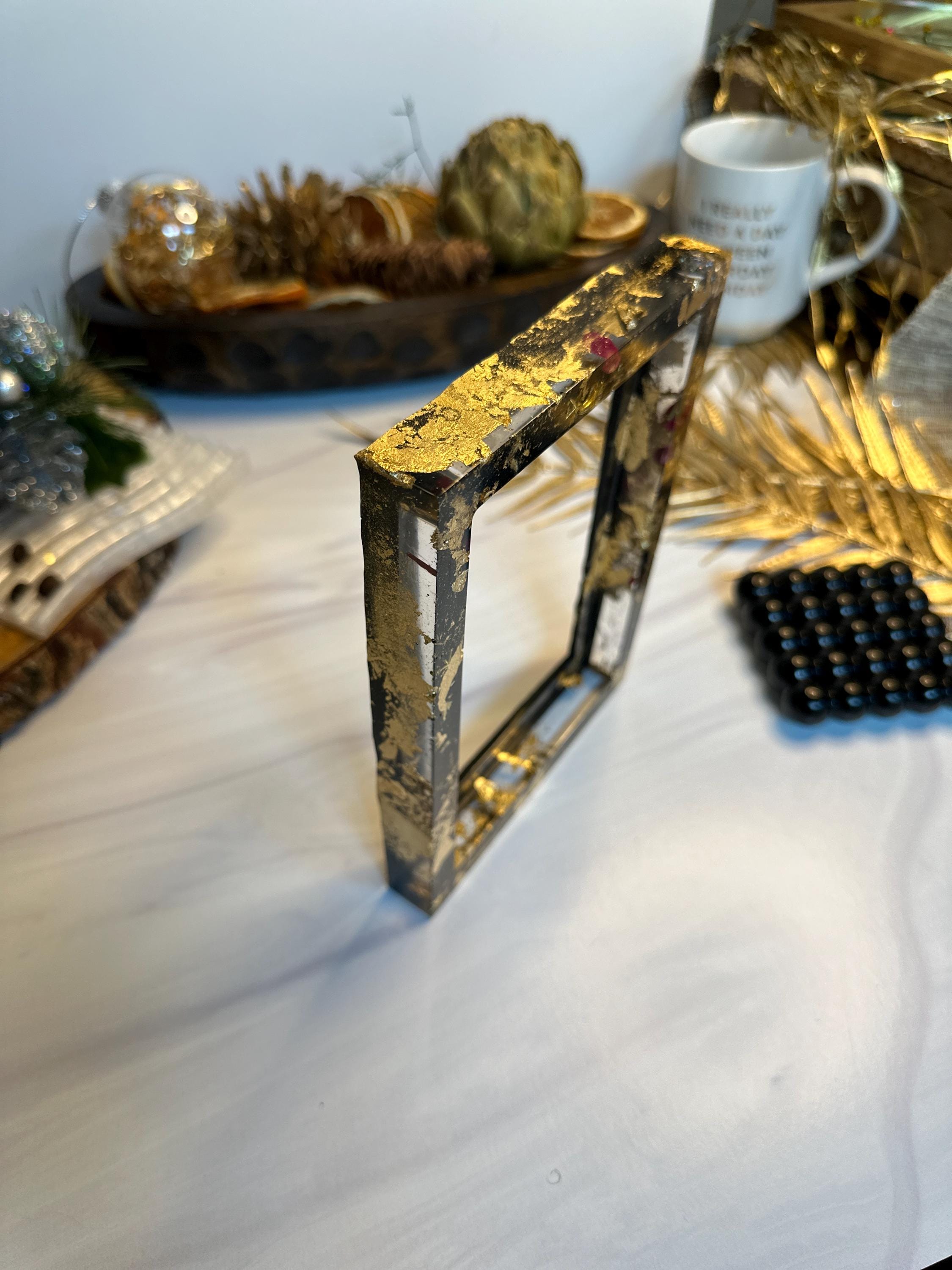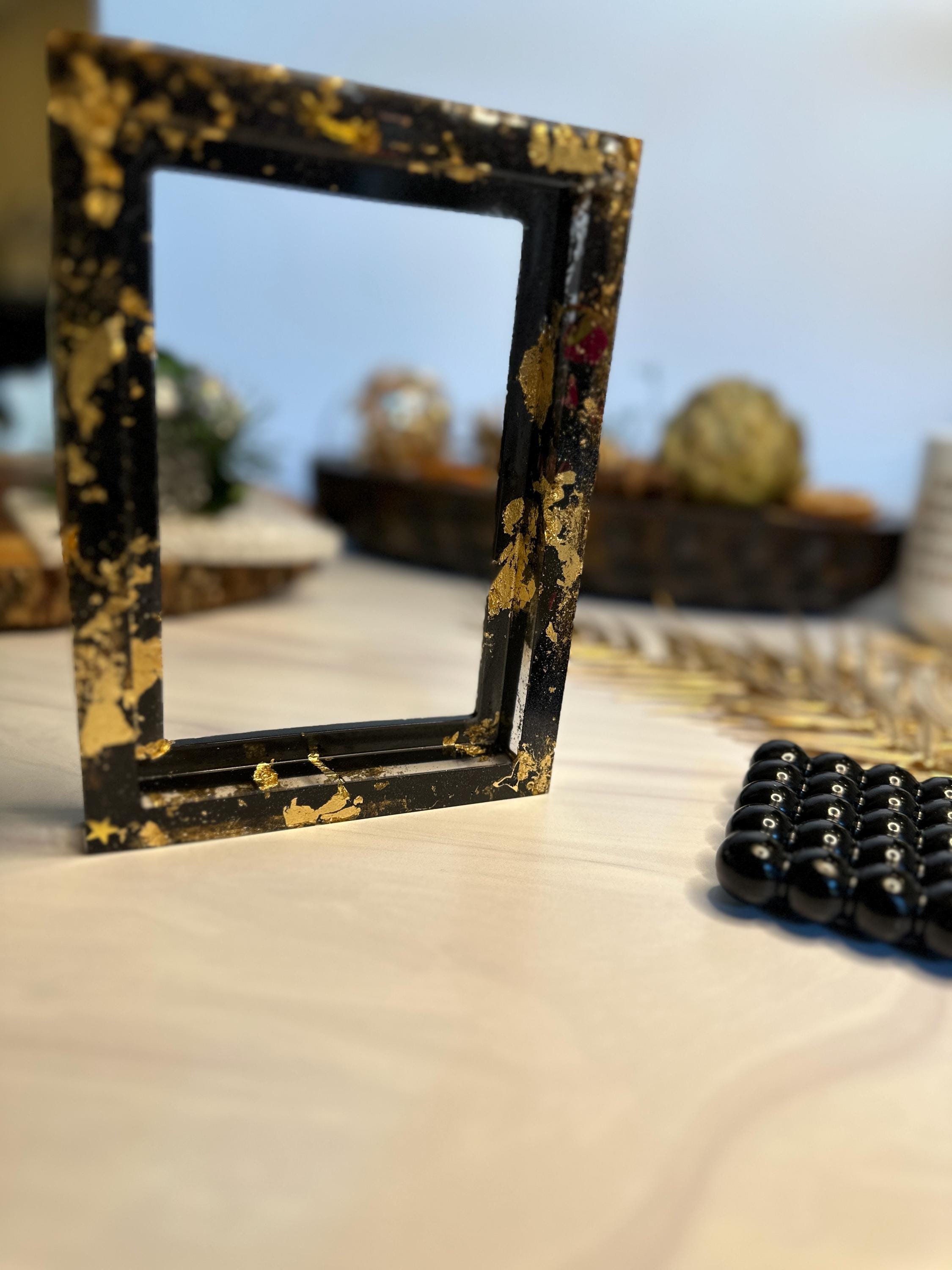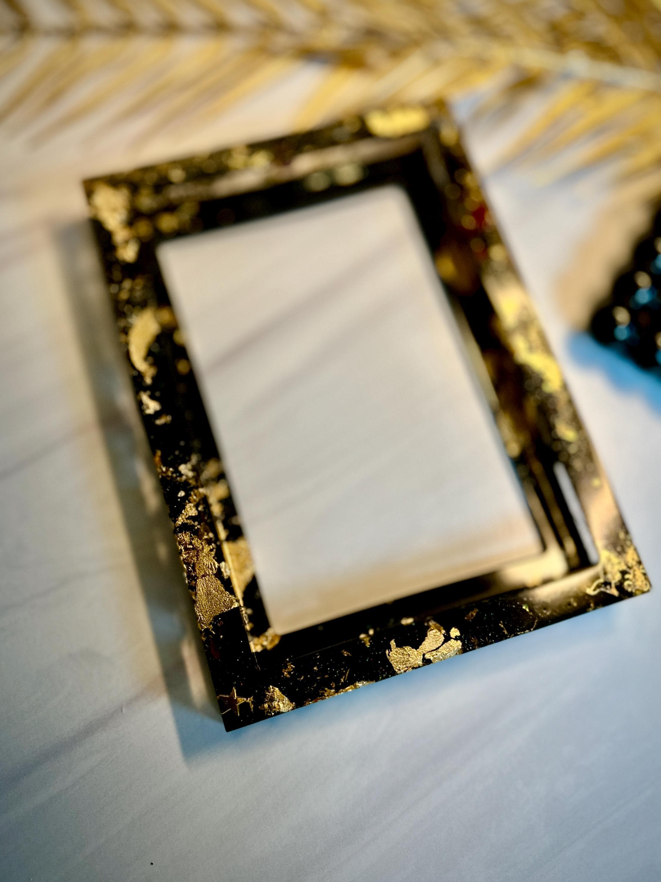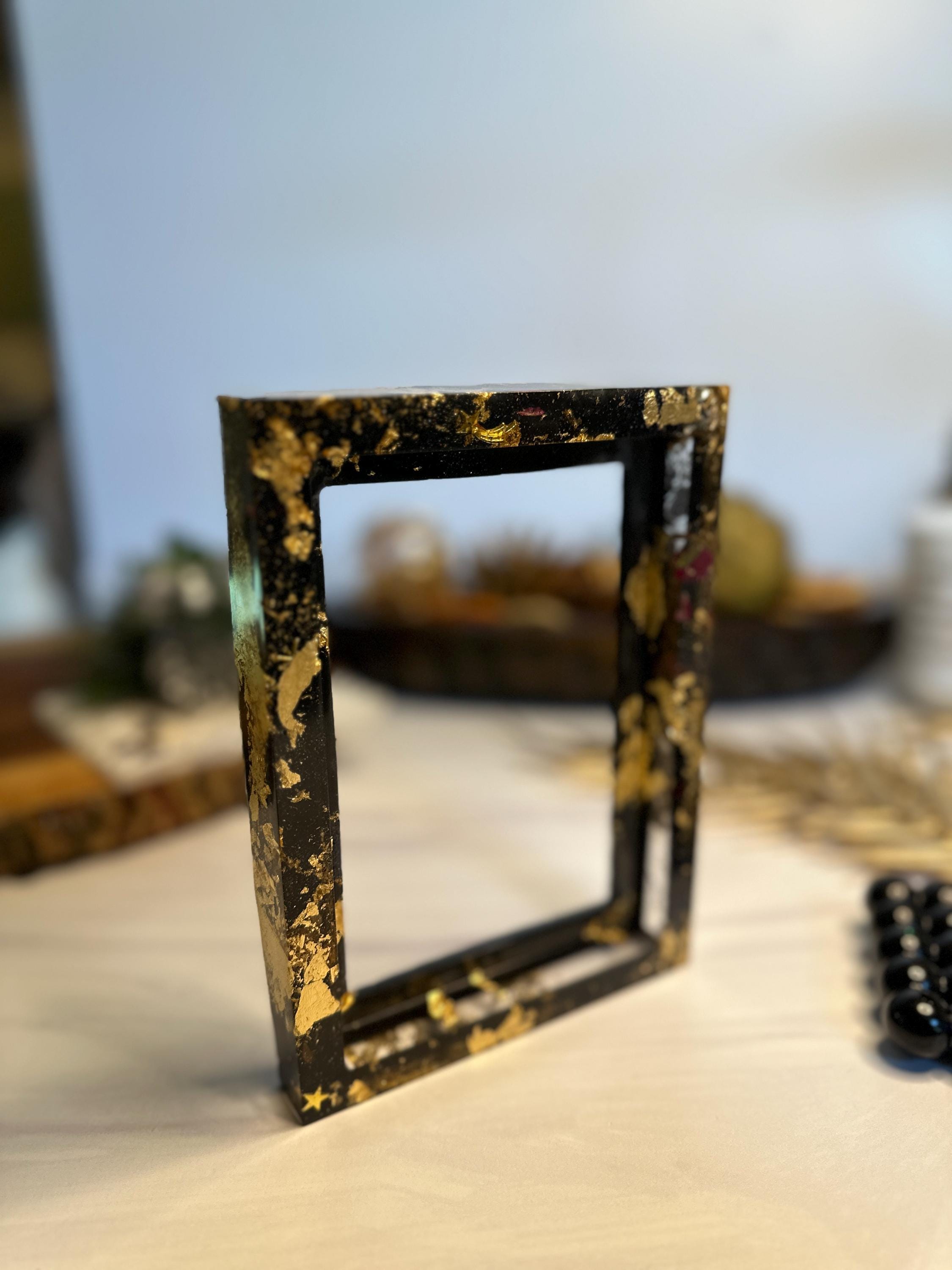 Black & Gold Luxe Resin Open Back Frame: Glitz, Glam, and Enduring Sophistication Welcome to the ultimate statement piece for your desk, mantel, or gallery wall! Our handmade Black Resin Open Back Picture Frame is the epitome of modern luxury, designed to capture attention and elevate any photo it displays.