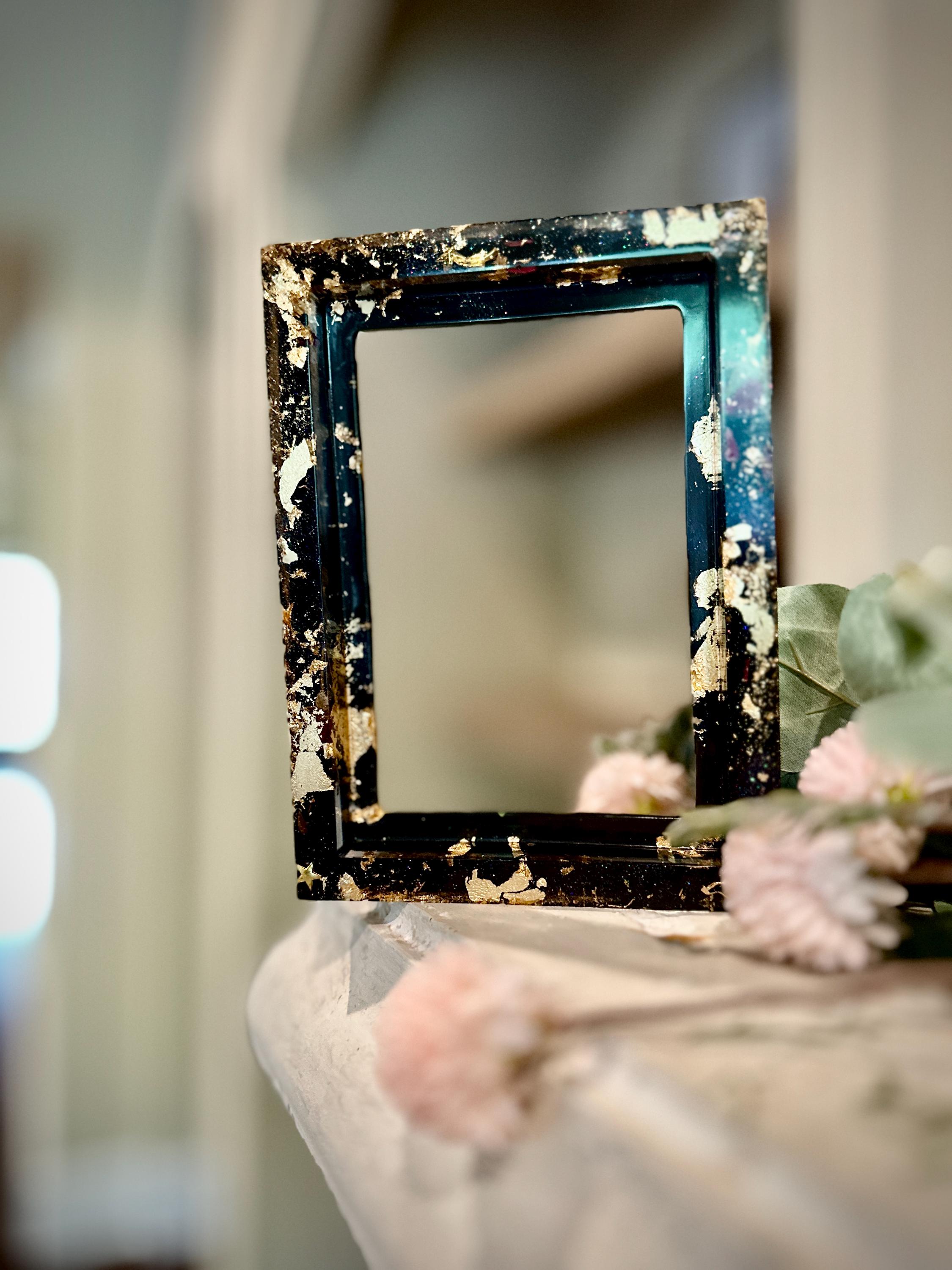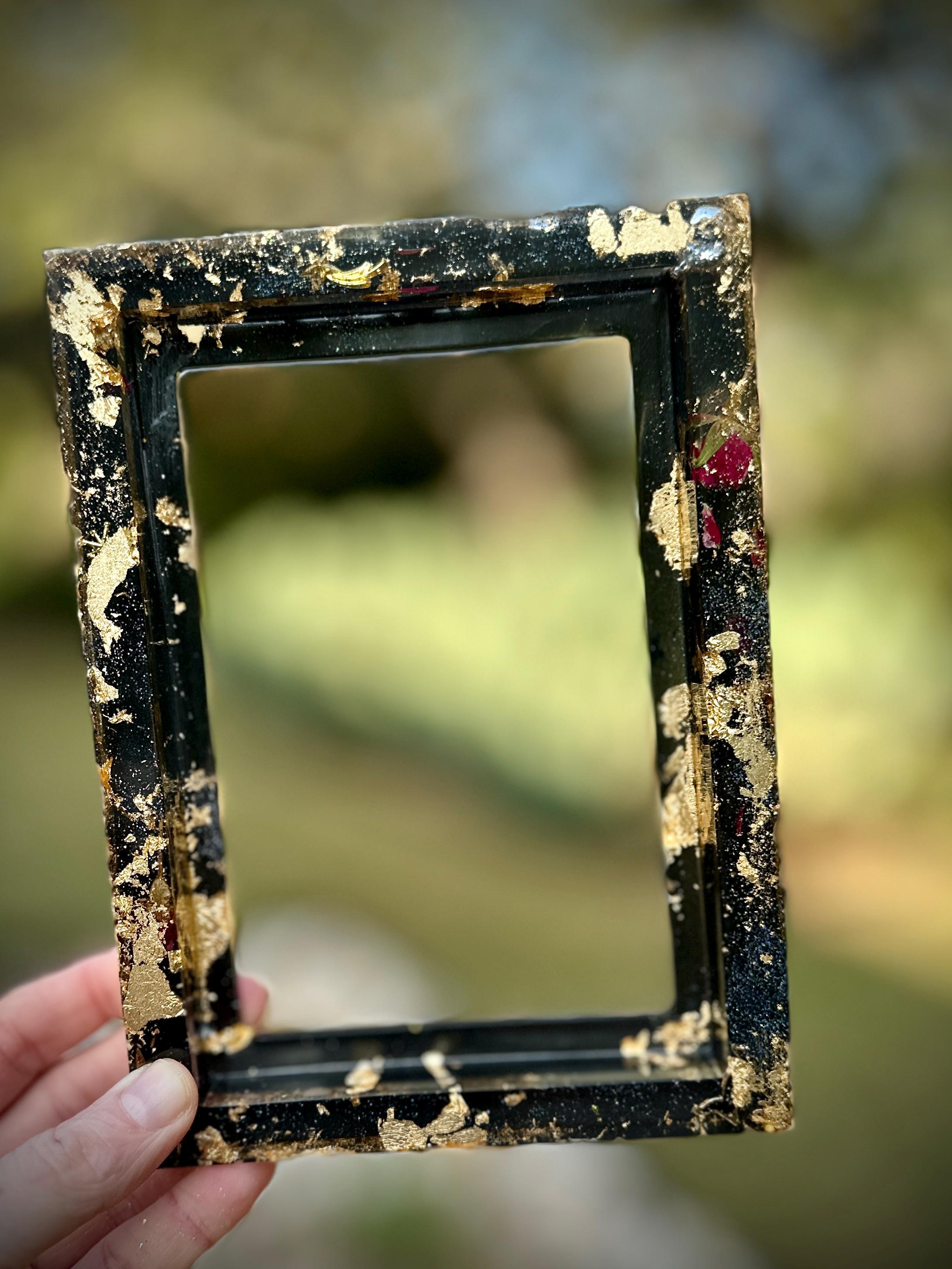 Why Our Frame is the Perfect Luxe Accent Intricate Gold Detailing: Each frame is meticulously crafted with hand-embedded genuine gold foil and subtle gold accents, creating a mesmerizing contrast against the deep, glossy black resin. The result is a stunning, sophisticated piece that shimmers with glitz and glam.