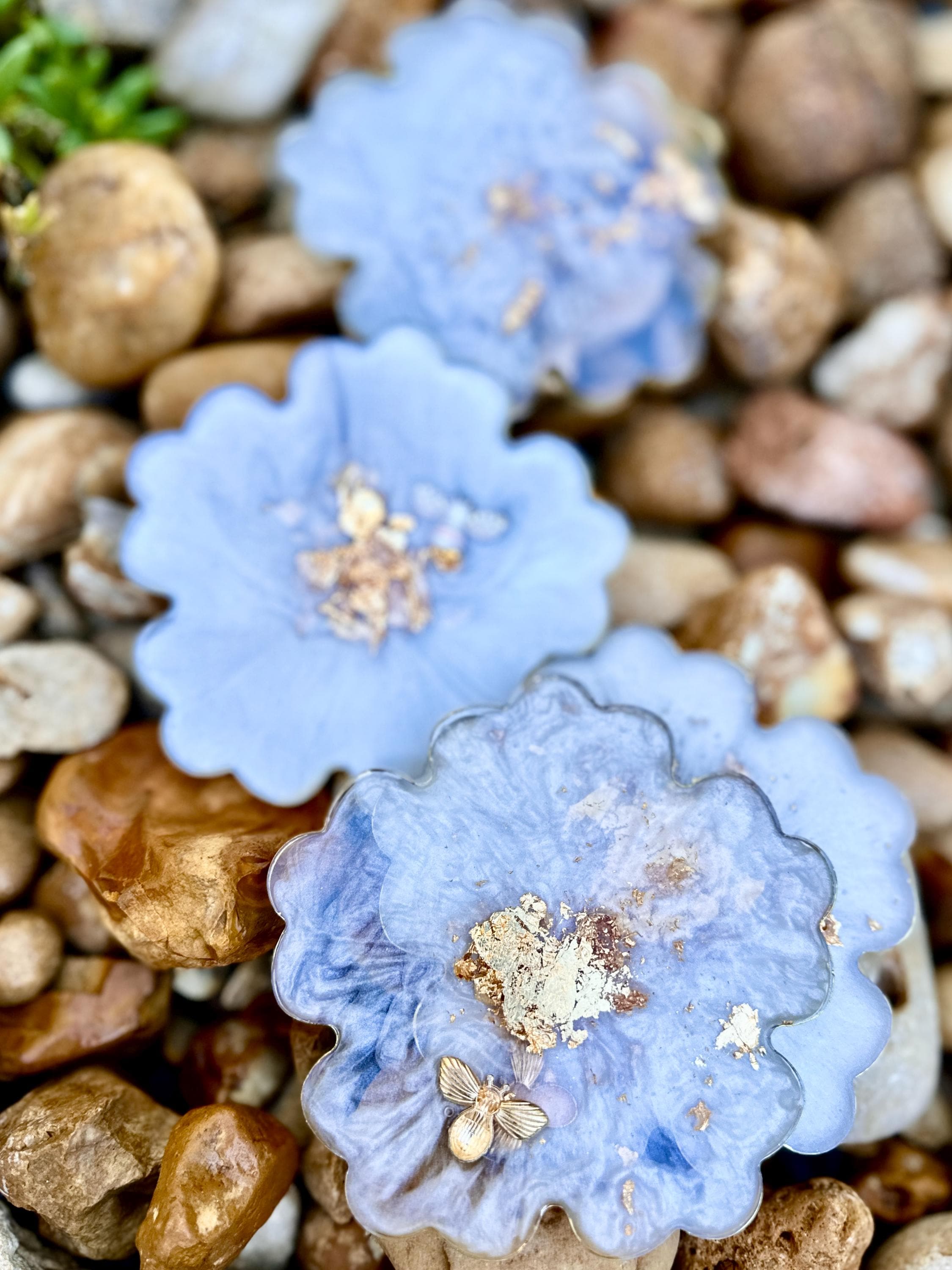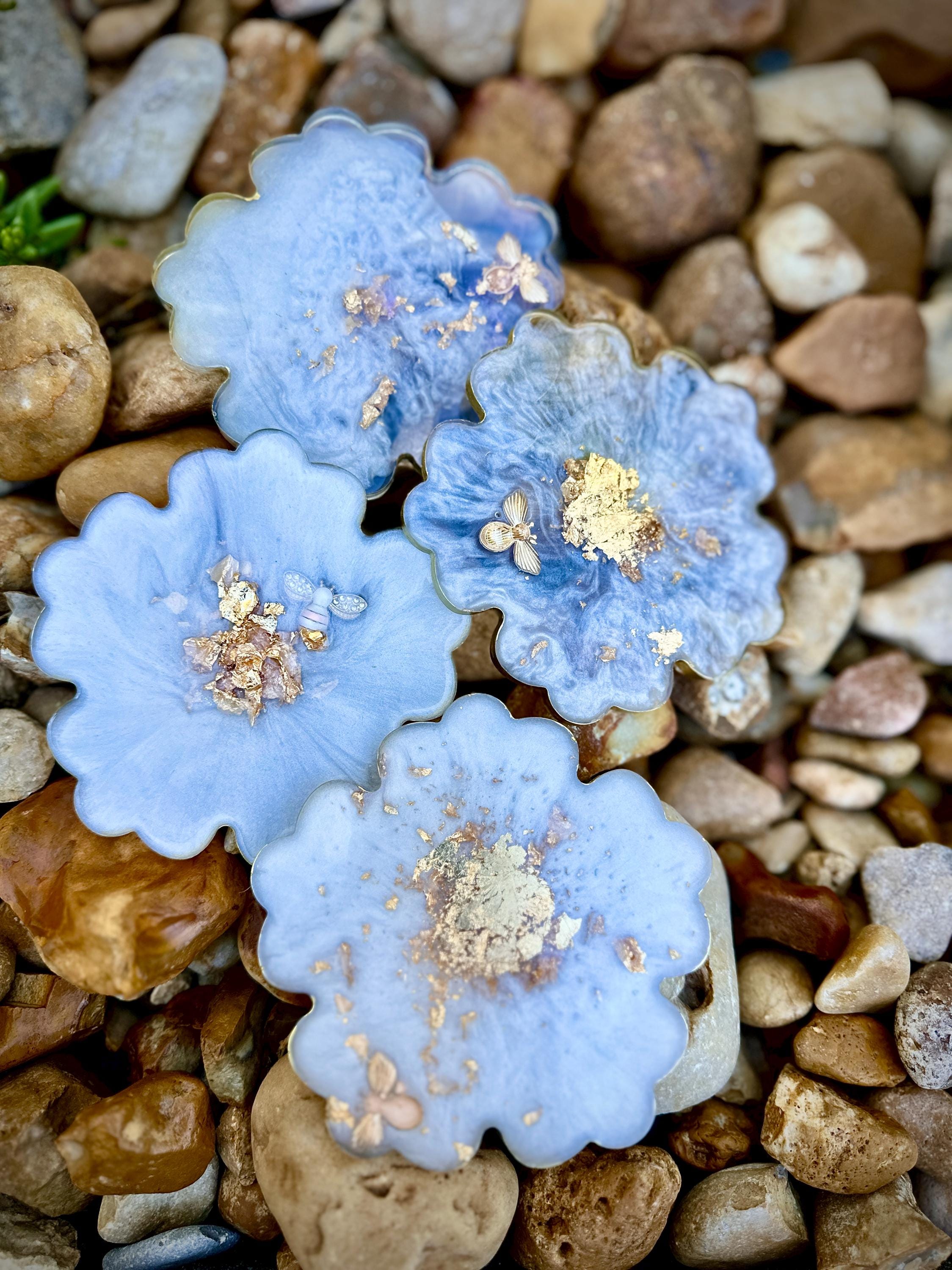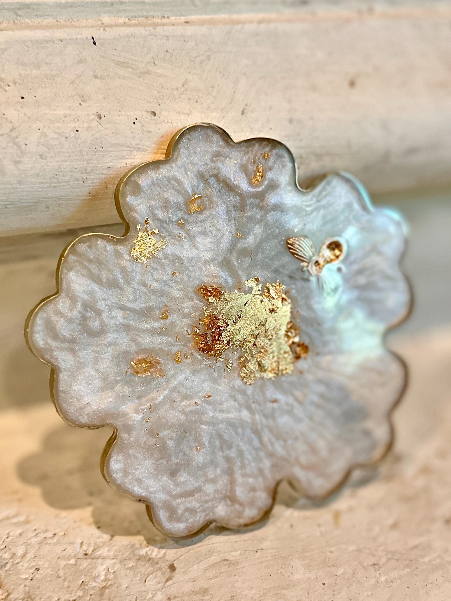 The Bumblebee Coaster: One special coaster in the set is embedded with a delicate, yet decadent gold and rhinestone-accented bumblebee—a perfect touch of whimsical luxury.