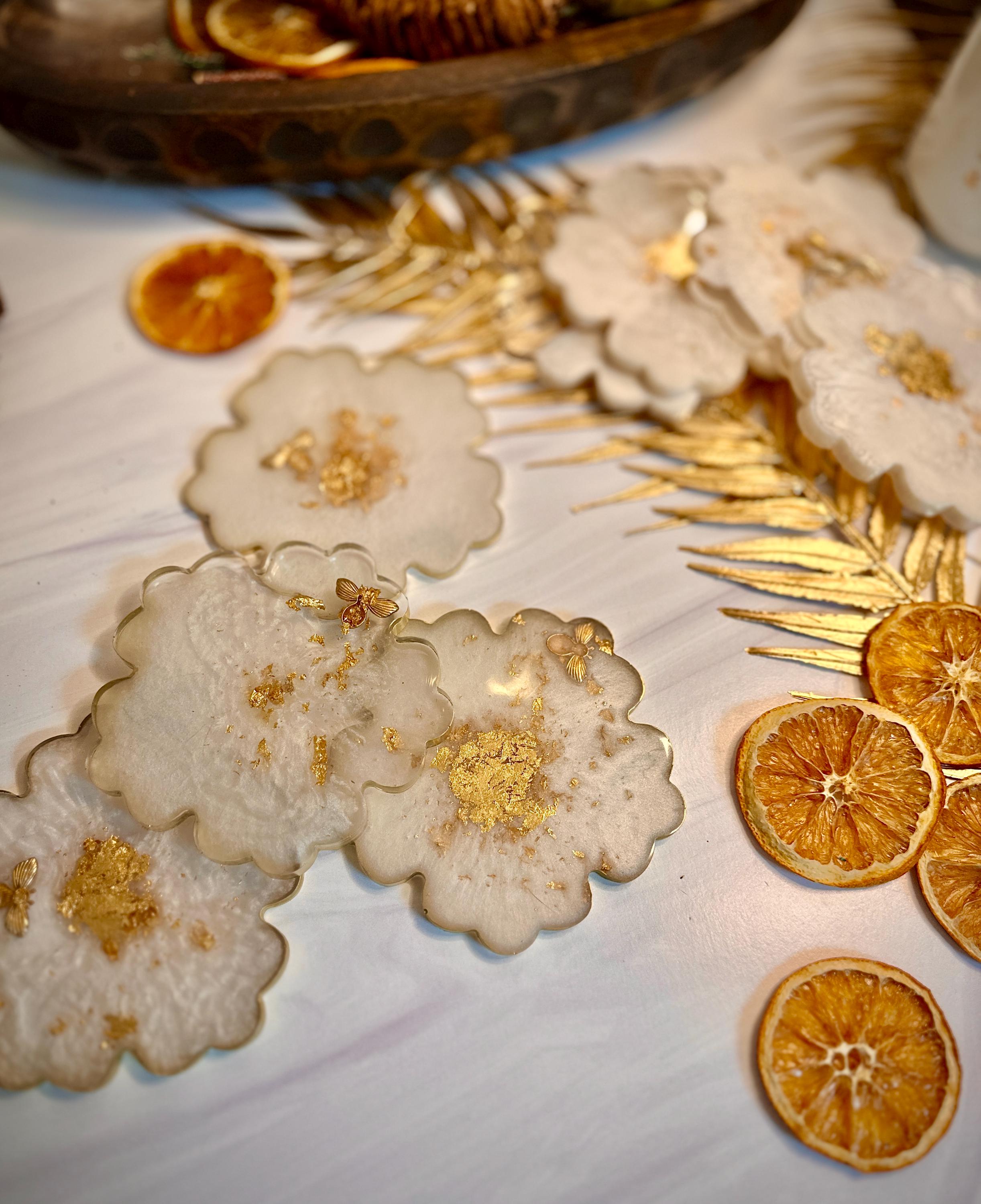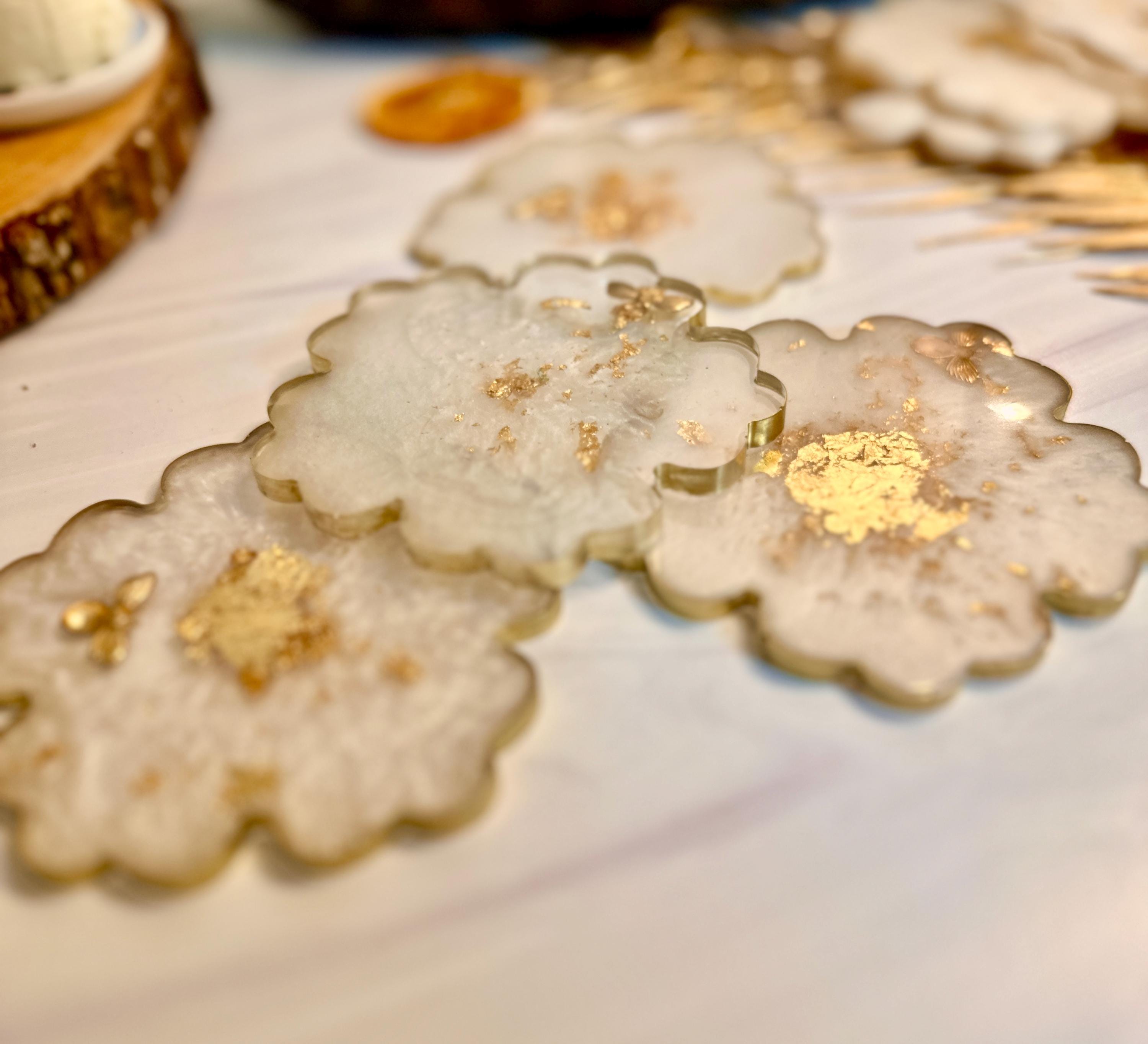 The Art of Shimmering Pearl & Gold Each coaster is meticulously handcrafted with multiple layers of crystal-clear resin, giving them incredible depth and durability. The star of the show is the infusion of the finest white pearl mica powder, creating a mesmerizing, eye-catching shimmery and subtly metallic special effect that dances in the light. No two coasters are exactly alike, ensuring your set is truly one-of-a-kind.