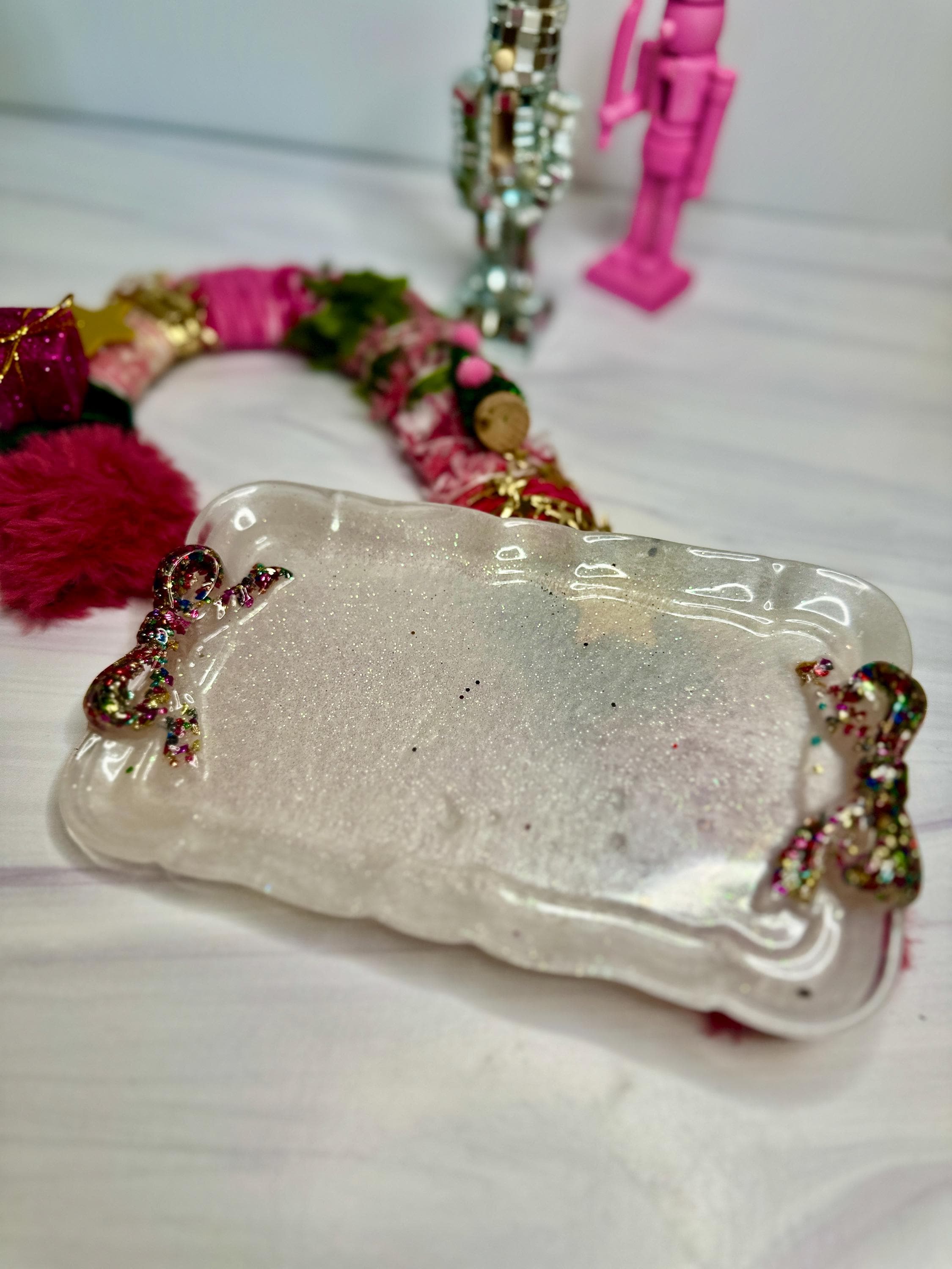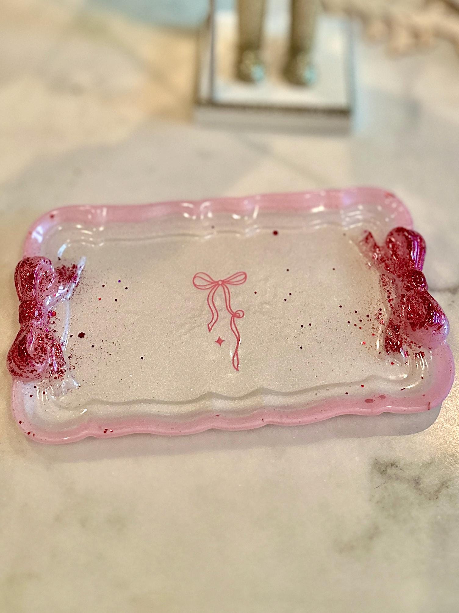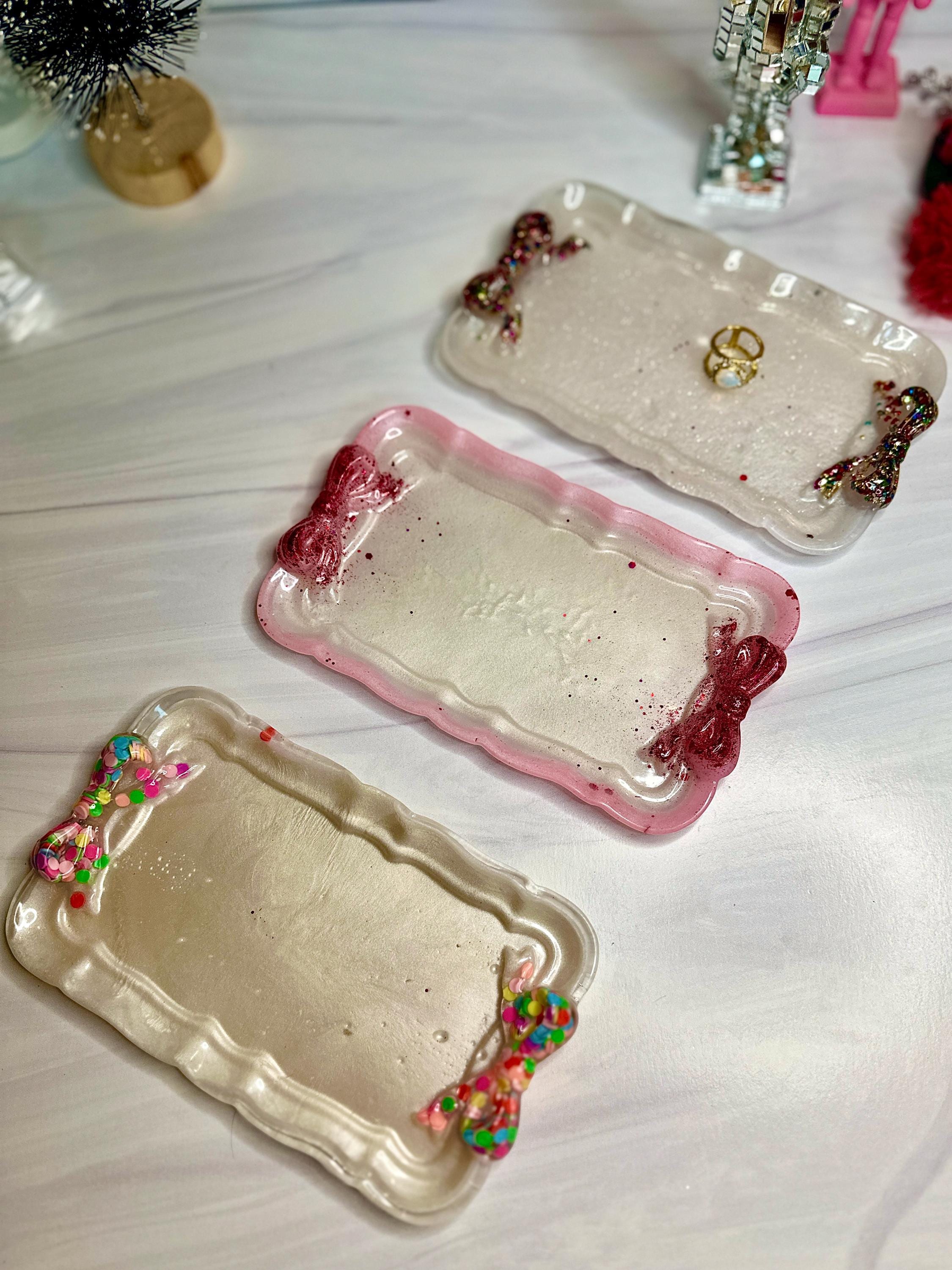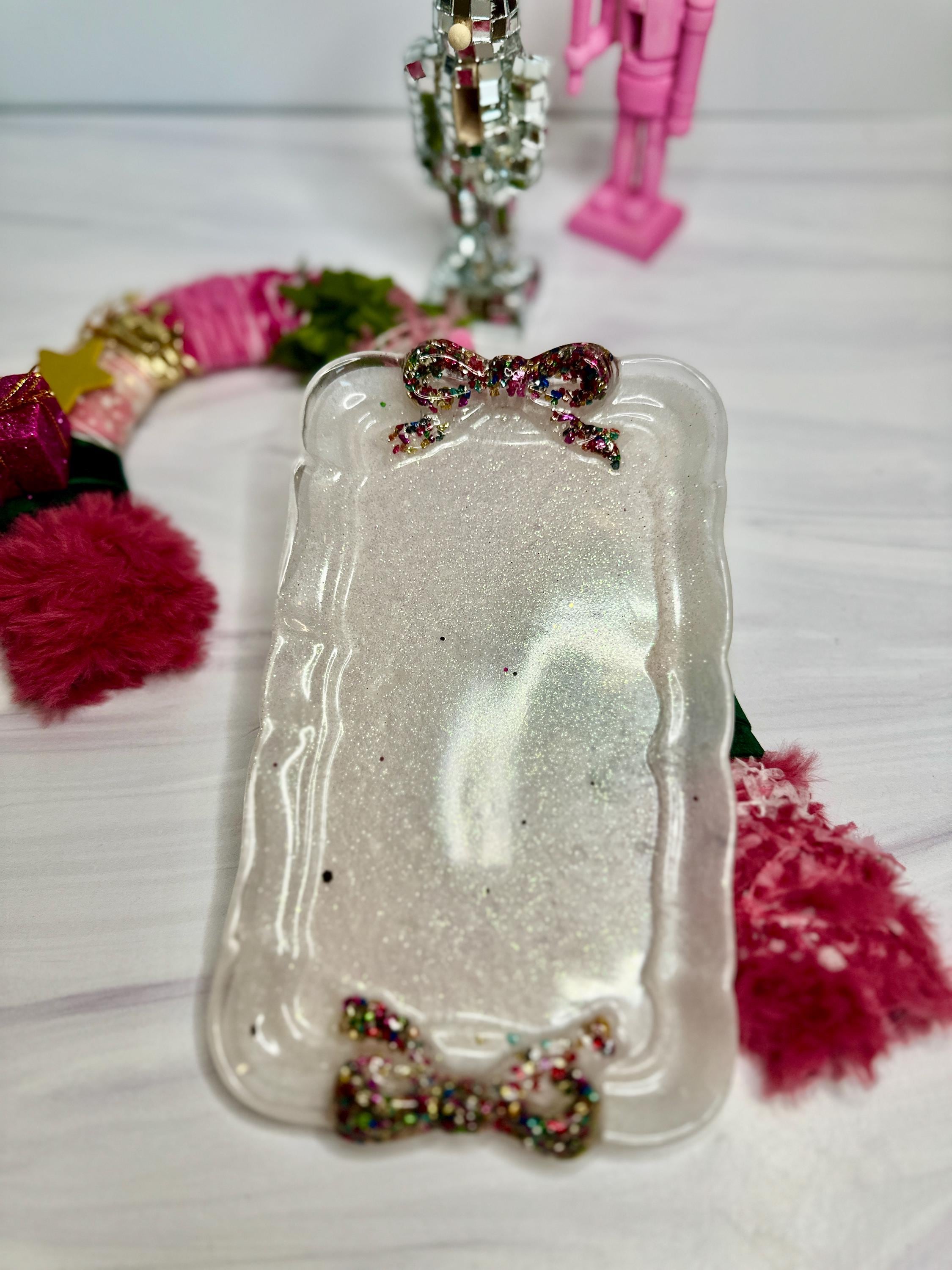 Why You'll Adore This Tray: 🎀 Irresistibly Whimsical Design: A sleek, pearlescent white resin rectangle (7.5" x 4.5") is playfully adorned with two vibrant, custom-decorated resin bows at either end, channeling that sought-after fun, feminine style with personality.