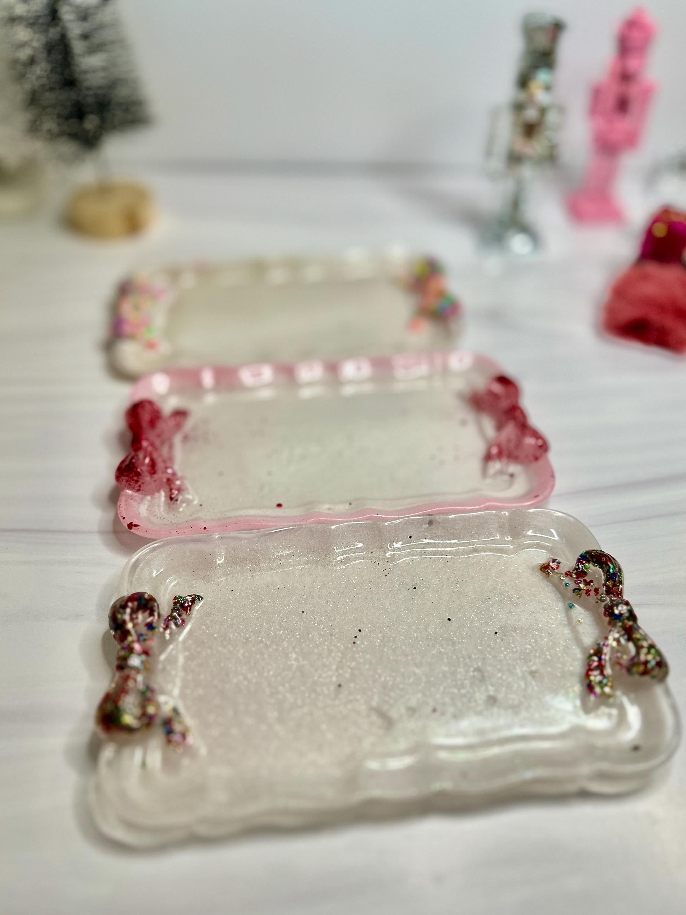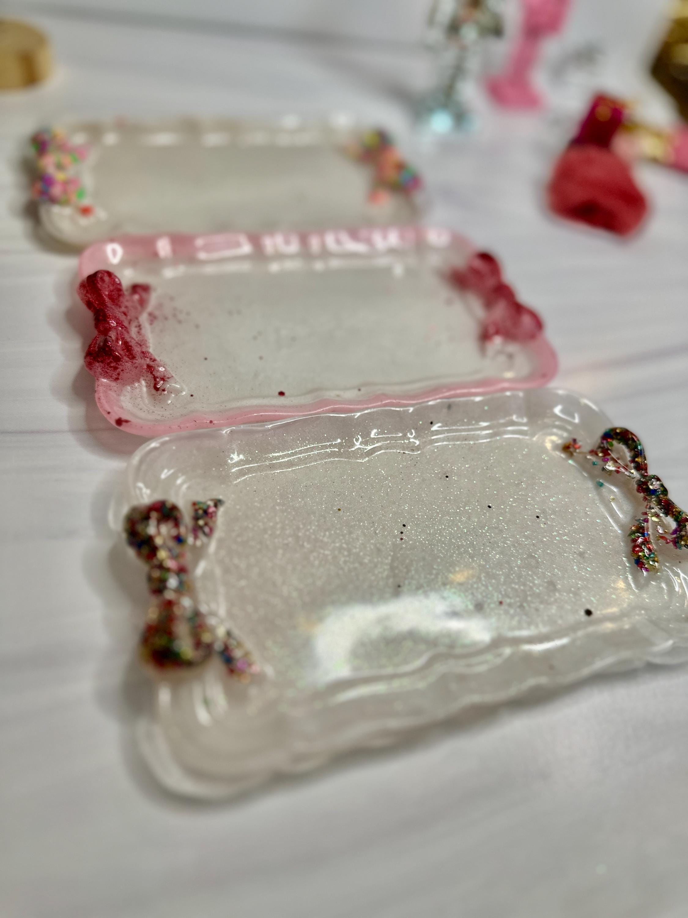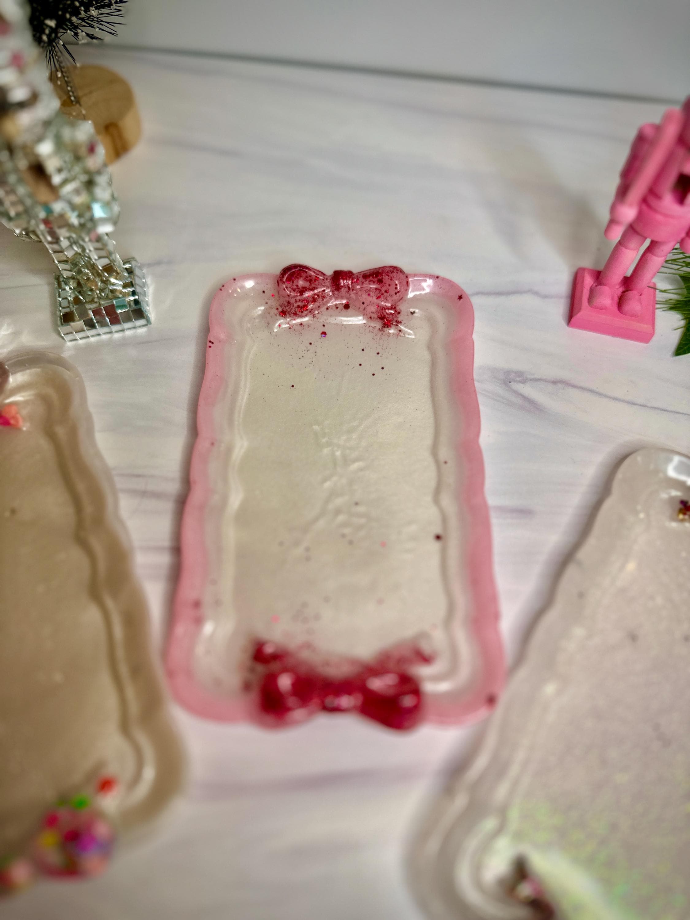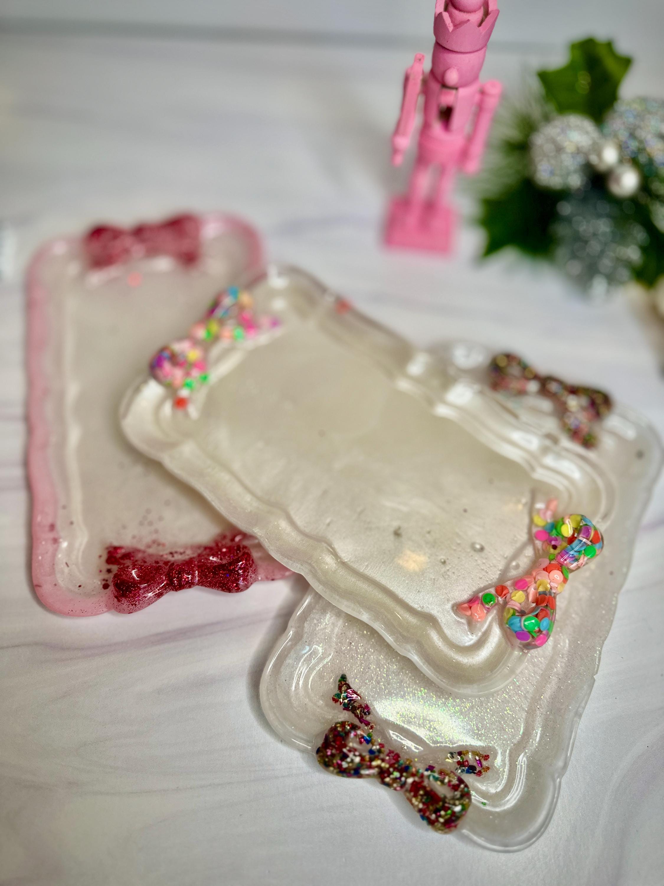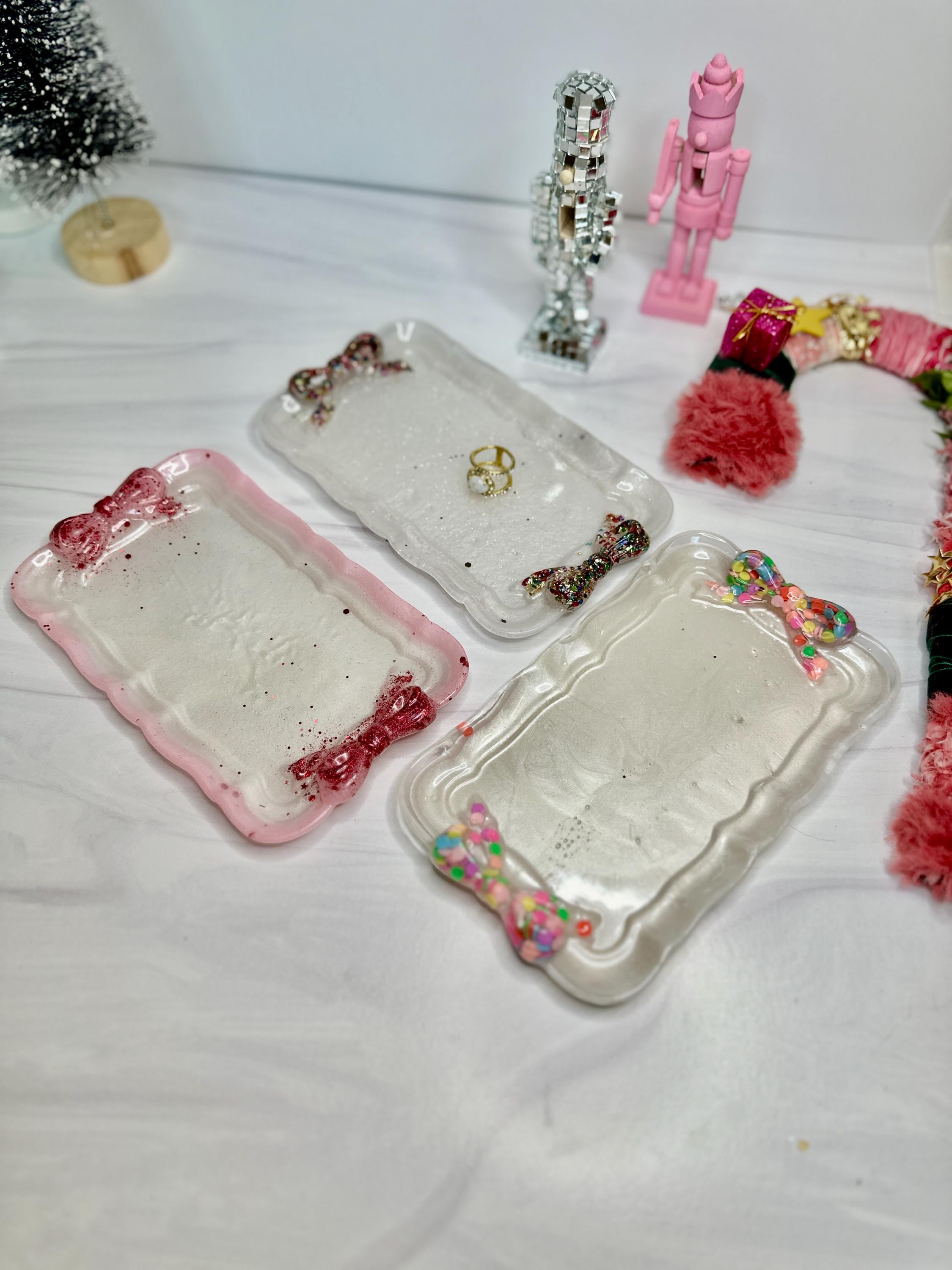 Why You'll Adore This Tray: 🎀 Irresistibly Whimsical Design: A sleek, pearlescent white resin rectangle (7.5" x 4.5") is playfully adorned with two vibrant, custom-decorated resin bows at either end, channeling that sought-after fun, feminine style with personality.