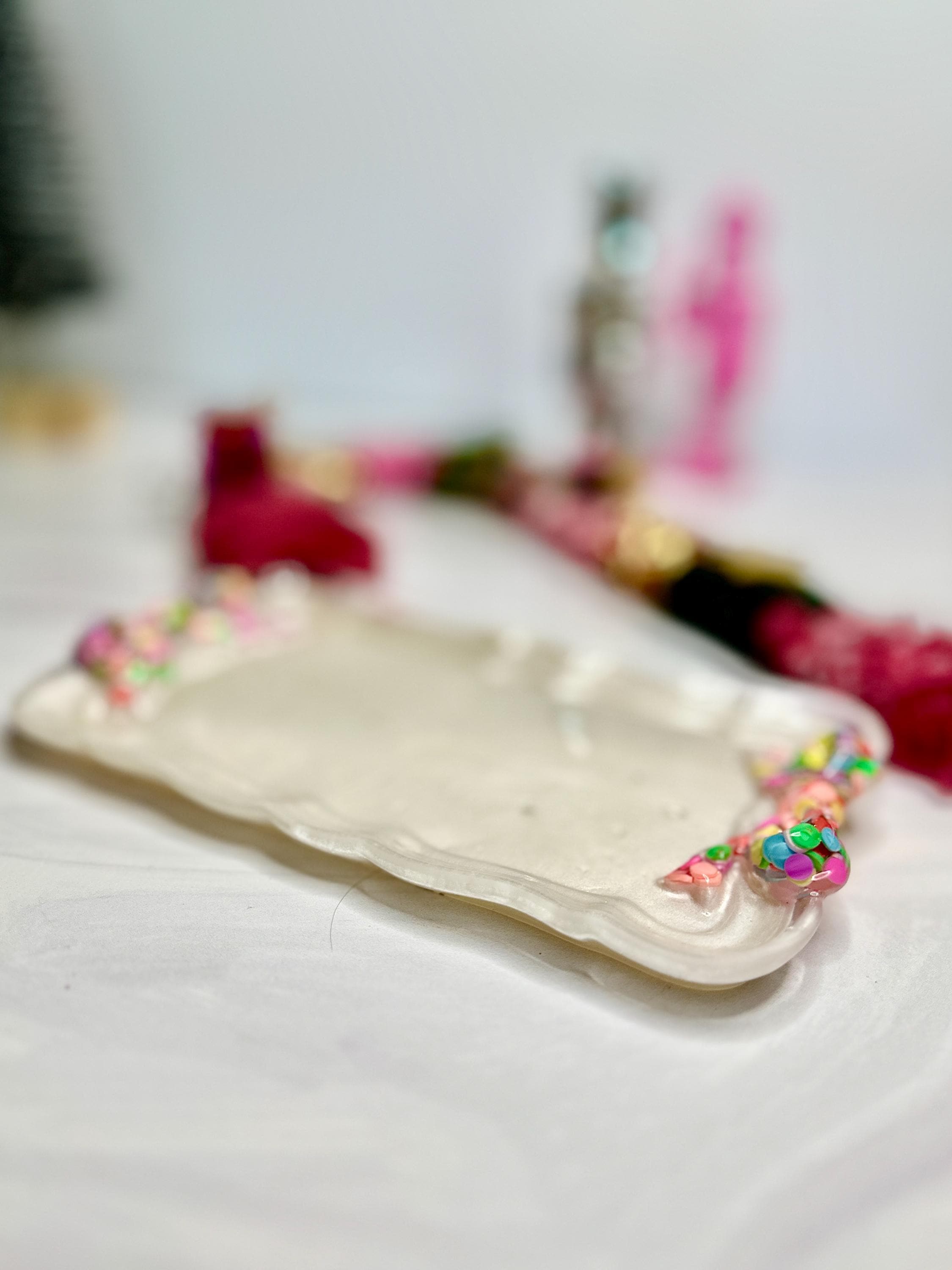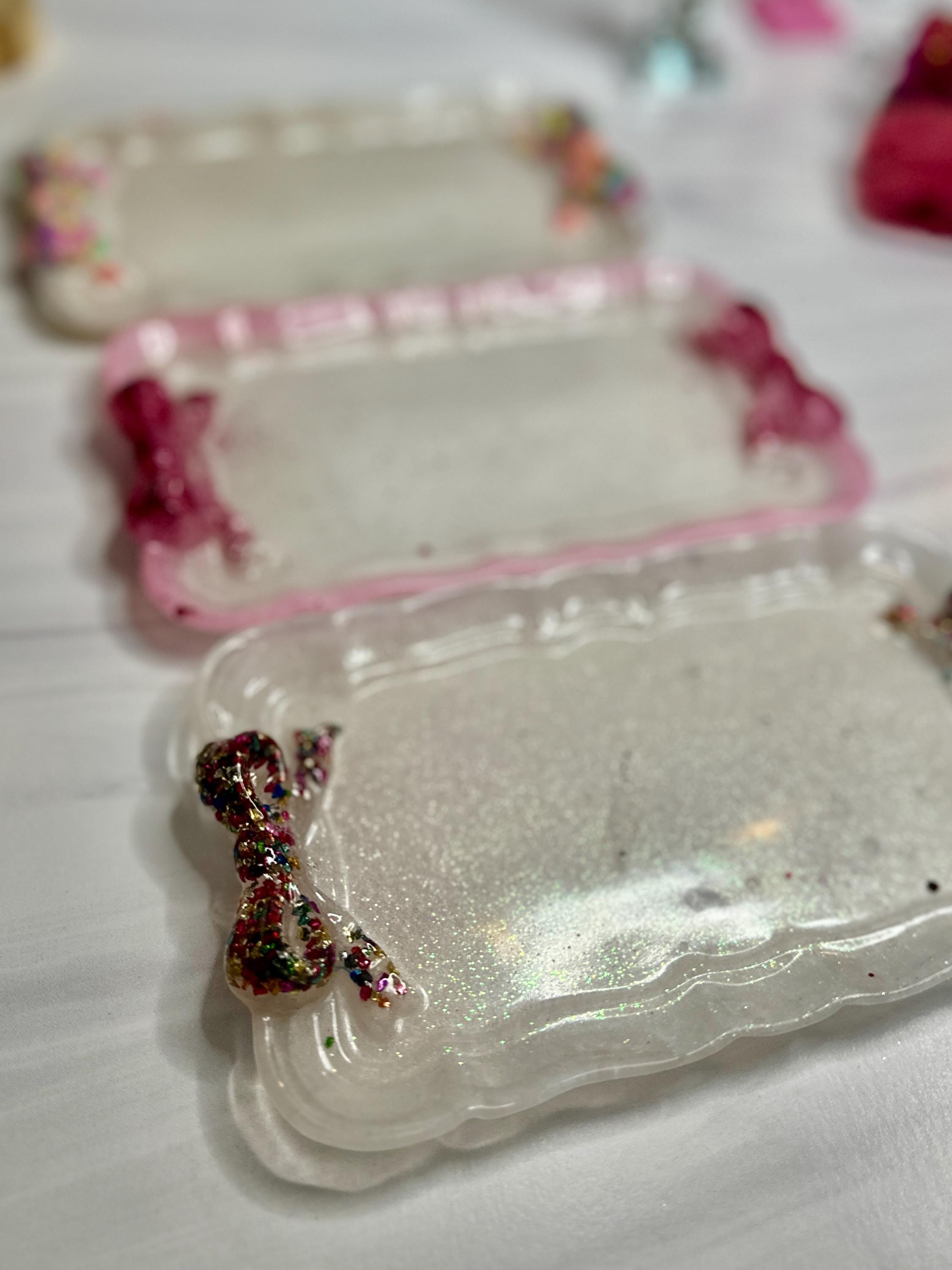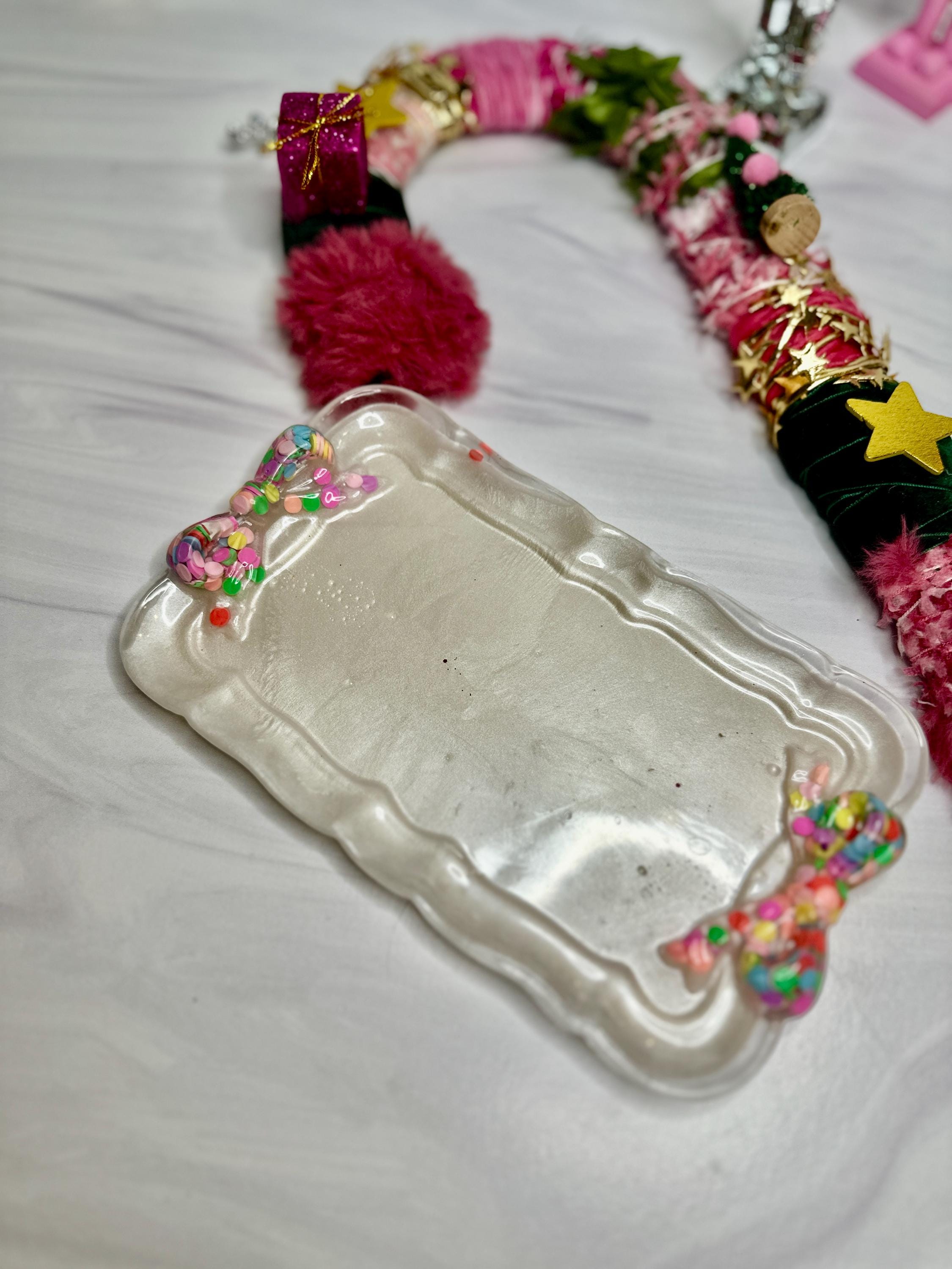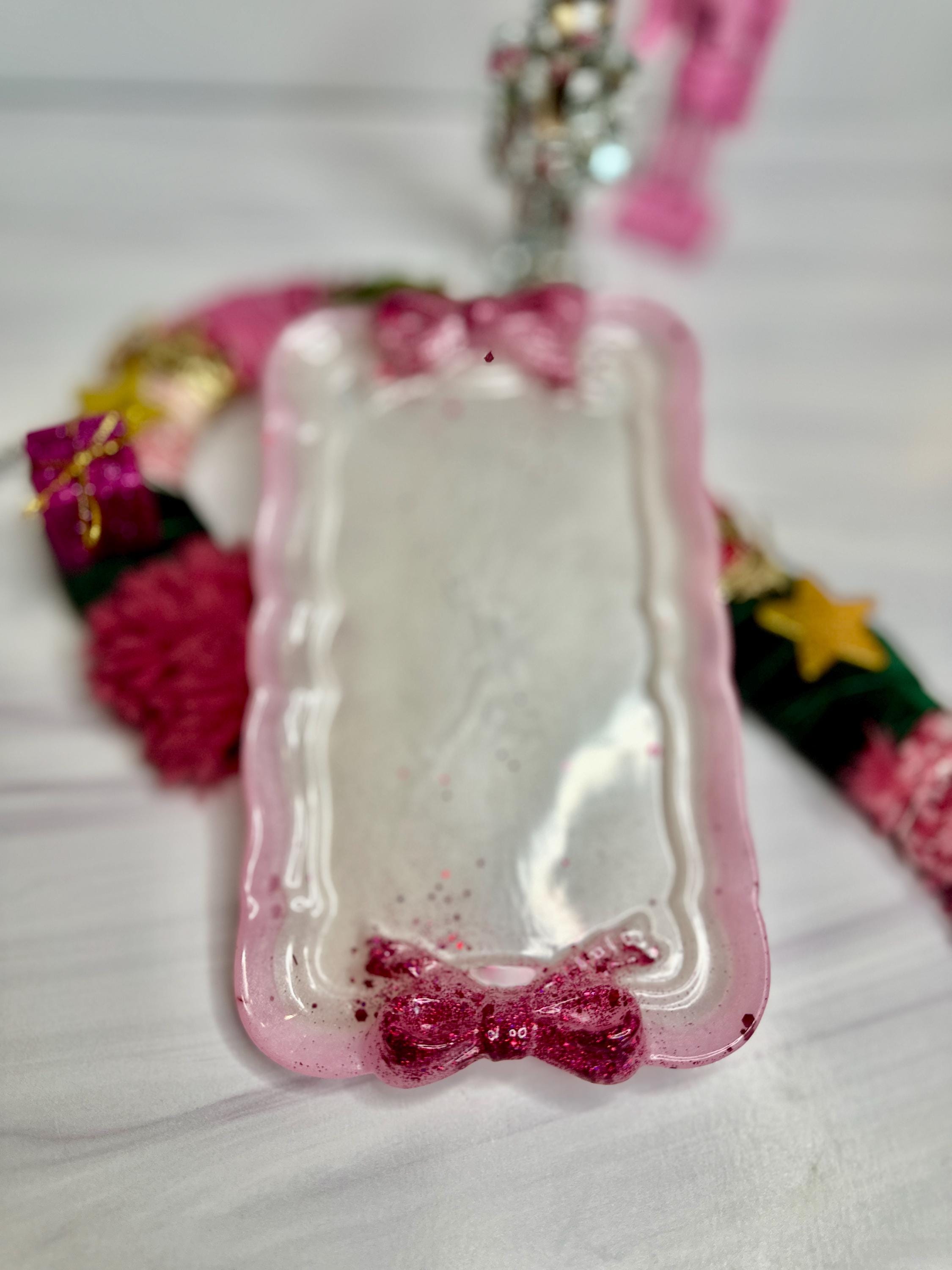 Why You'll Adore This Tray: 🎀 Irresistibly Whimsical Design: A sleek, pearlescent white resin rectangle (7.5" x 4.5") is playfully adorned with two vibrant, custom-decorated resin bows at either end, channeling that sought-after fun, feminine style with personality.